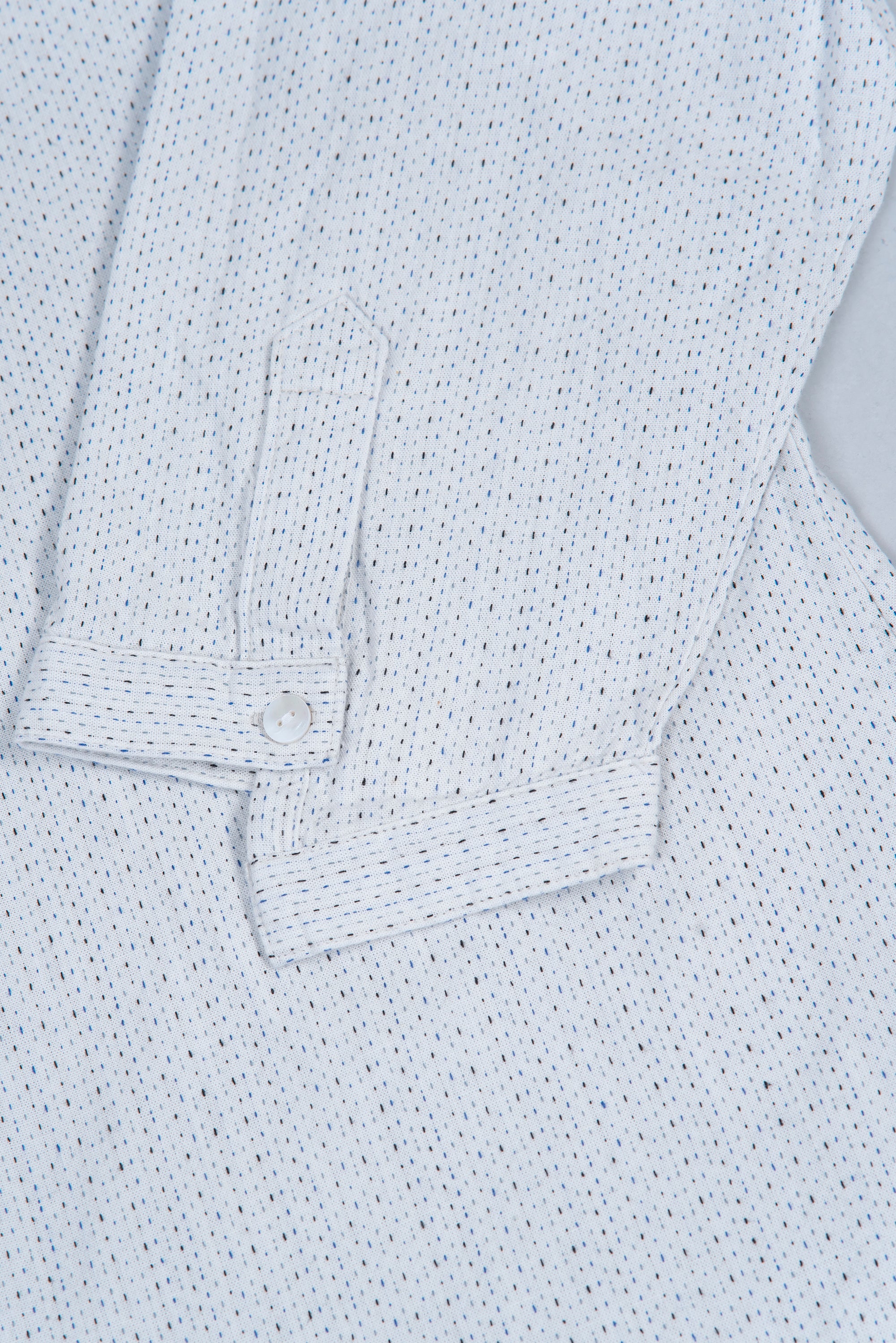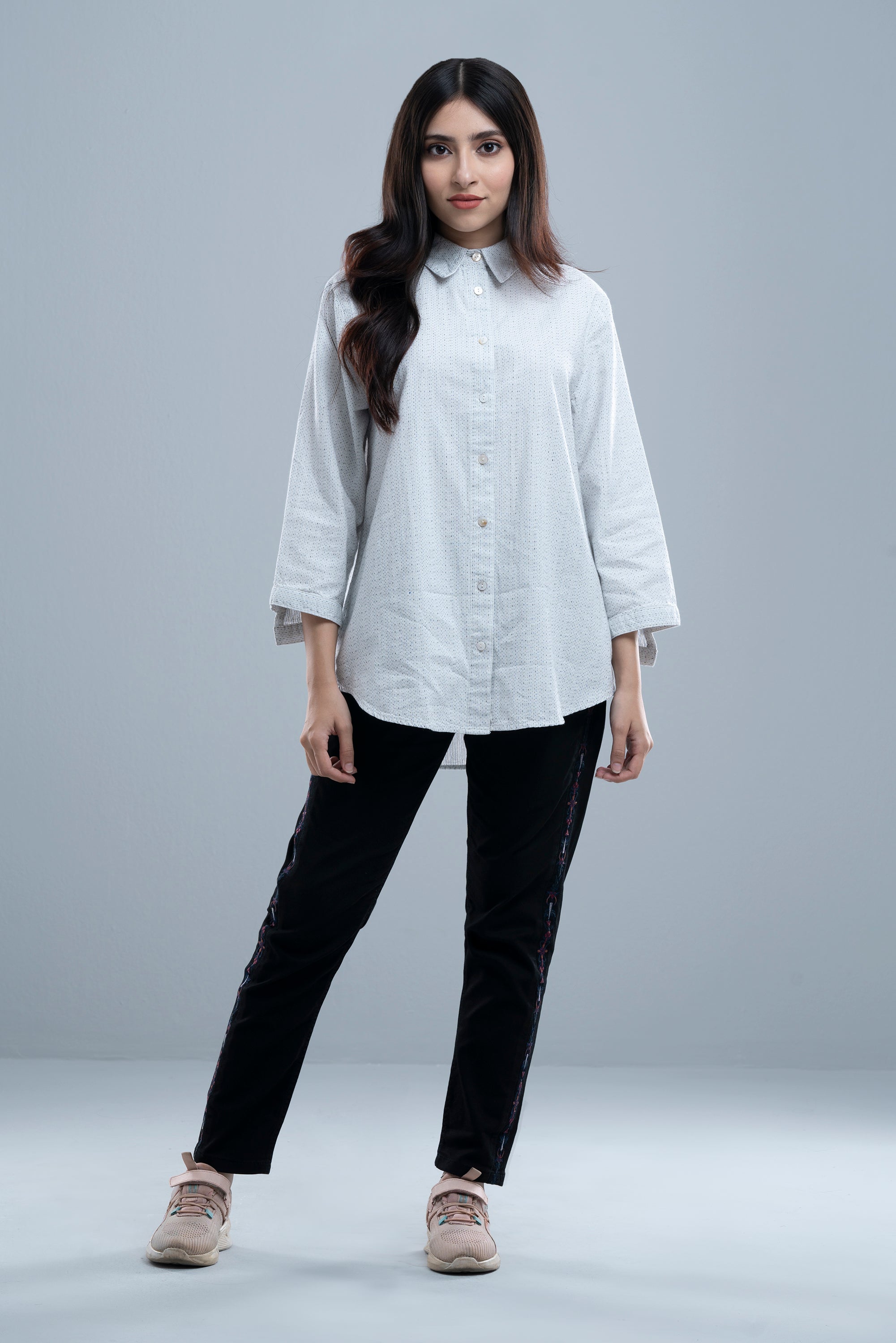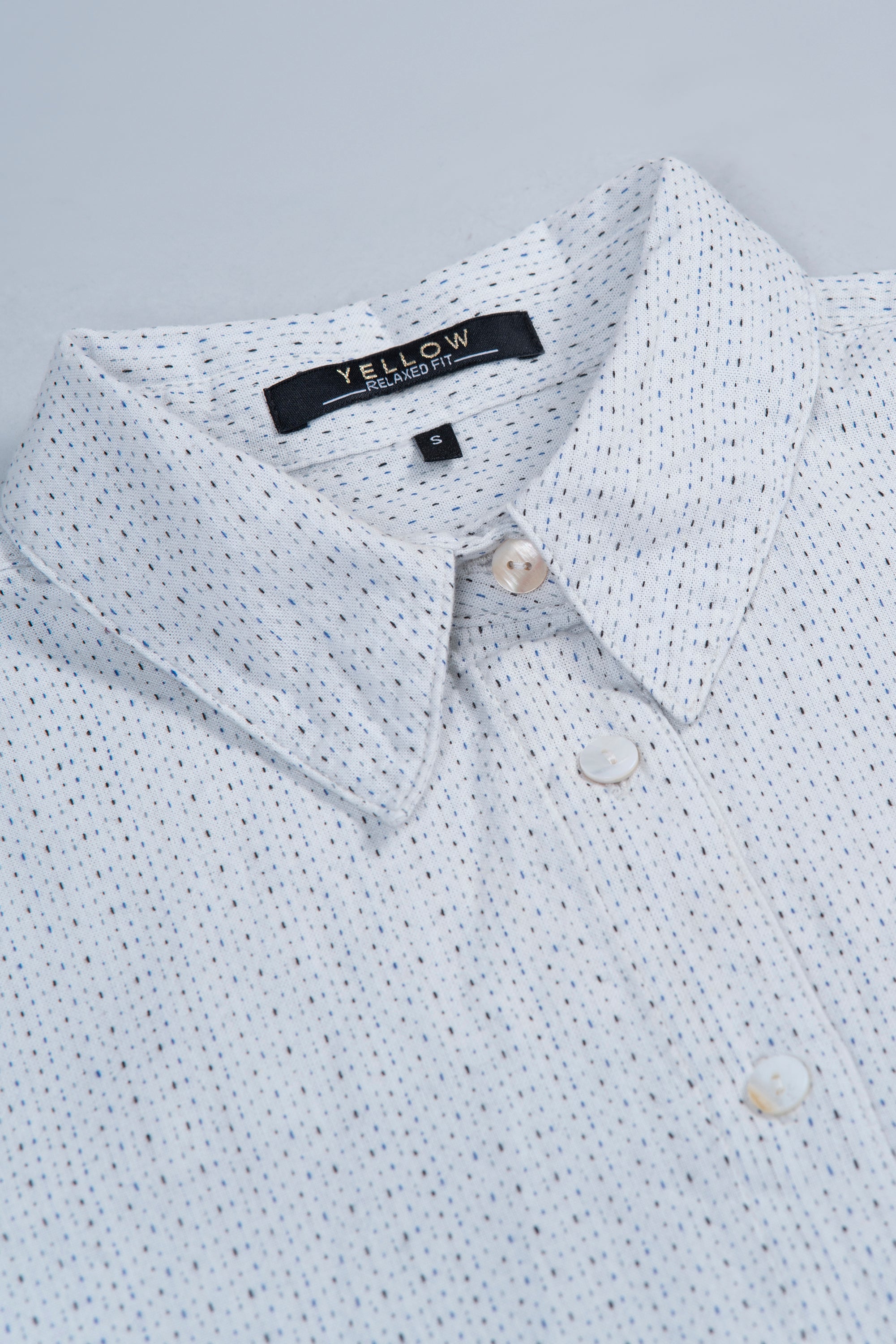 Women’s casual shirt with placement print, crafted from soft remi-cotton fabric. Designed with an extended collar, half placket featuring shell buttons, drop shoulder, and a rounded hem for a relaxed yet stylish appeal.