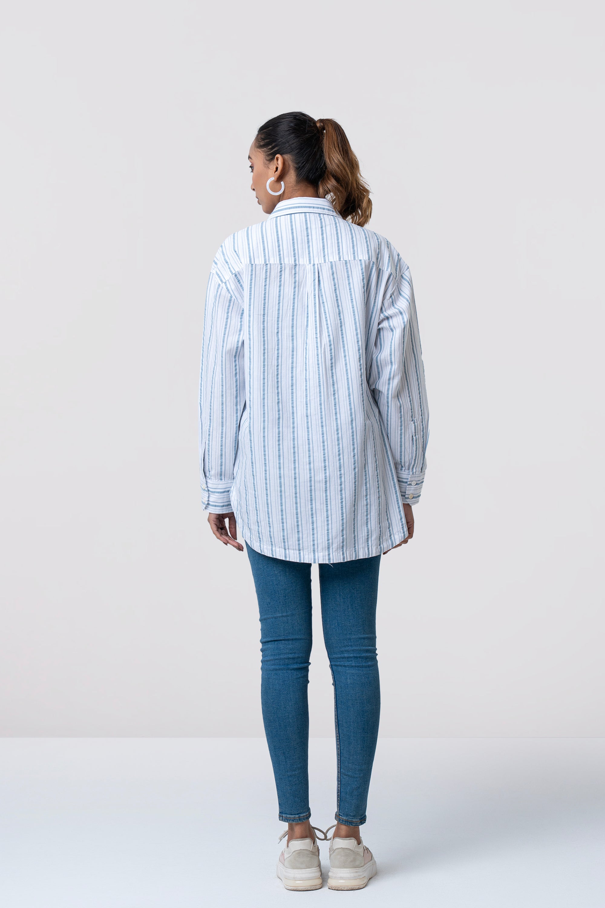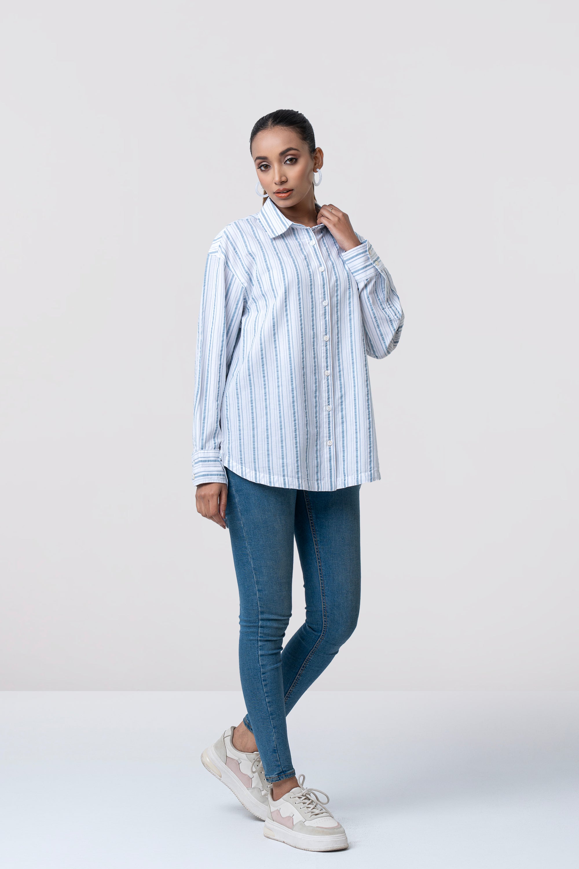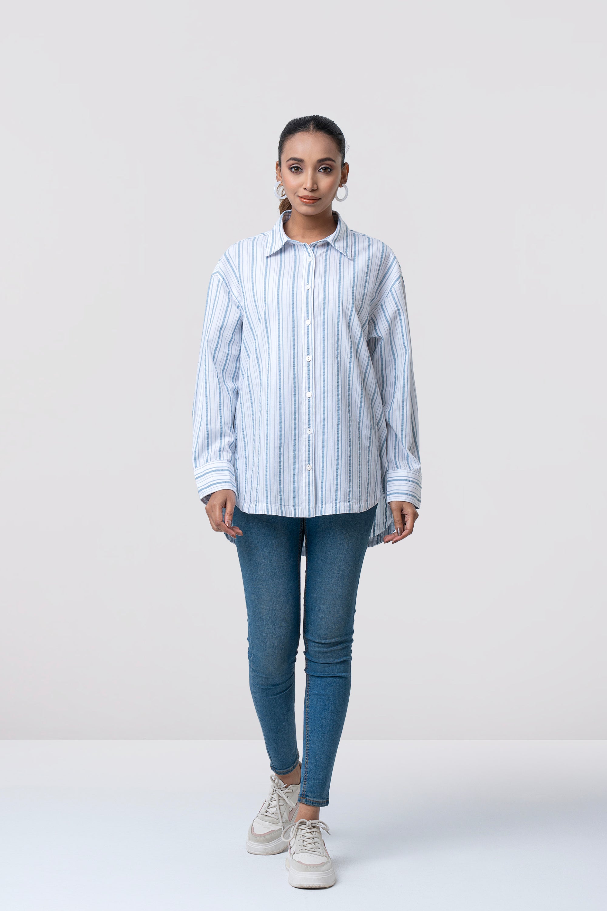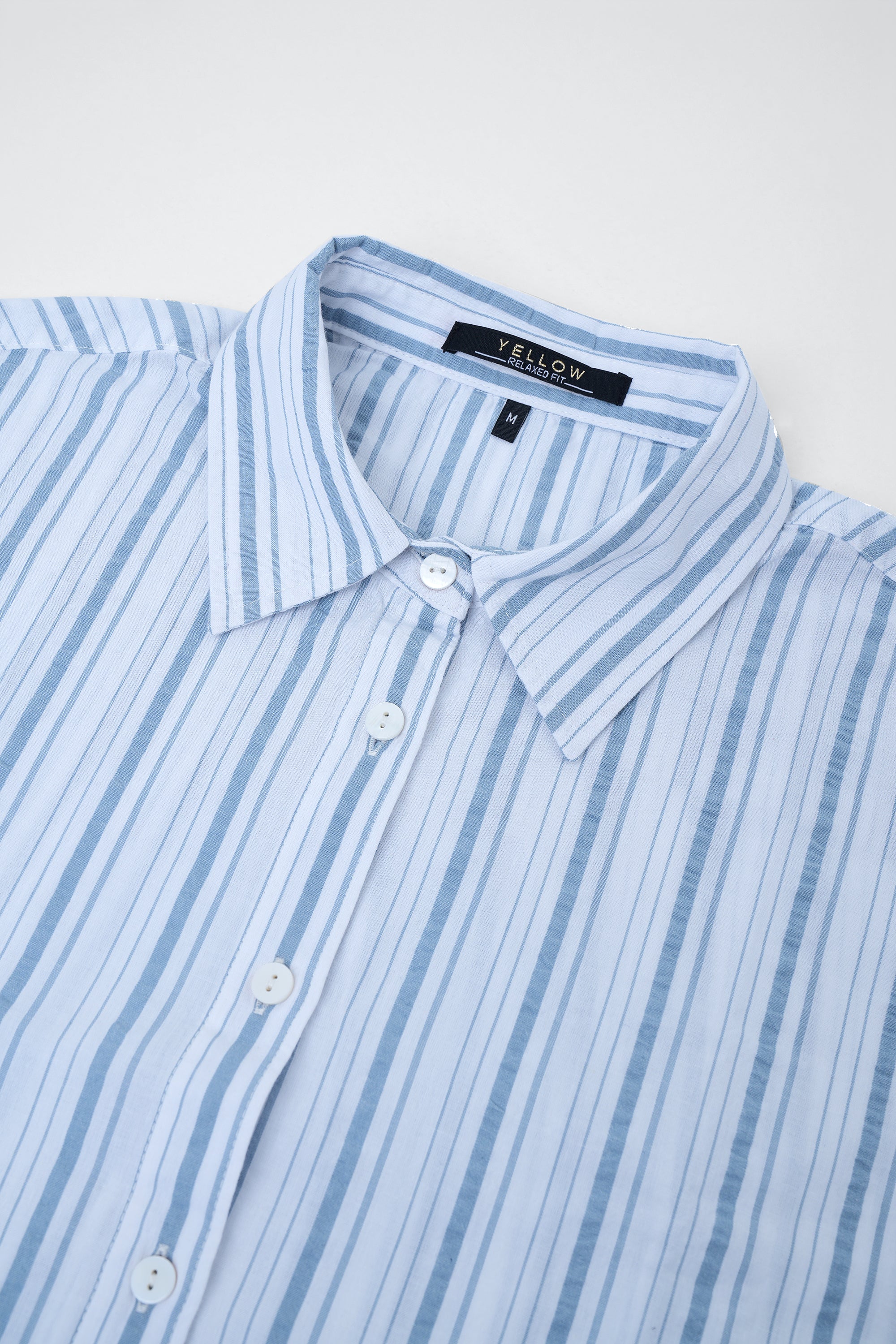 Striped women's casual shirt is designed with a relaxed fit for effortless comfort and everyday style. Made from 100% cotton fabric, it offers a soft and breathable feel. Shell button fastening adds a subtle refined touch, while the rounded hem allows versatile styling. A box pleat at the back yoke enhances ease of movement, making it a perfect choice for casual wear.