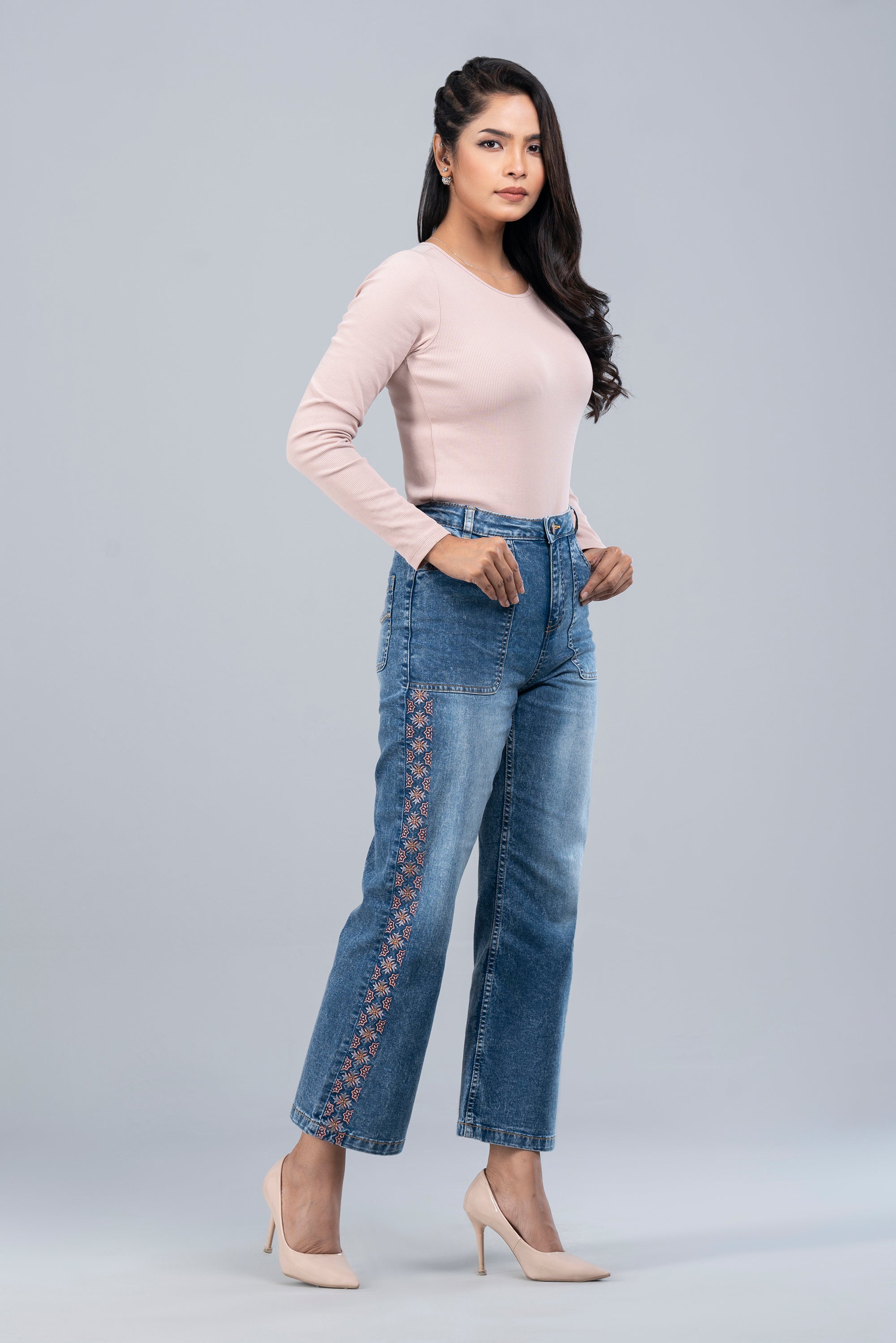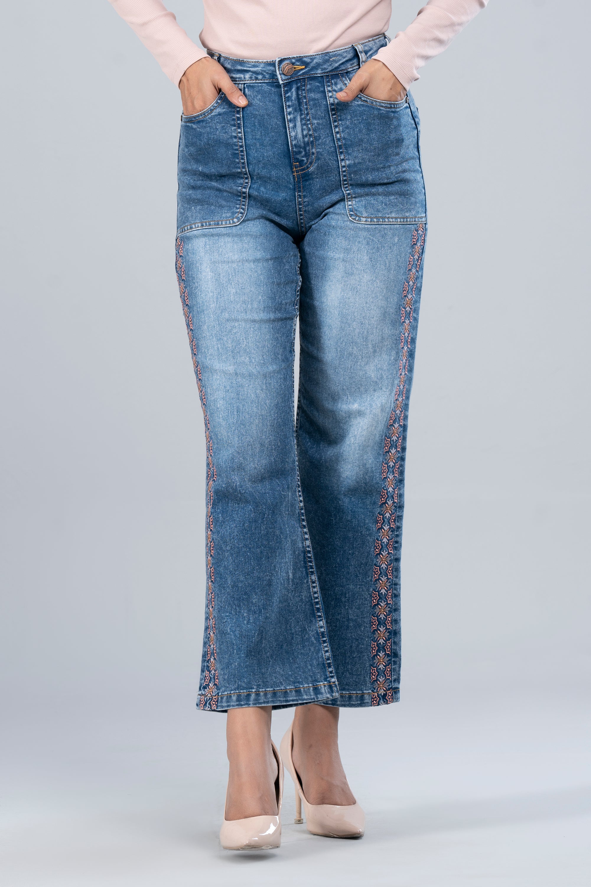 This stylish wide-leg denim pant offers the perfect blend of comfort and elegance. Crafted from a premium cotton, polyester, and spandex blend, it provides a soft feel with just the right amount of stretch for all-day ease. The mid-wash finish adds a timeless, versatile look, making it a perfect wardrobe staple. Delicate embroidery along the side seam enhances the design with a subtle yet sophisticated touch, elevating your casual and chic outfits effortlessly.