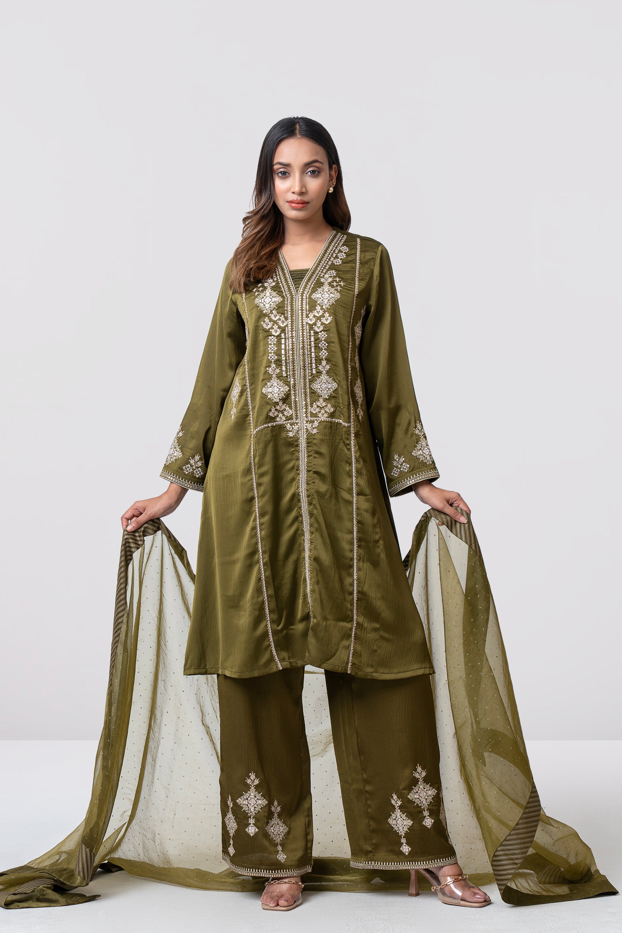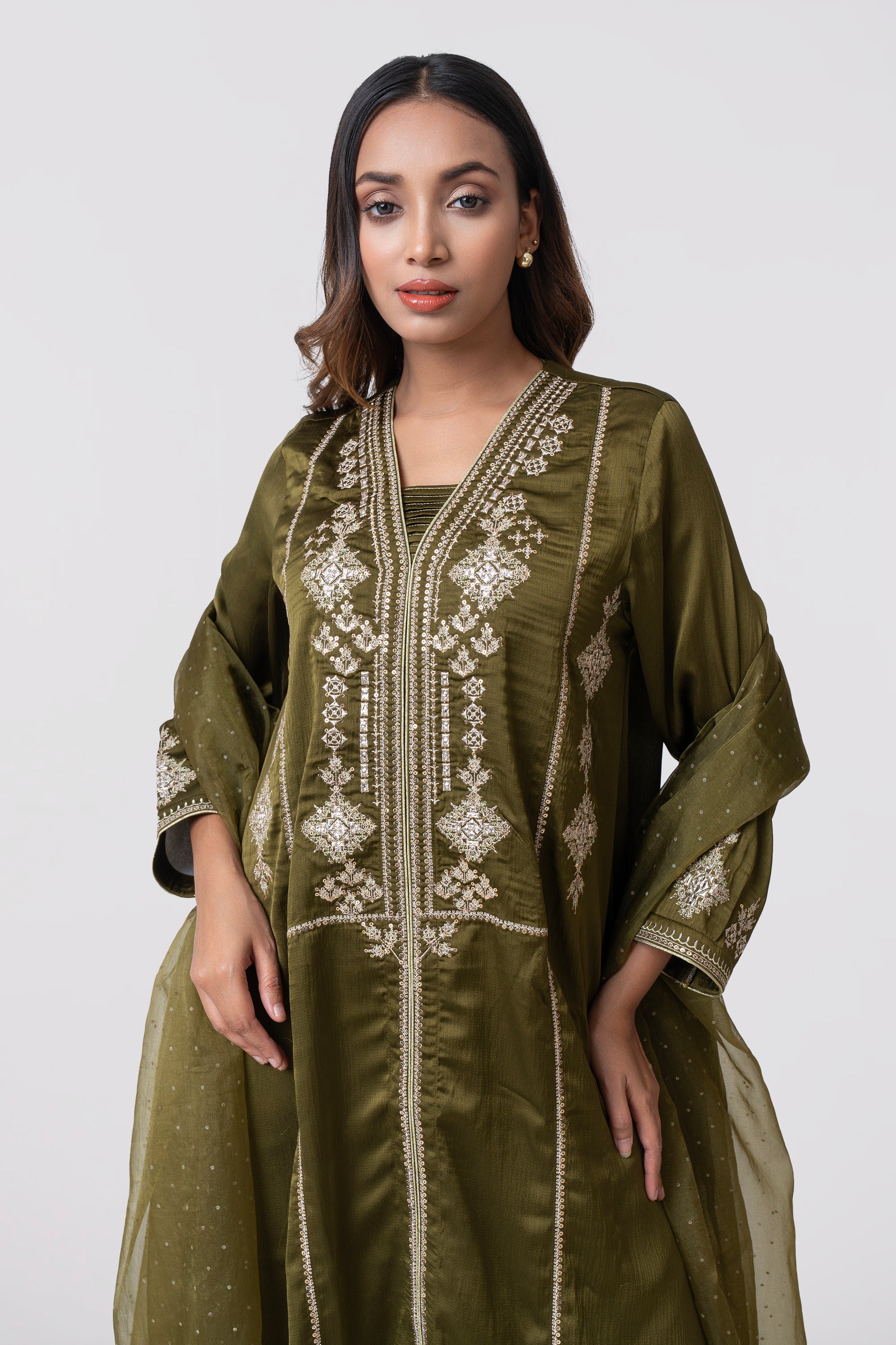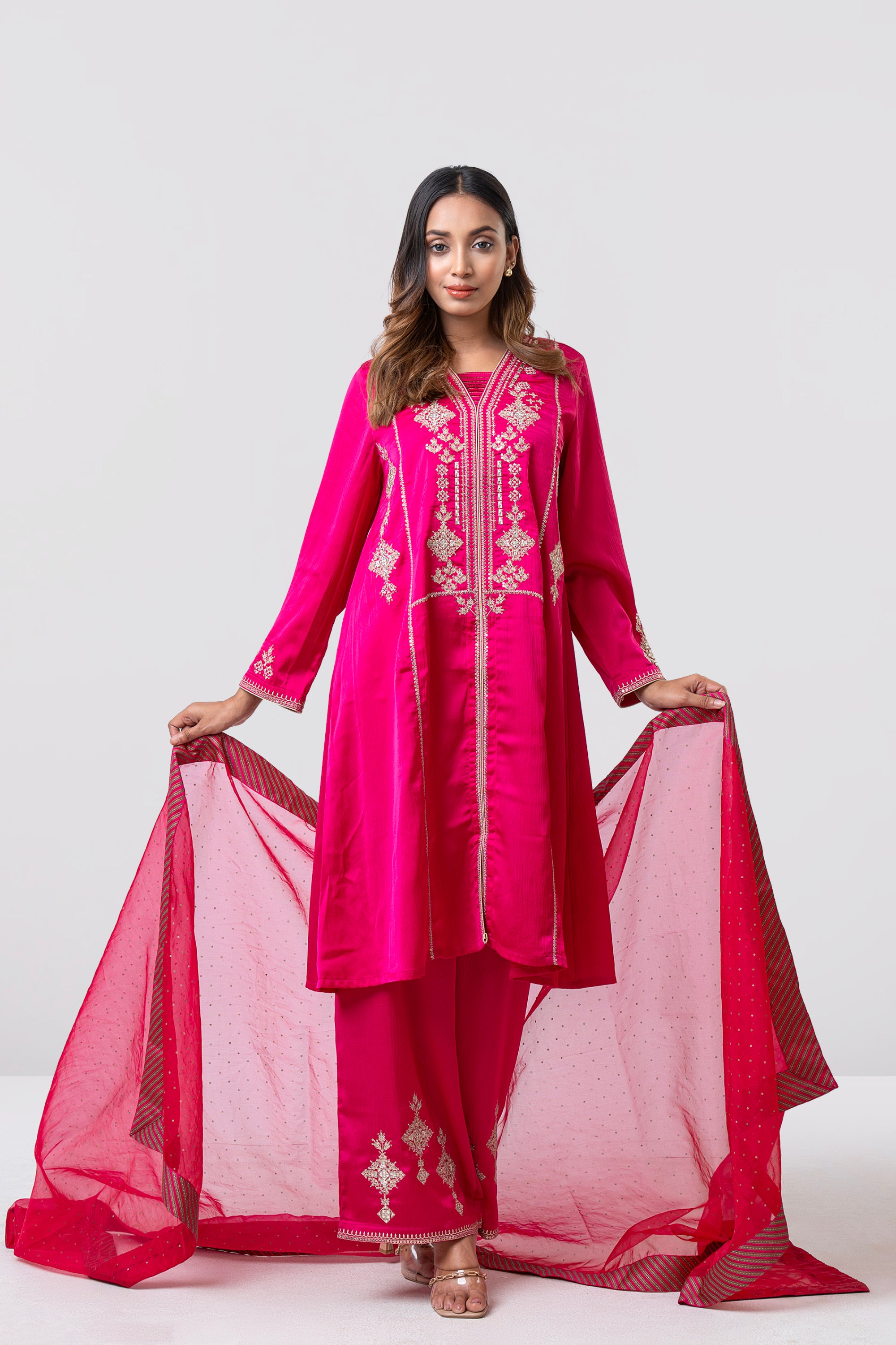 Ready to wear three piece Formal set with metallic printed organza dupatta.