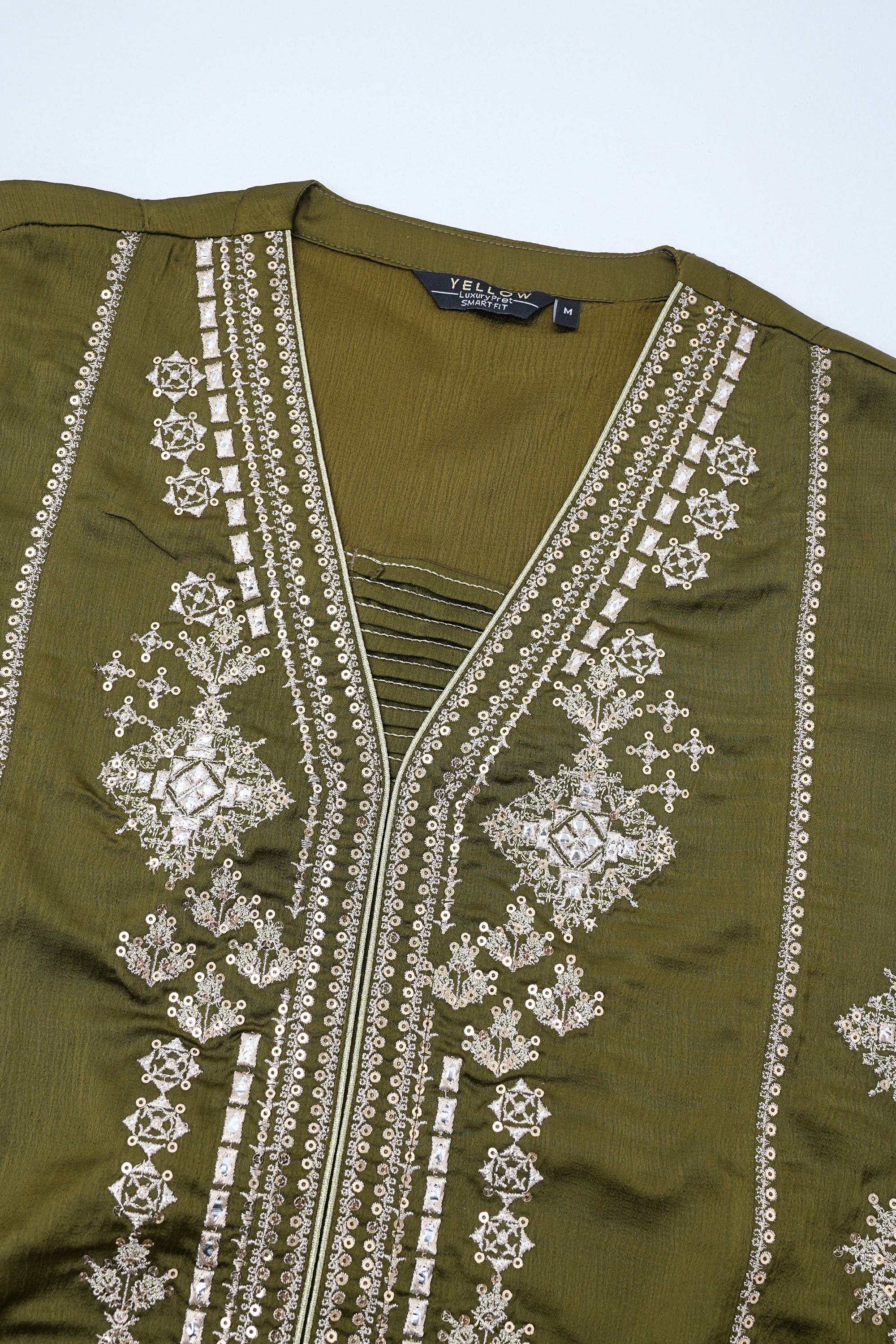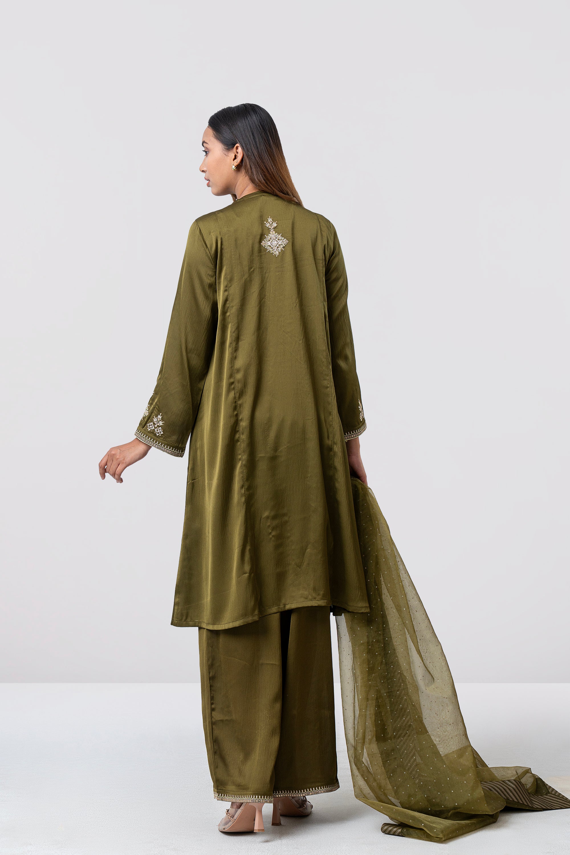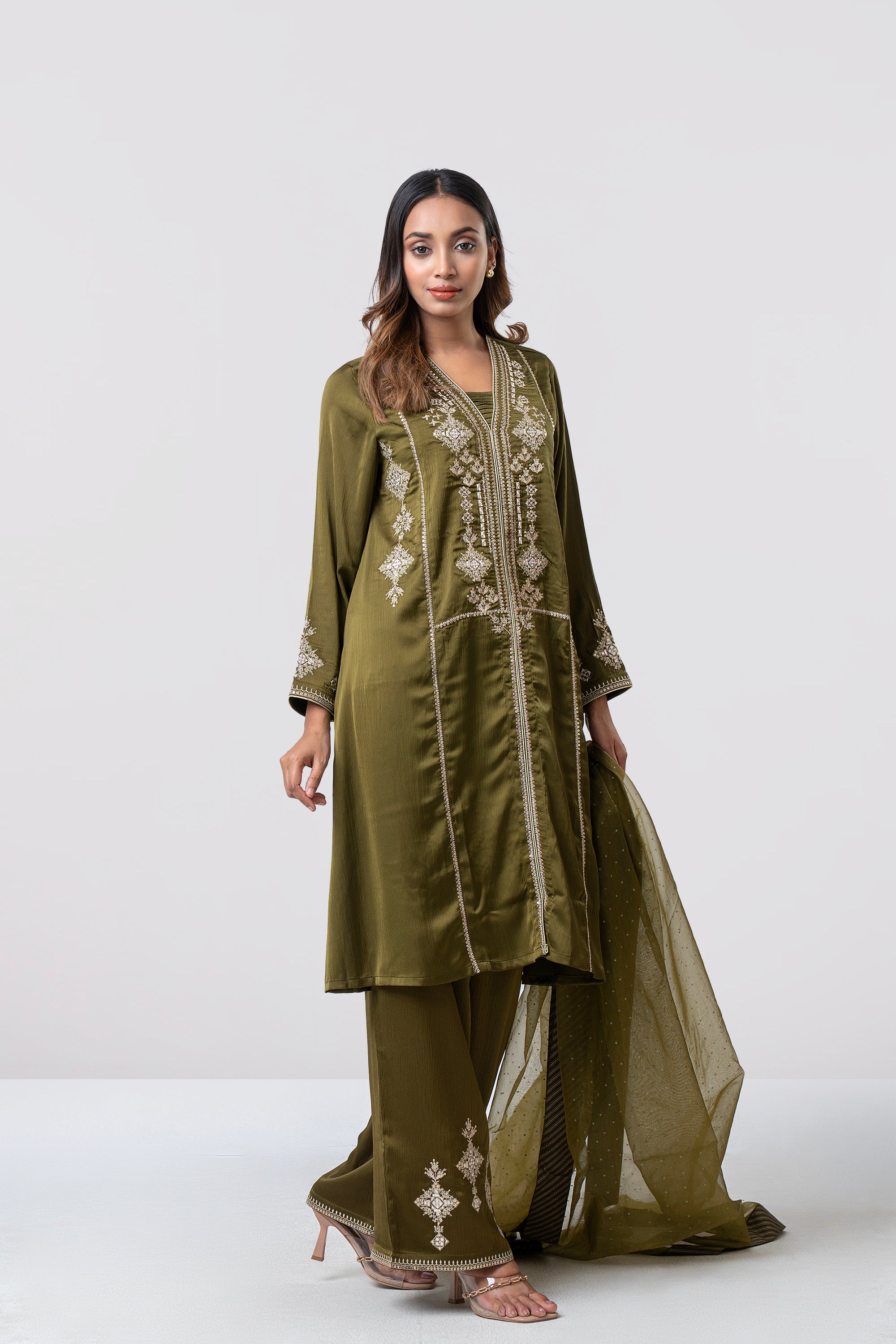 Ready to wear three piece Formal set with metallic printed organza dupatta.