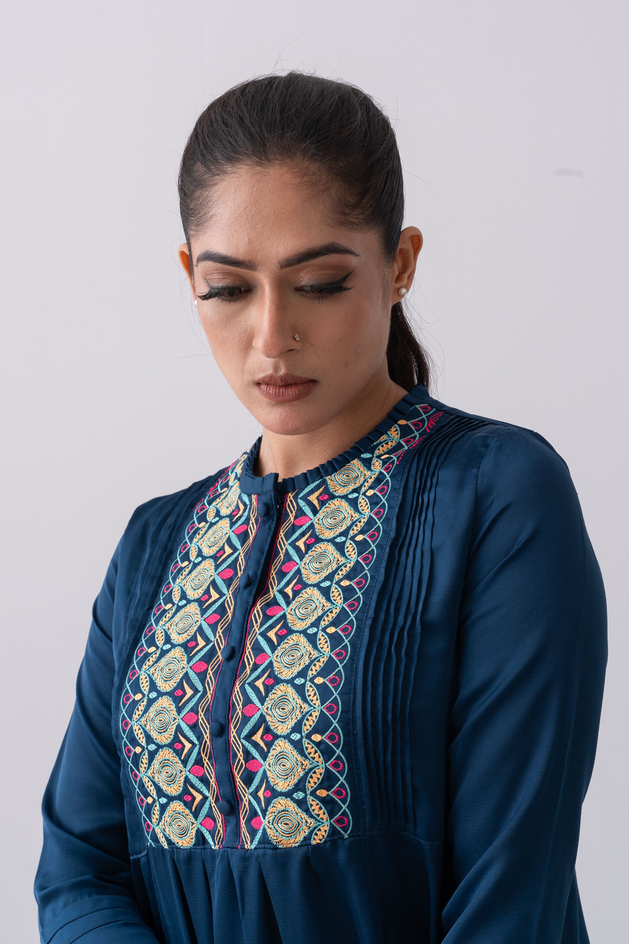 • Embroidered yoke and added pleats