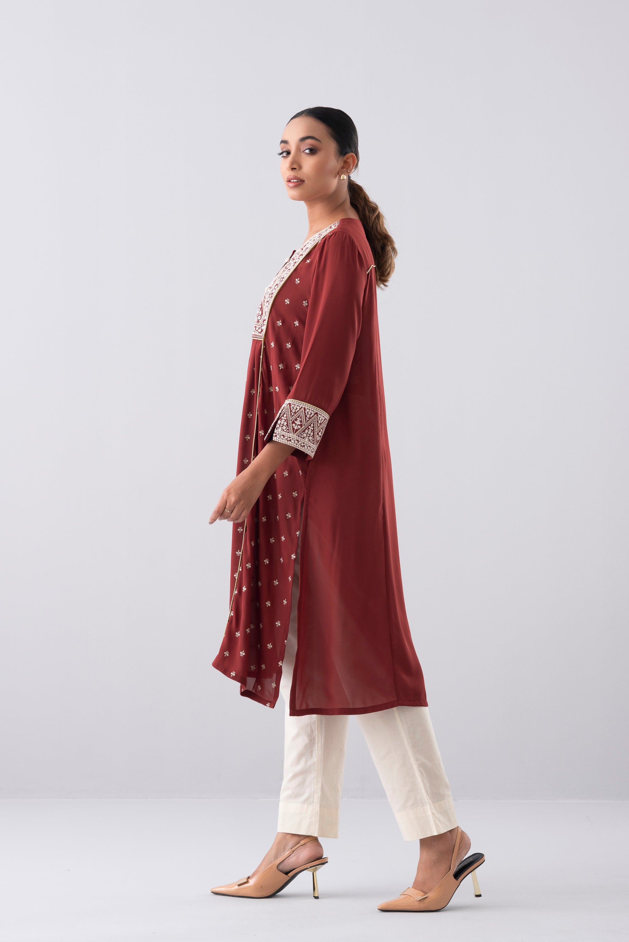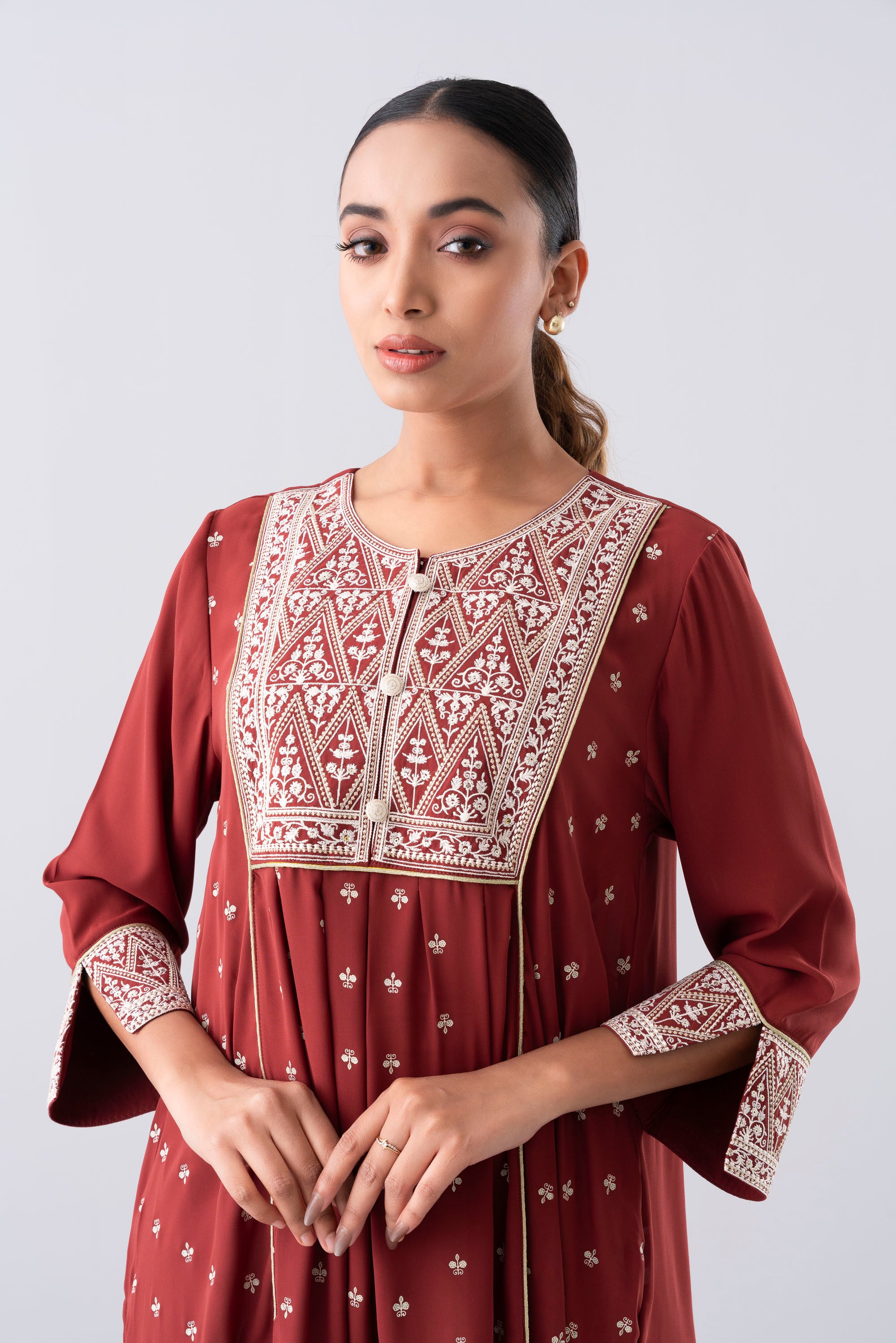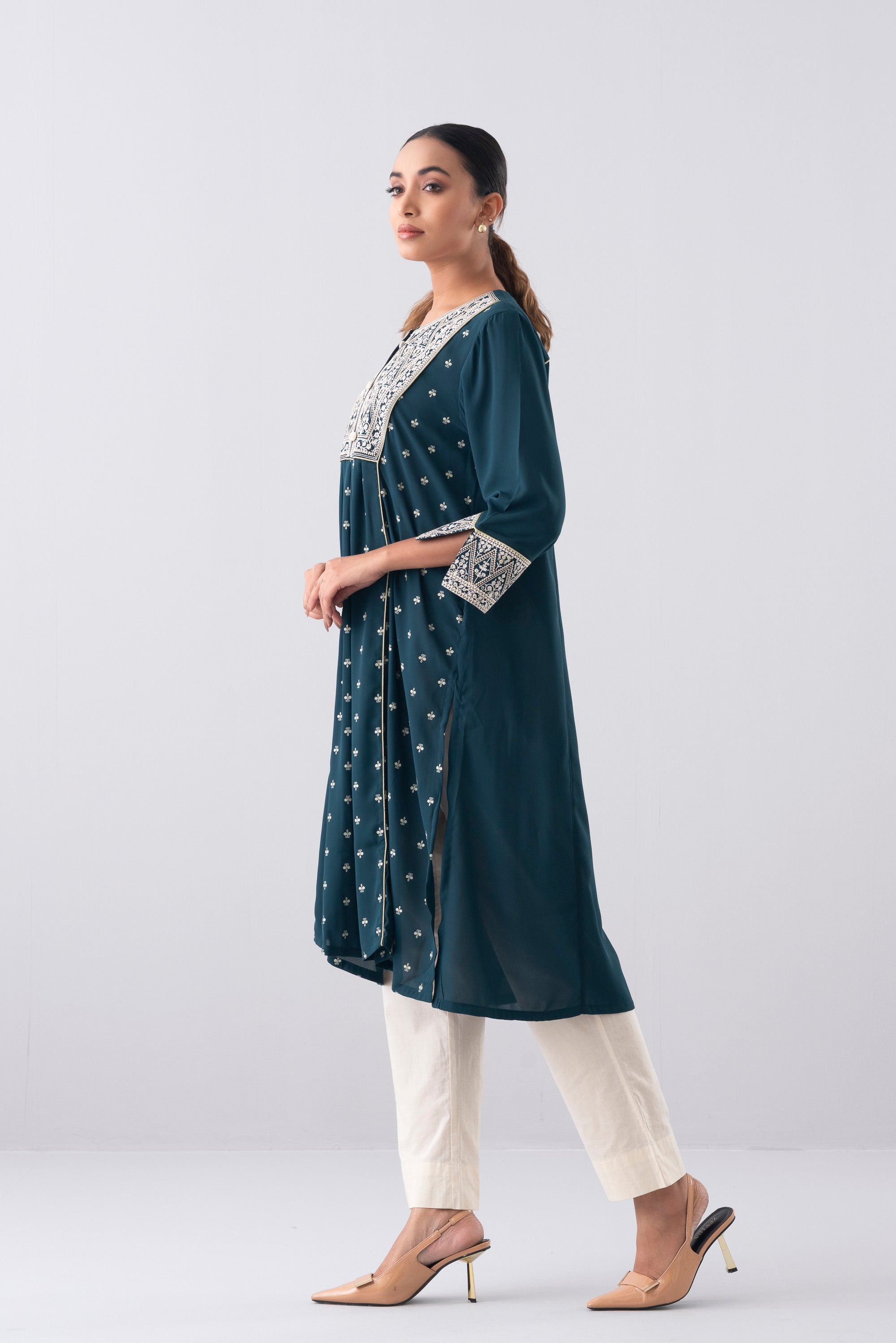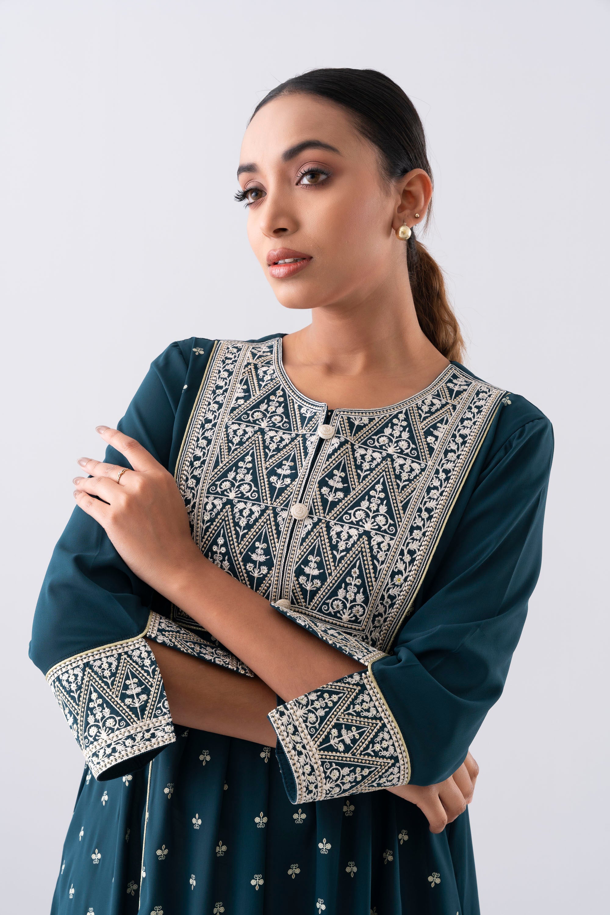 A smart-fit, One-piece straight long dress/formal kurta-style dress. It's easy to wear Formal events, office wear, semi-festive, evening gatherings.