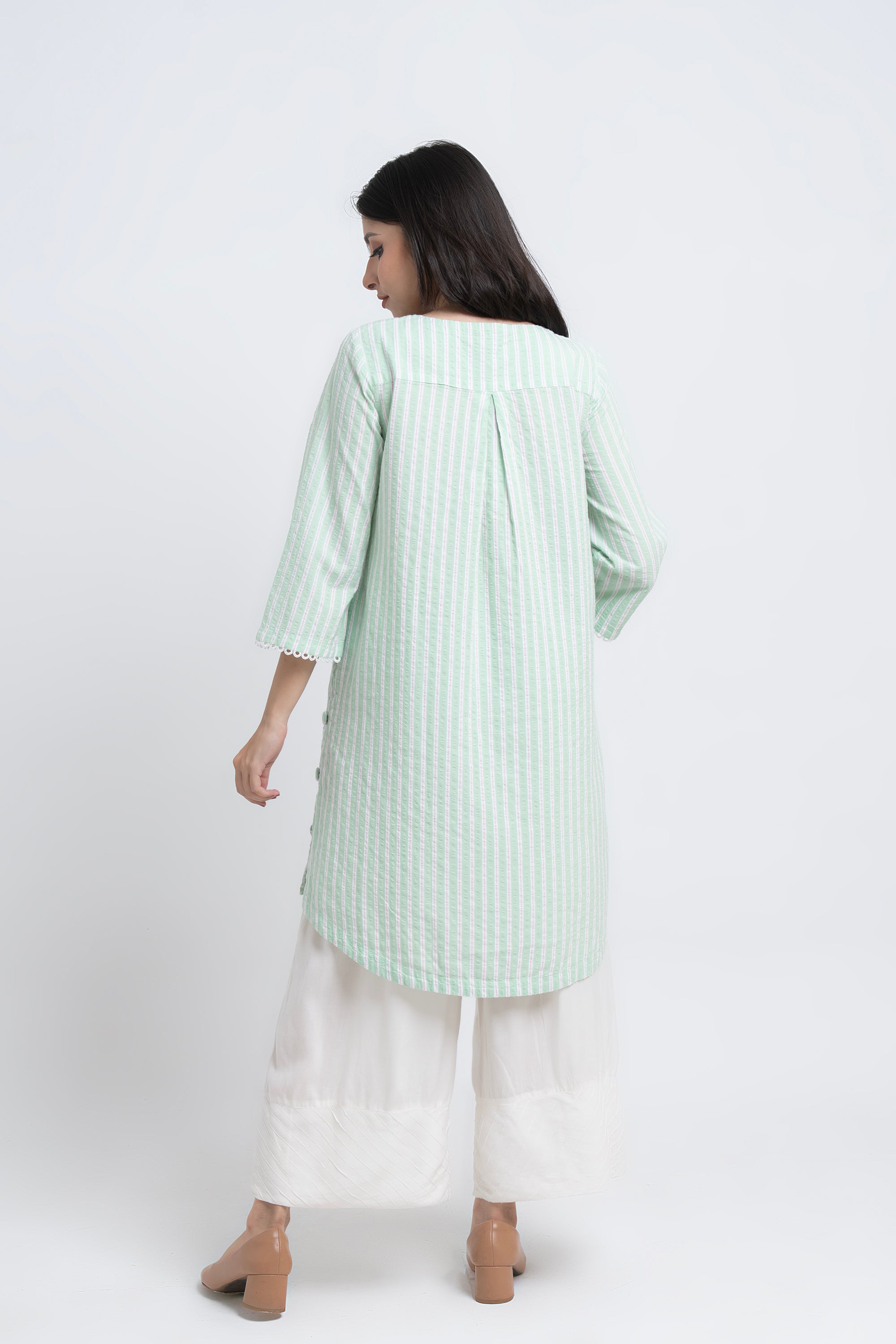 A smart-fit,Short length single-piece kurti.perfect for daily wear with a neat,modern silhouette.