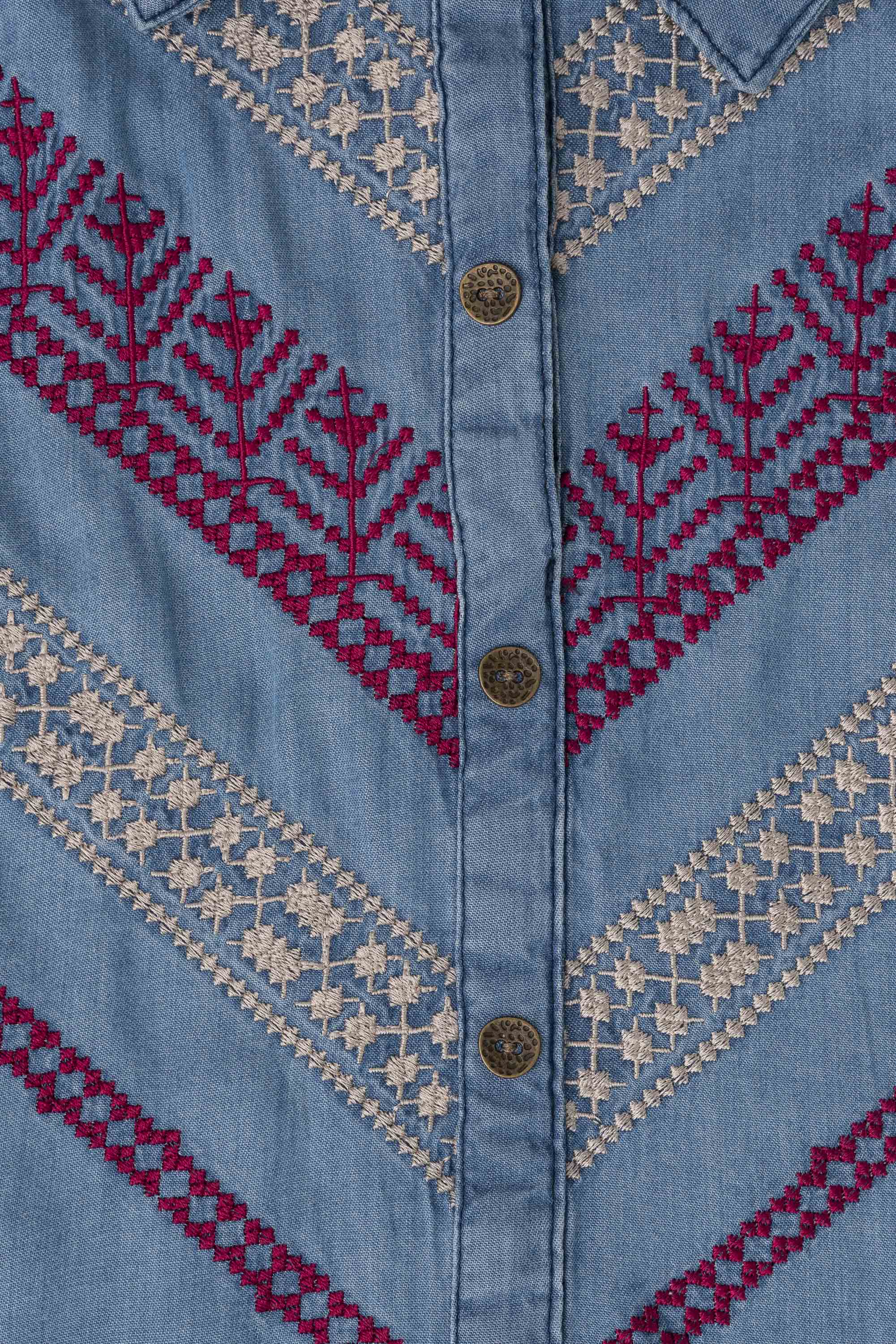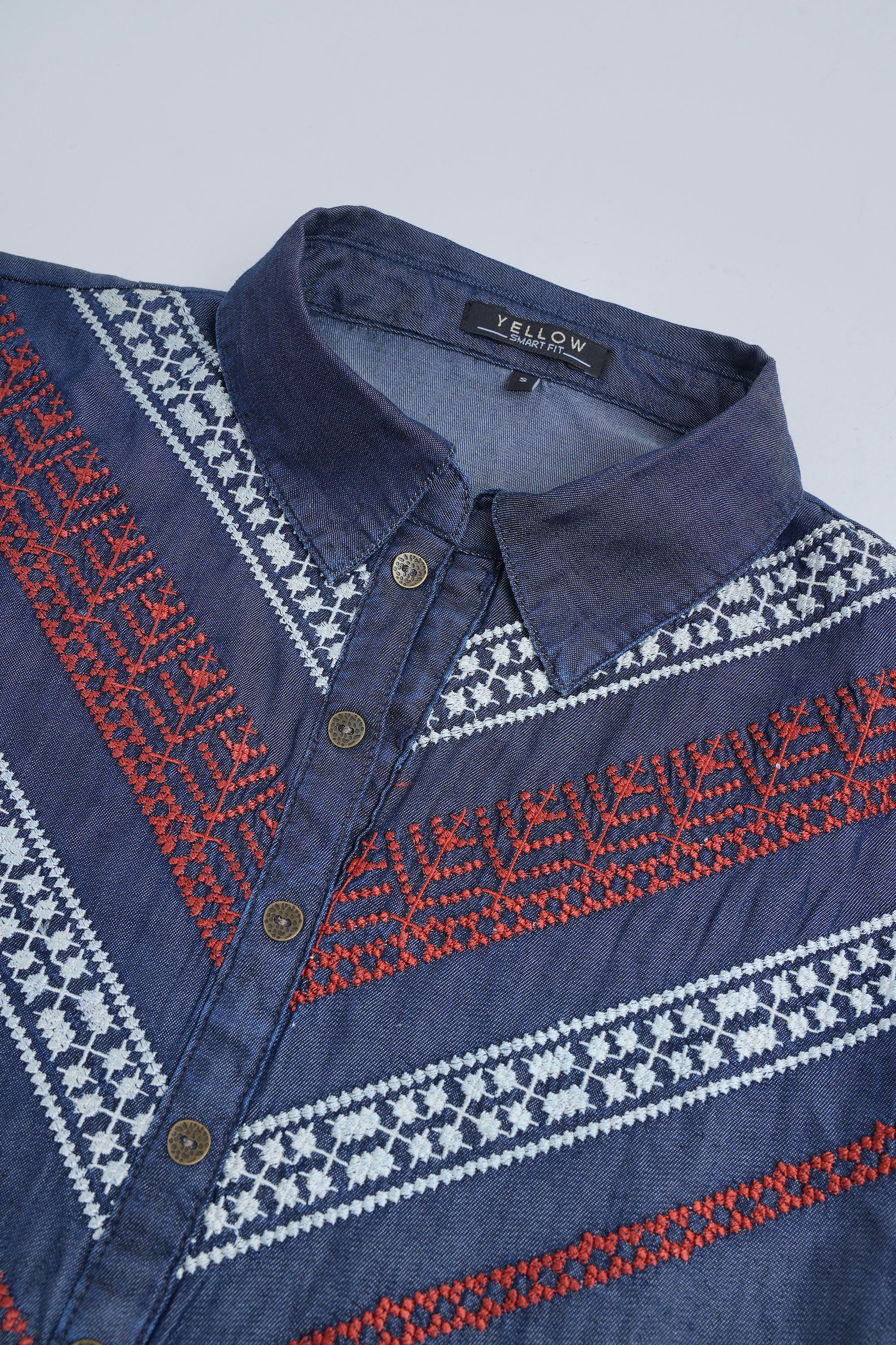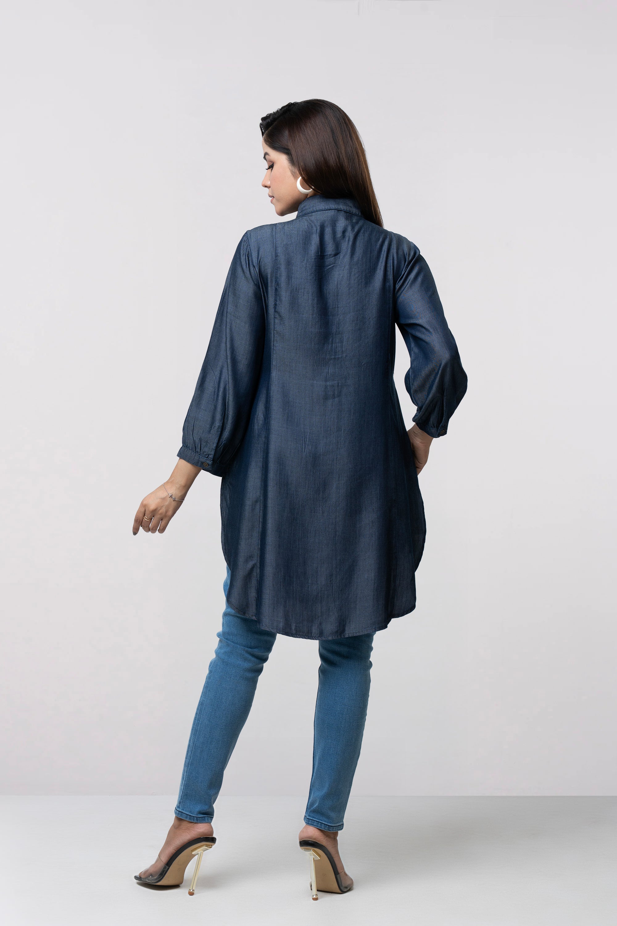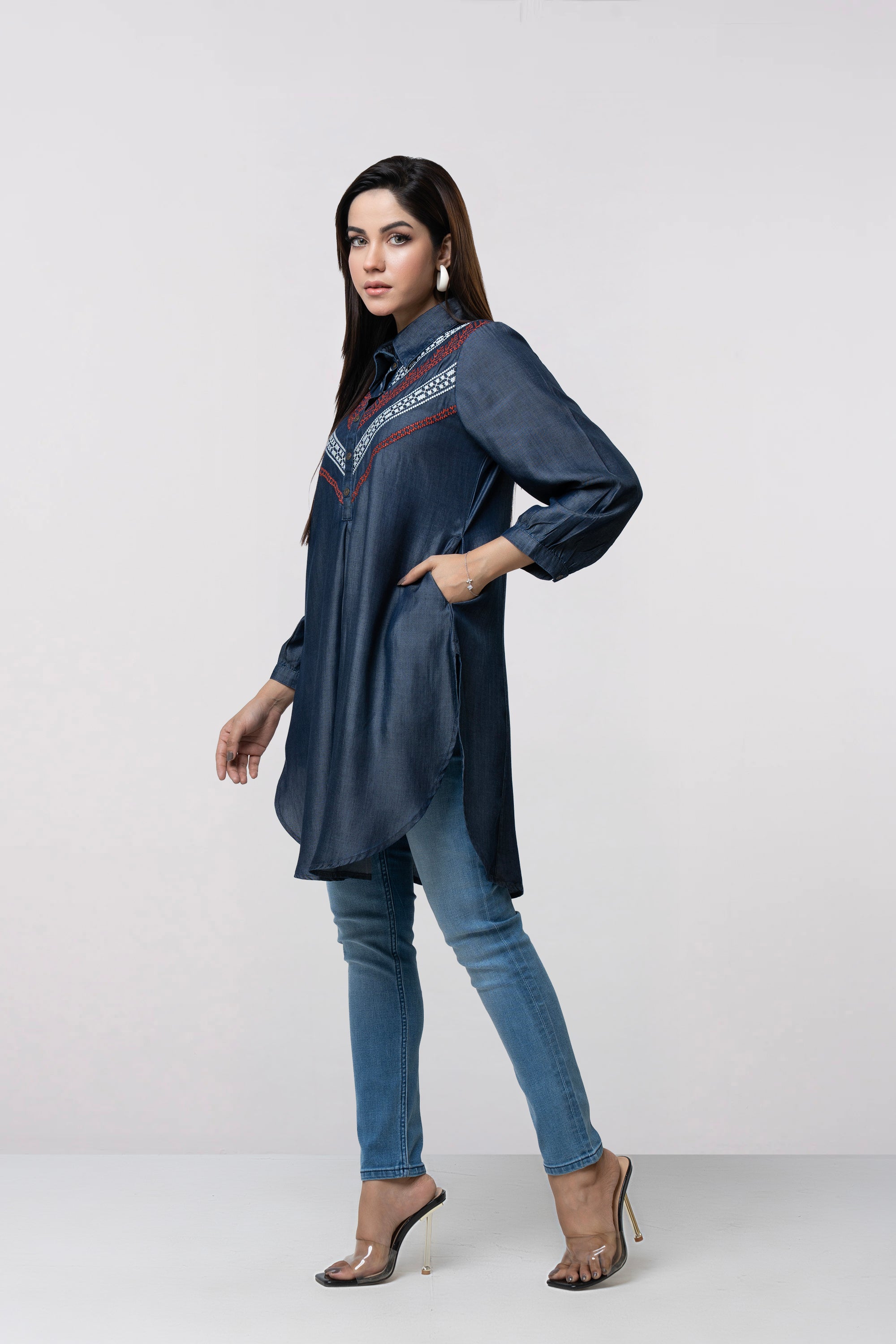 A smart-fit, short length single-piece kurti, perfect mix of traditional embroidery with a modern denim base. Suitable for casual outings or office wear.