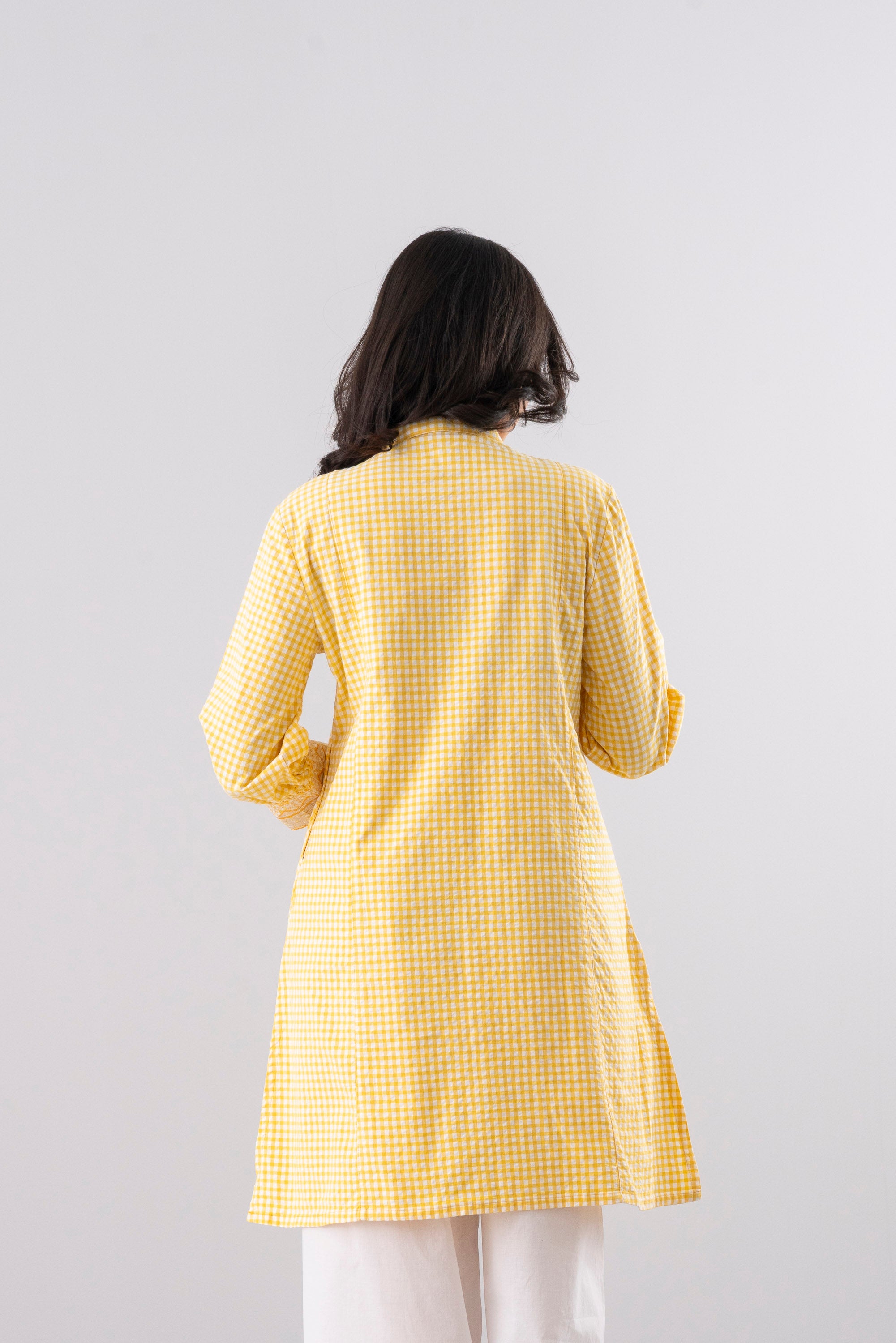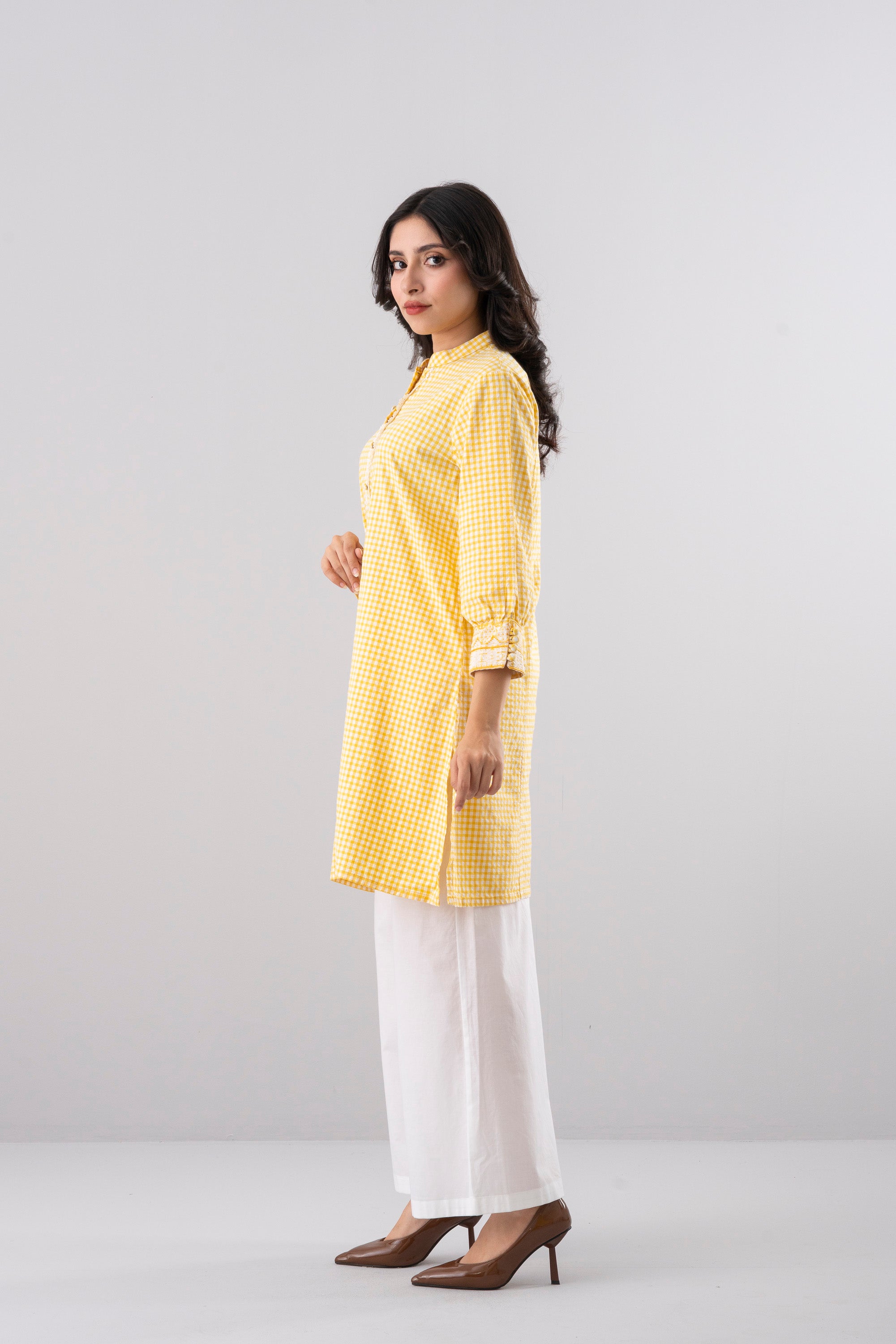 A smart-fit, long length single-piece kurta. Check pattern-soft, breathable, and casual yet fresh. Simple yet elegant embellishment through trims rather than heavy embroidery.
