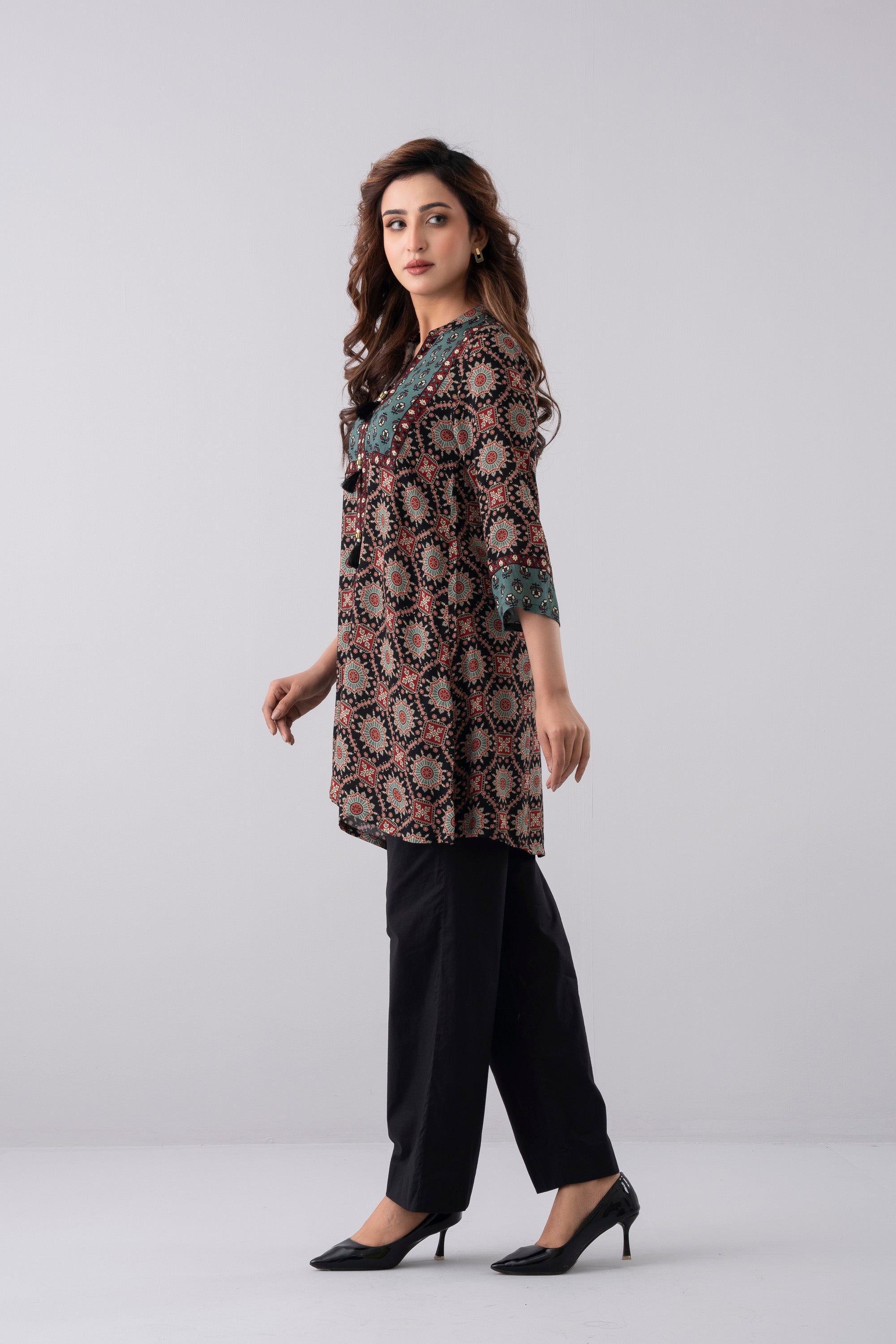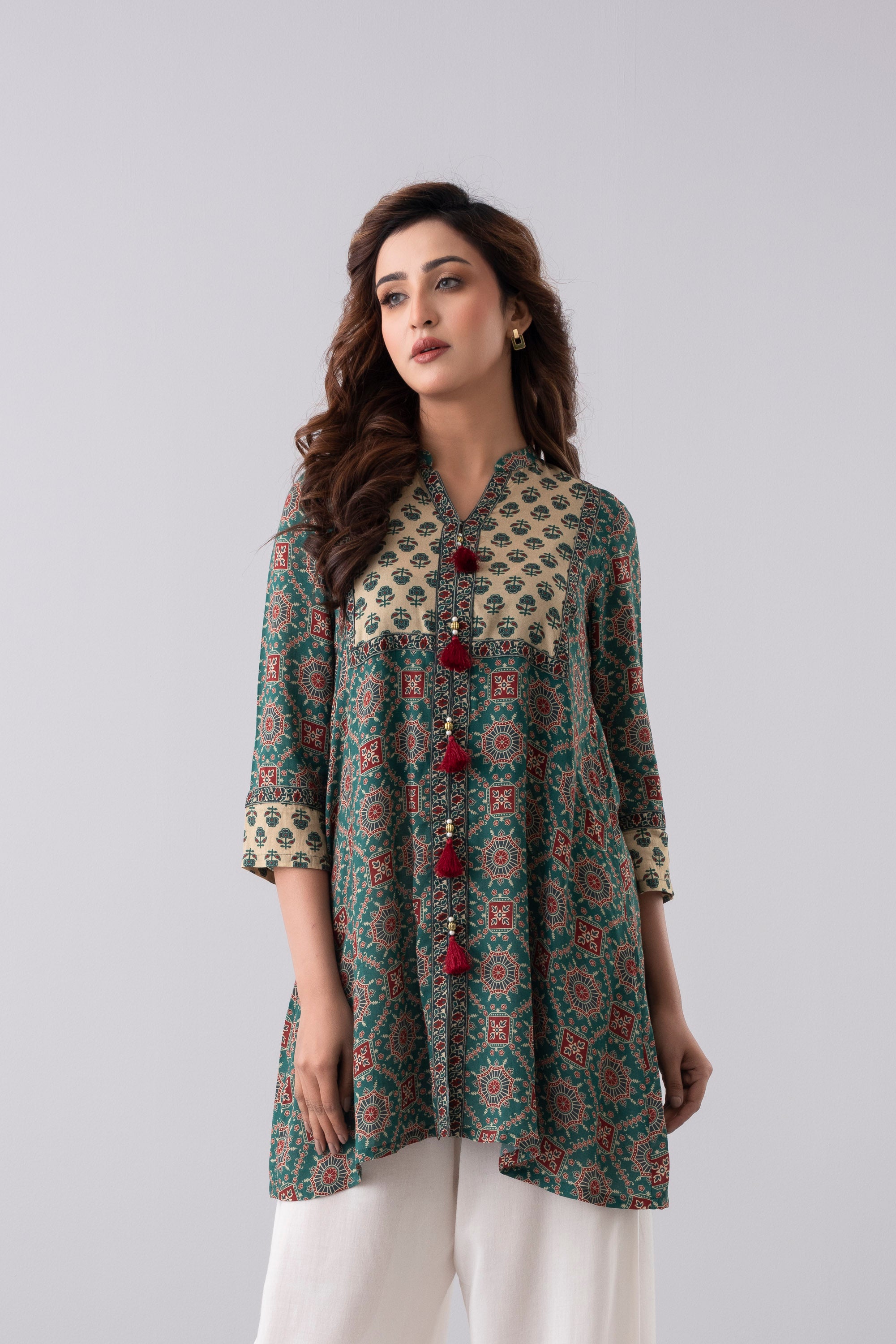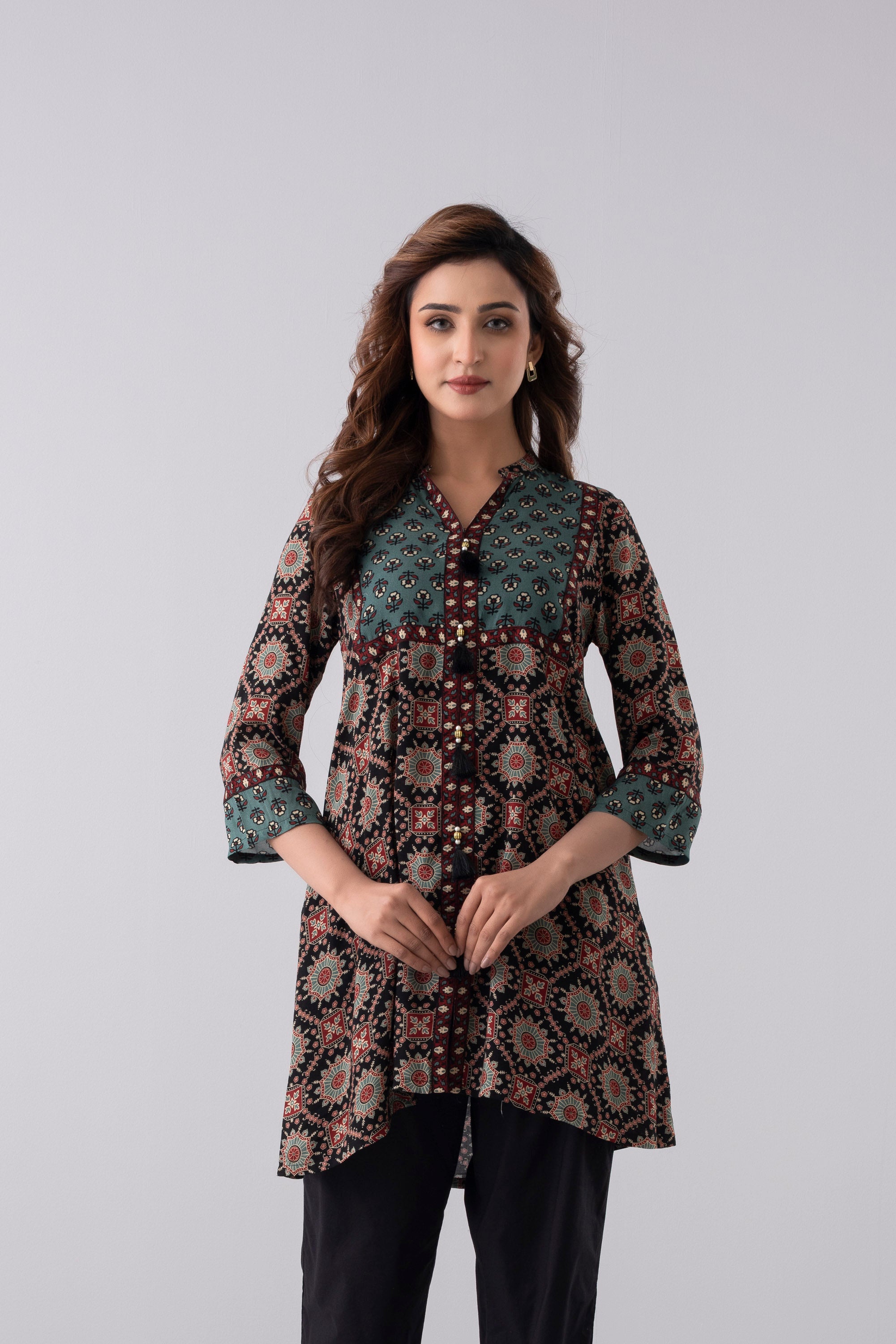 A smart-fit, short length single-piece kurti. Its straight silhouette makes it easy to wear and suitable for everyday use, office wear, or casual outings.