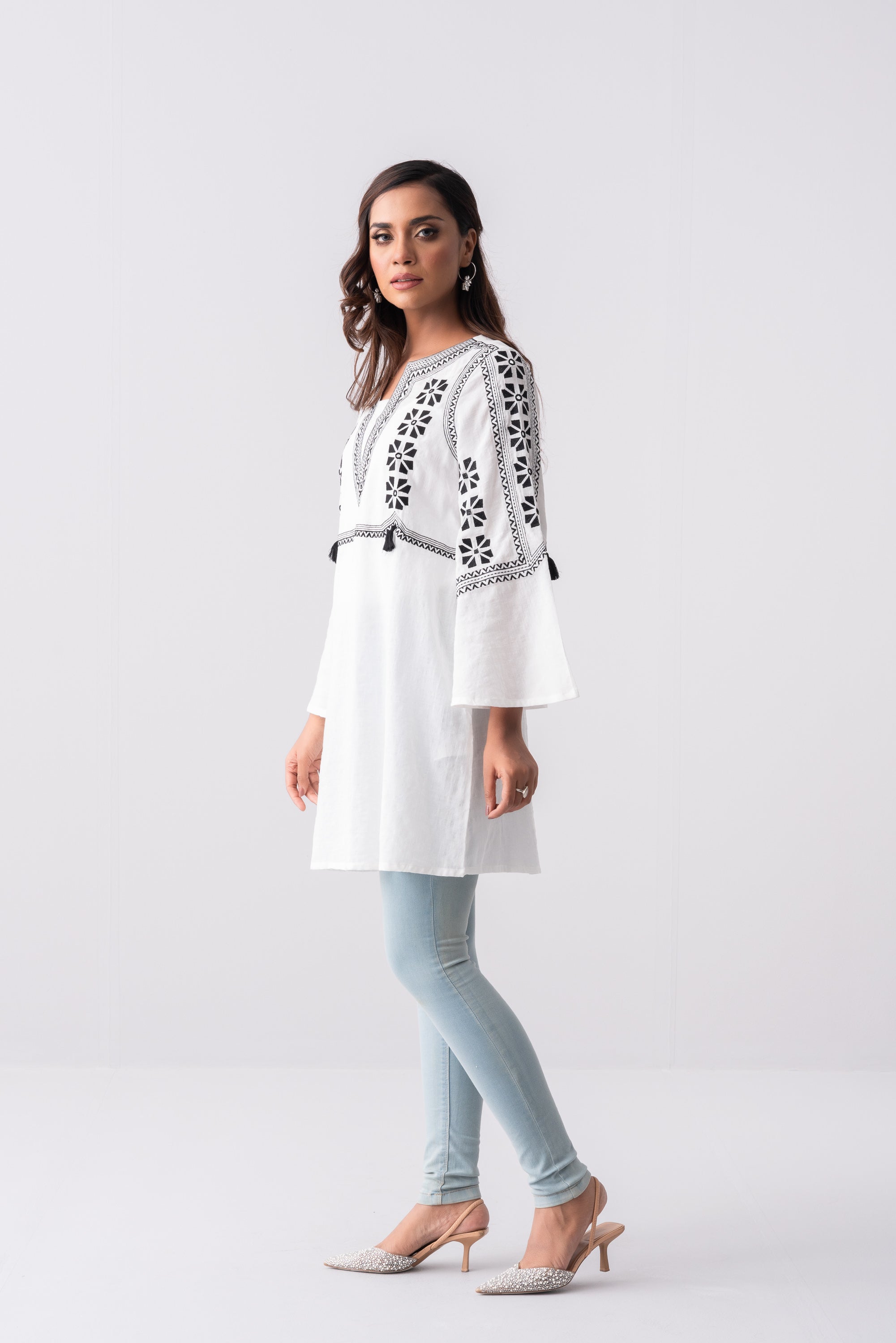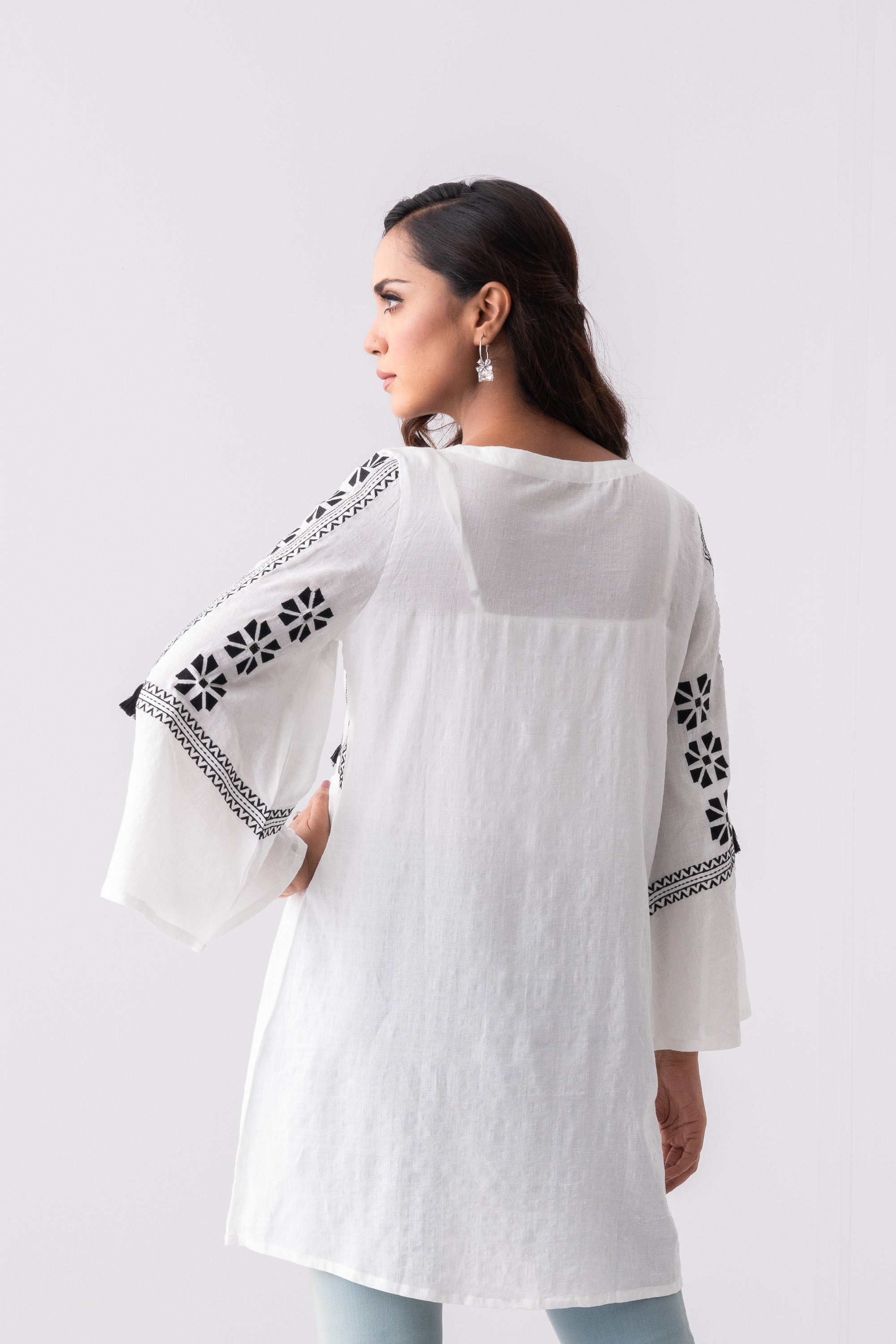 Women's relaxed-fit top made from textured cotton fabric in black and white, featuring a round neck with a slit and patch, embroidered yoke, and bell sleeves with embroidered details. Finished with stylish tassel accents for a trendy look.