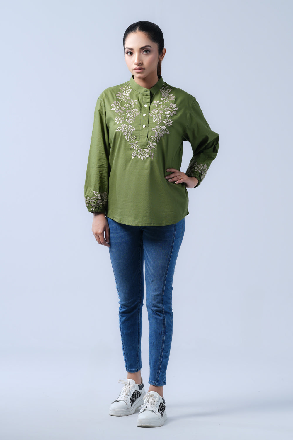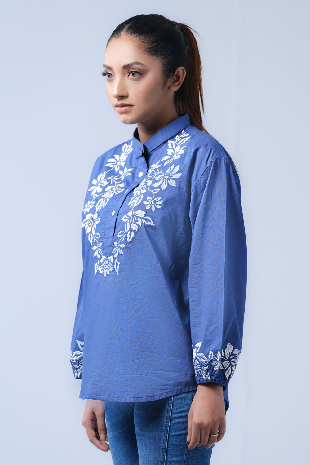 Women's regular-fit fashion top in cotton fabric, featuring a mandarin collar and a half placket with MOP buttons. Designed with 3/4 sleeves with elastic openings and bold floral embroidery details for a stylish, eye-catching look. The short length adds a trendy touch to this comfortable piece.