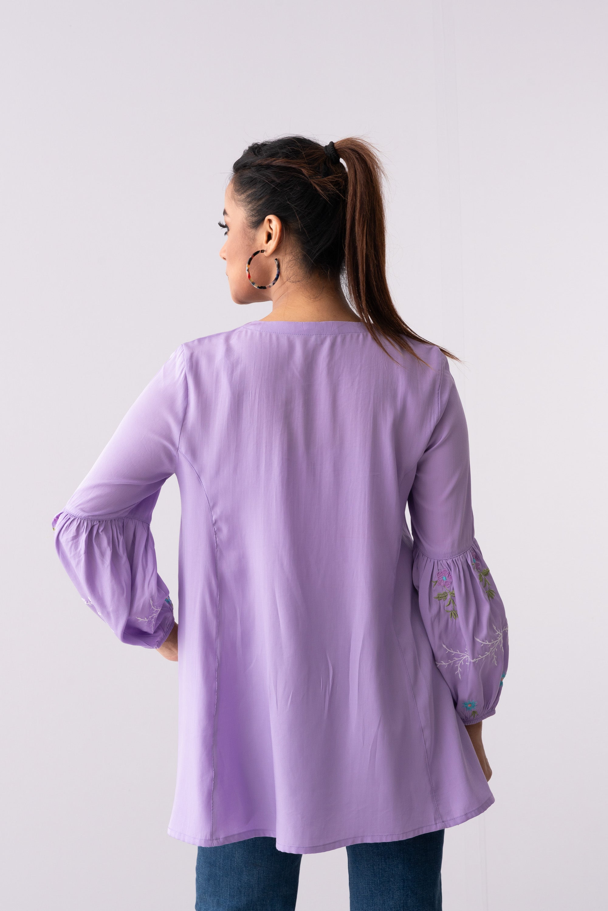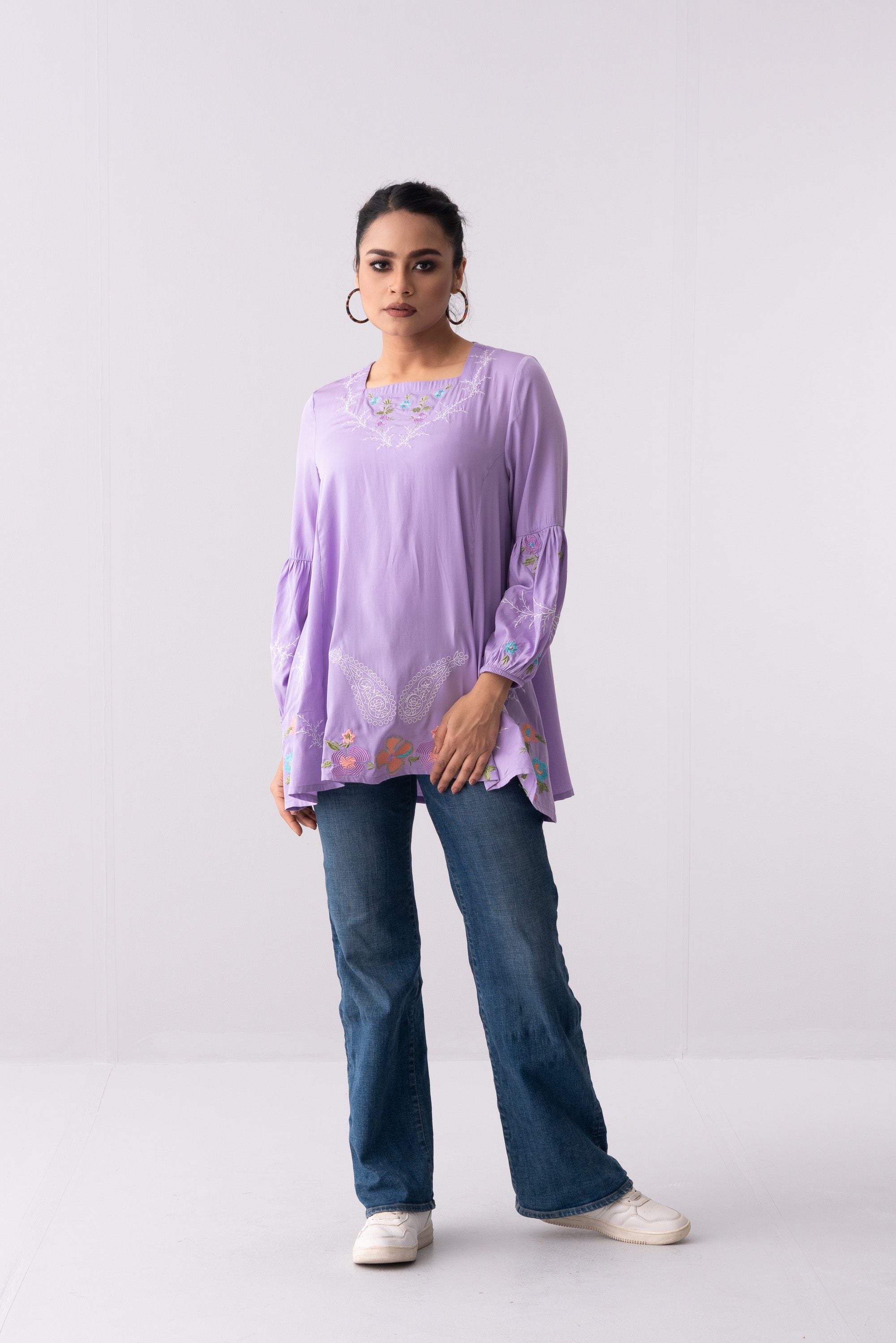 Women's Relaxed fit fashion top in satin fabric, featuring a square neck and princess line cut with a cut-and-sew body. Full-length balloon sleeves with elastic openings and floral embroidery details add elegance, while the A-line bottom provides a flattering silhouette.