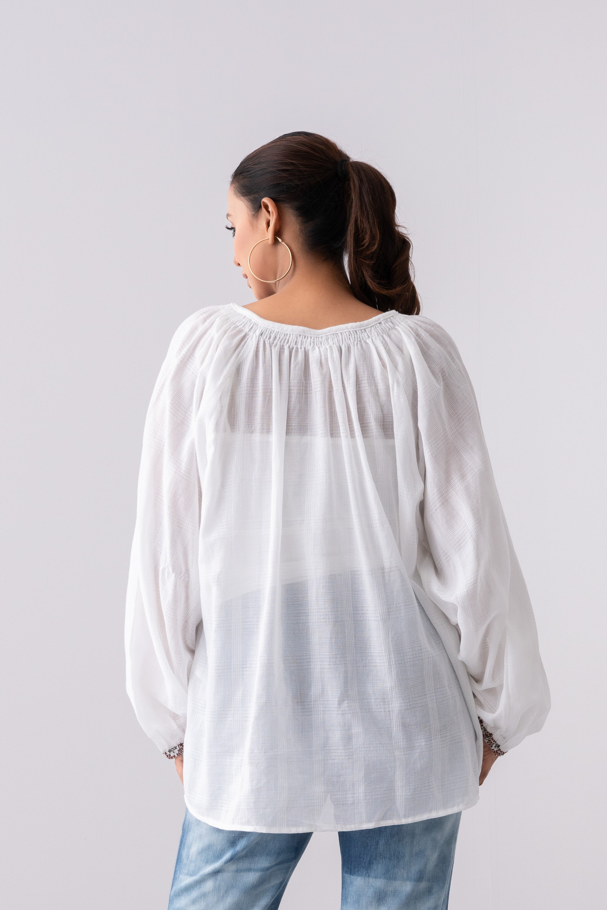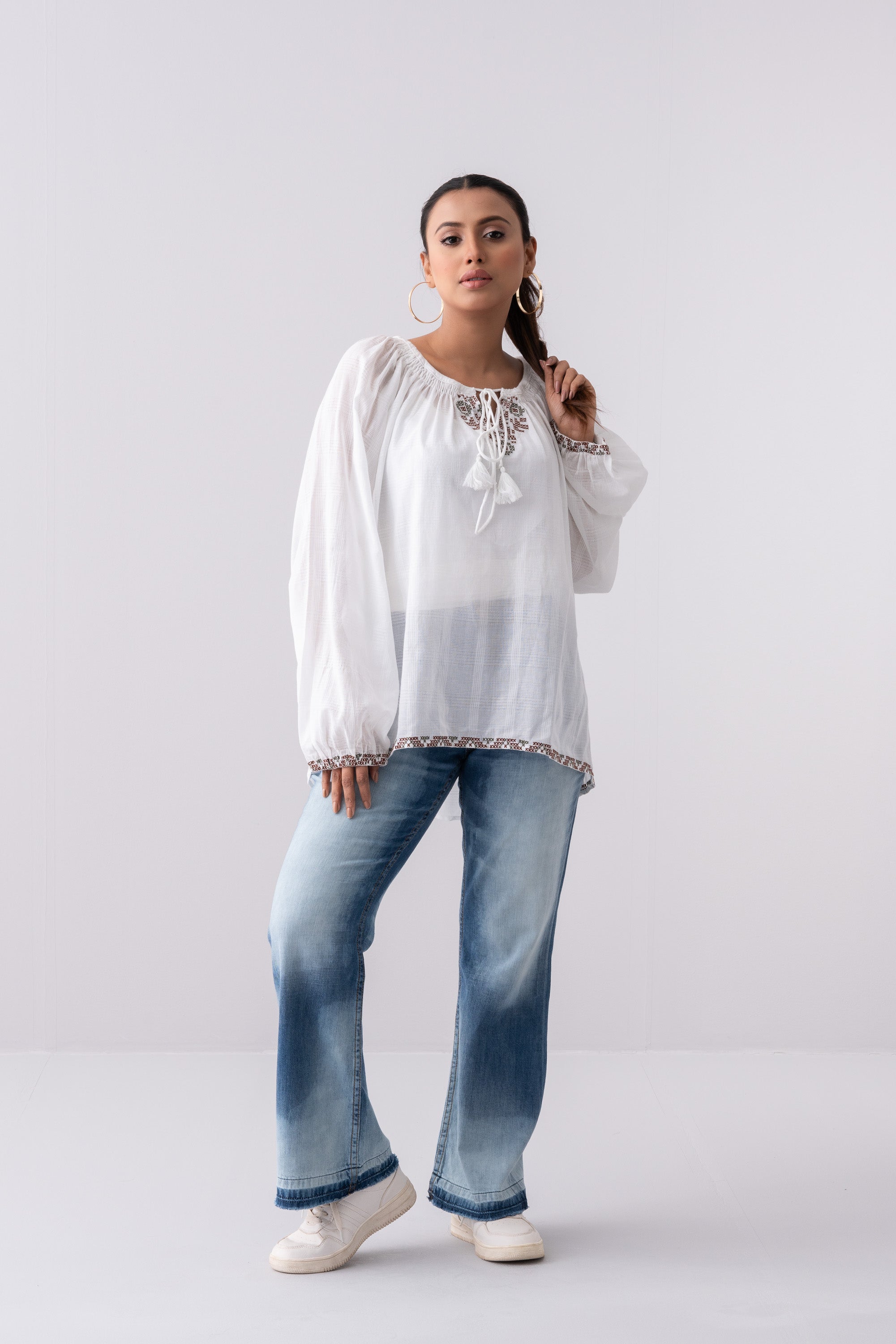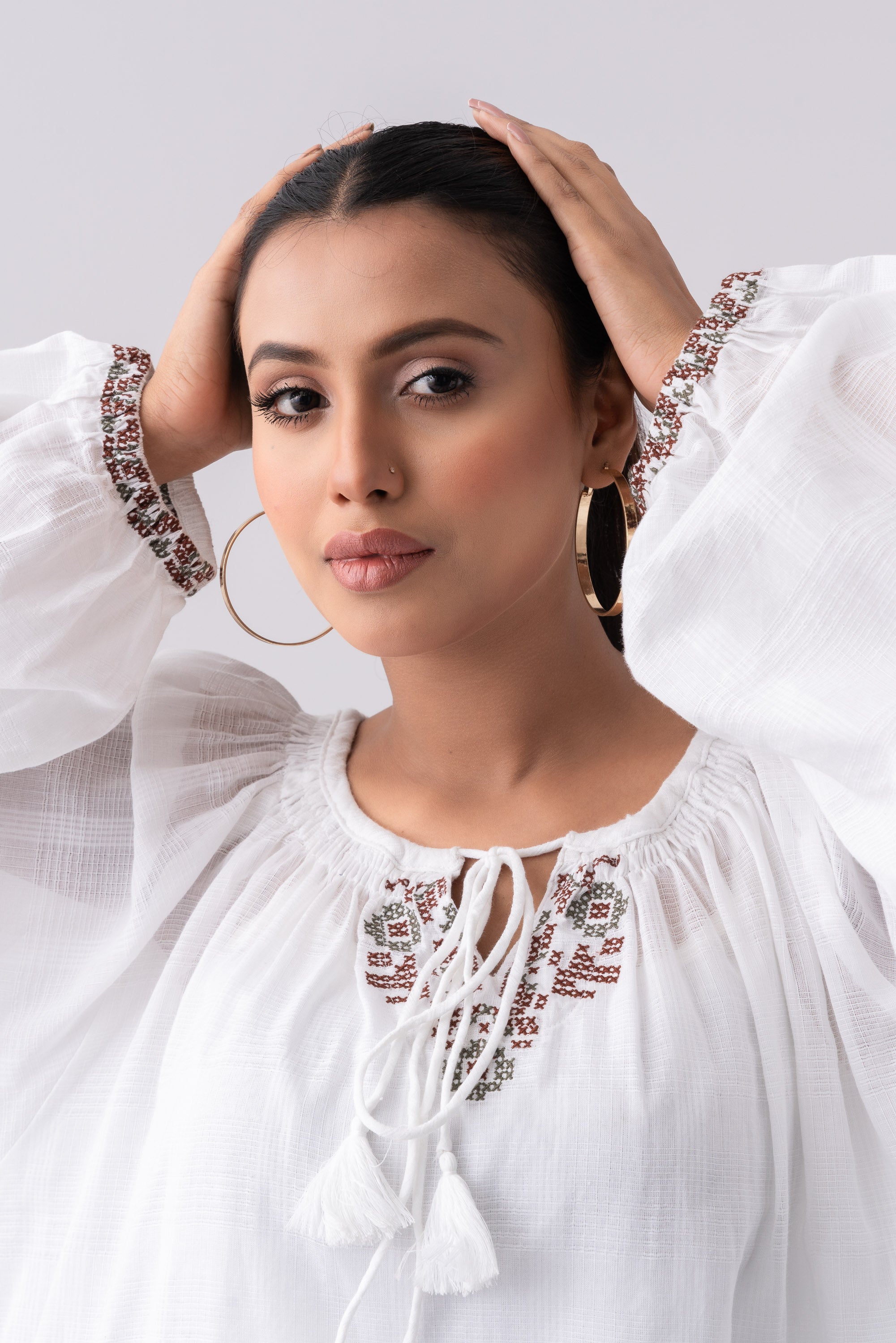 Women's oversized fit fashion top in soft textured cotton fabric, featuring a round neck with an inside tunnel and cord tassel details. Full-length balloon sleeves with elastic openings and geometric embroidery details add a unique touch to the short-length design.