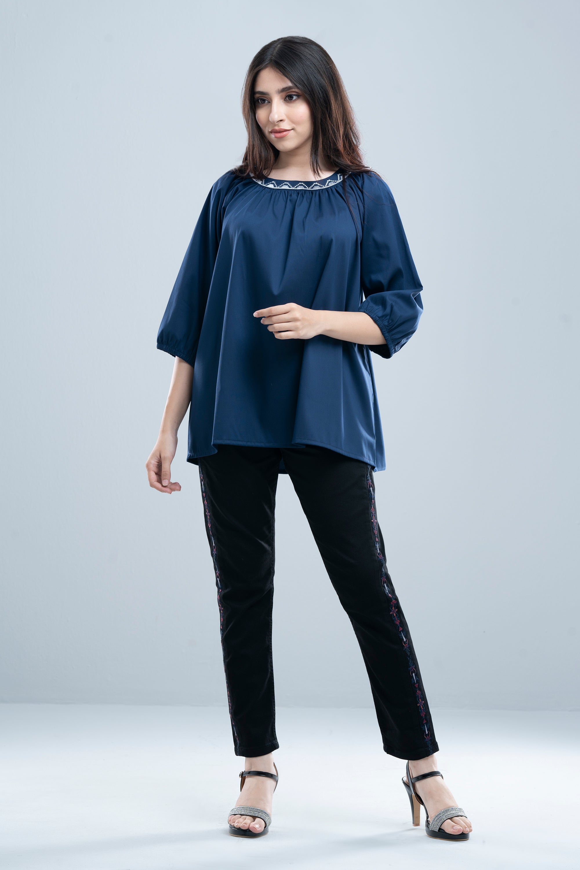 This women’s relaxed-fit fashion top offers a perfect blend of comfort and style. Crafted from a soft, breathable fabric, it features delicate embroidery on the collar band for a refined touch. Designed with puffed raglan sleeves and elasticated sleeve hems, this top adds volume and elegance while ensuring ease of movement—ideal for both casual and semi-dressy occasions.