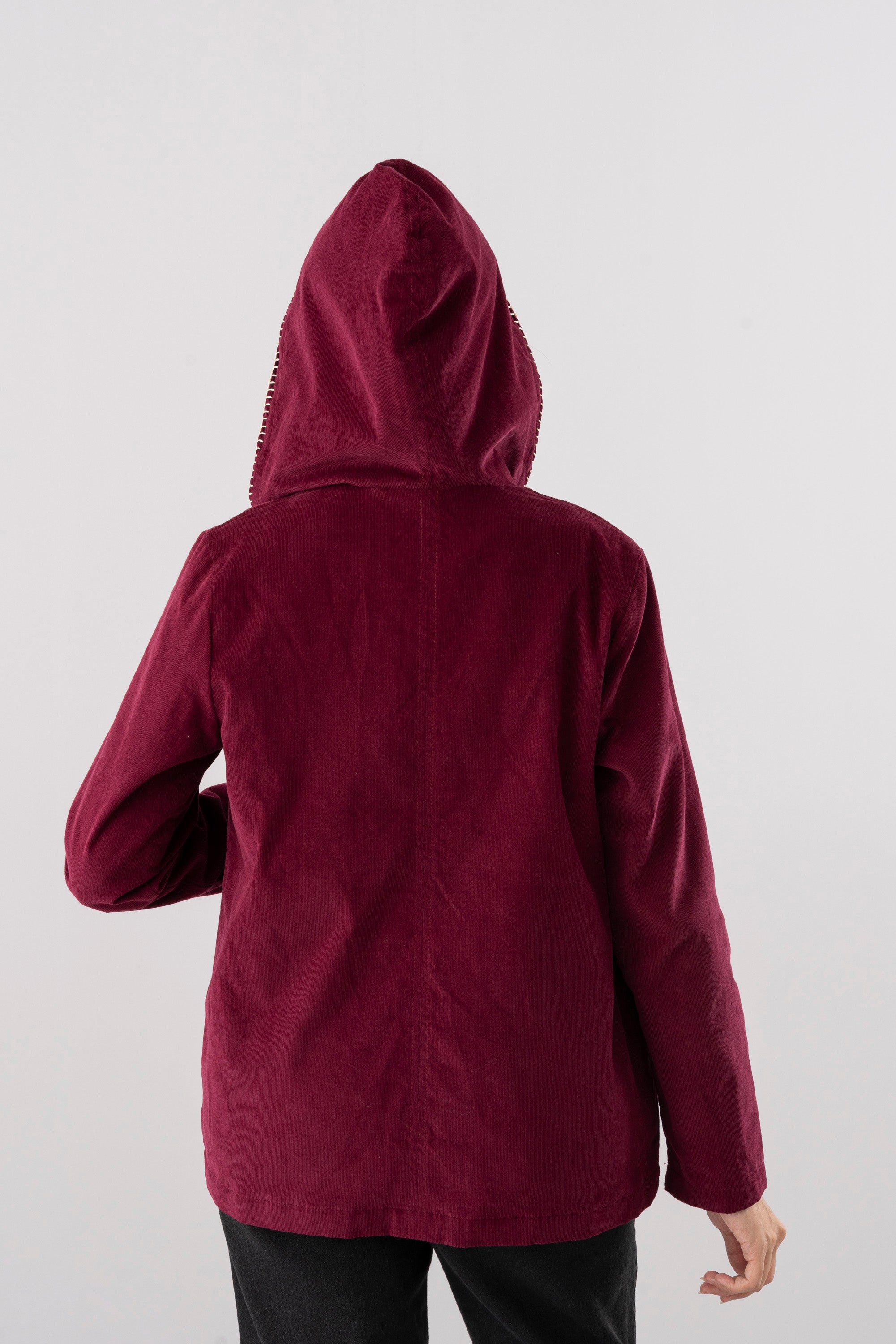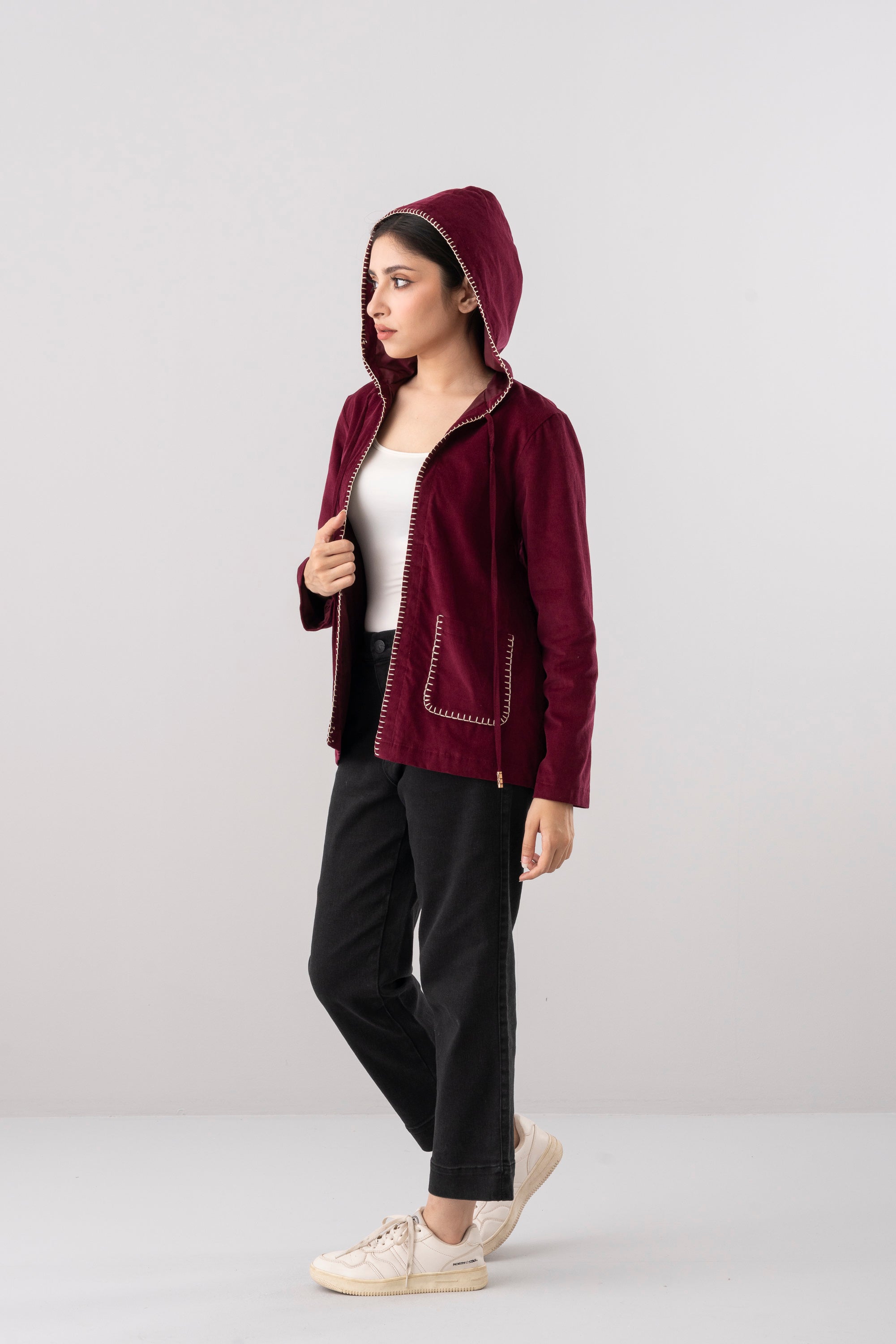 Add a cozy-chic layer to a casual wardrobe with this women’s bolero-style front-open hoodie, crafted in rich maroon for refined appeal. The design features intricate hand embroidery along the front edges and pockets, adding a touch of artisanal charm to its modern silhouette. A drawstring with cord end hood for adjusting the neckline and dual front patch pockets bring both function and comfort, while the contrast-stitch detailing enhances its handcrafted aesthetic. Perfect for layering, this hoodie combines traditional craftsmanship with contemporary comfort, making it a standout piece for effortless everyday style.