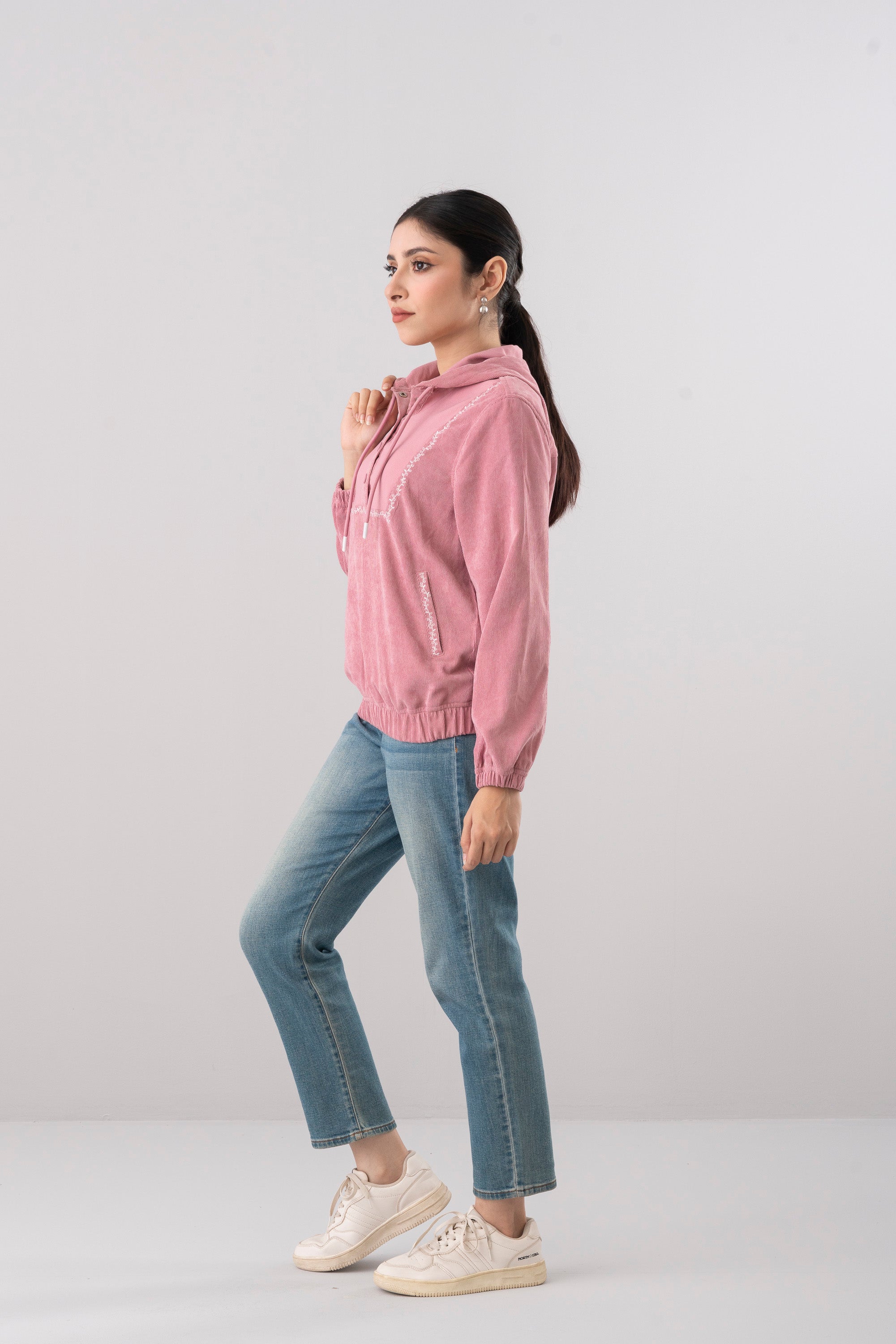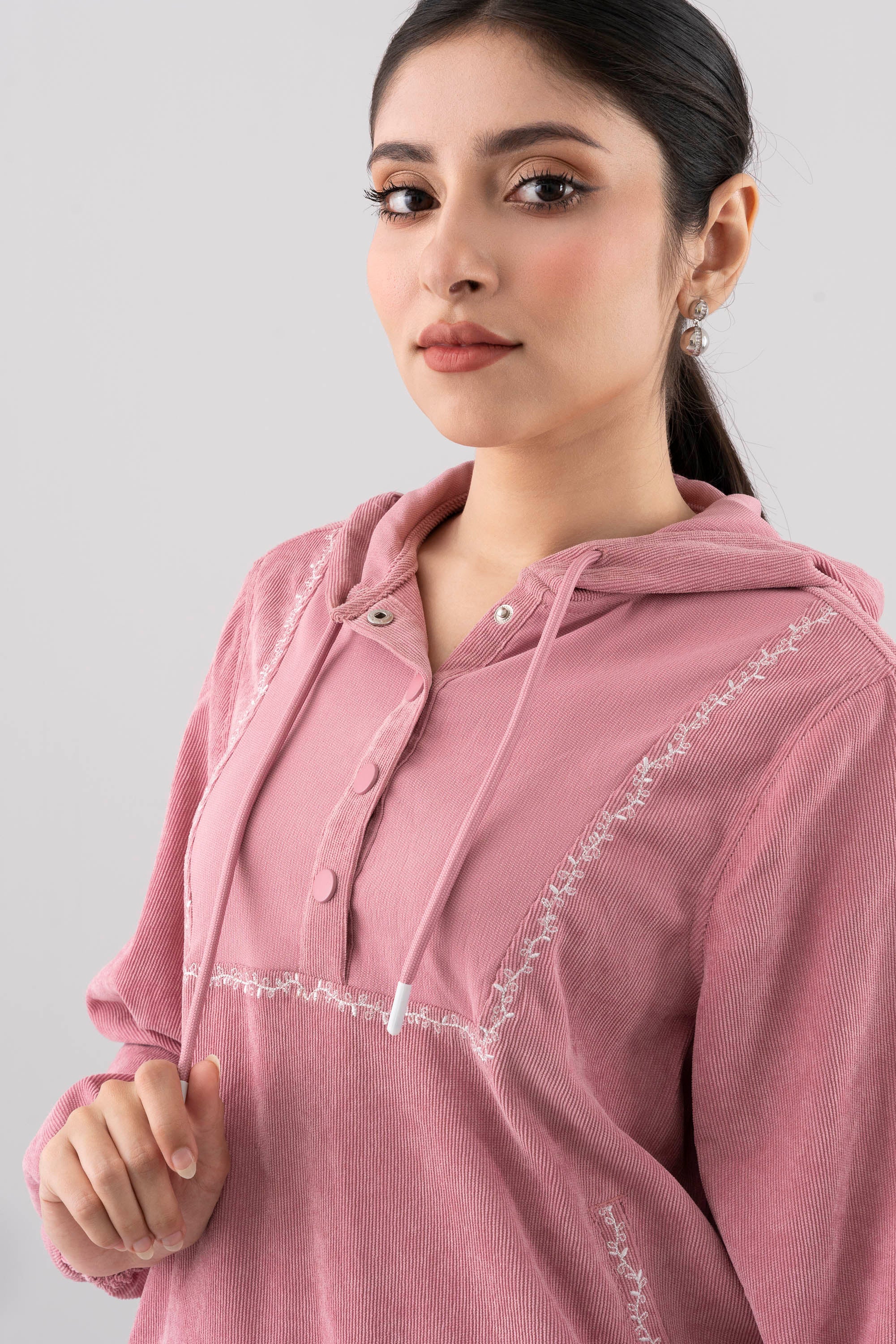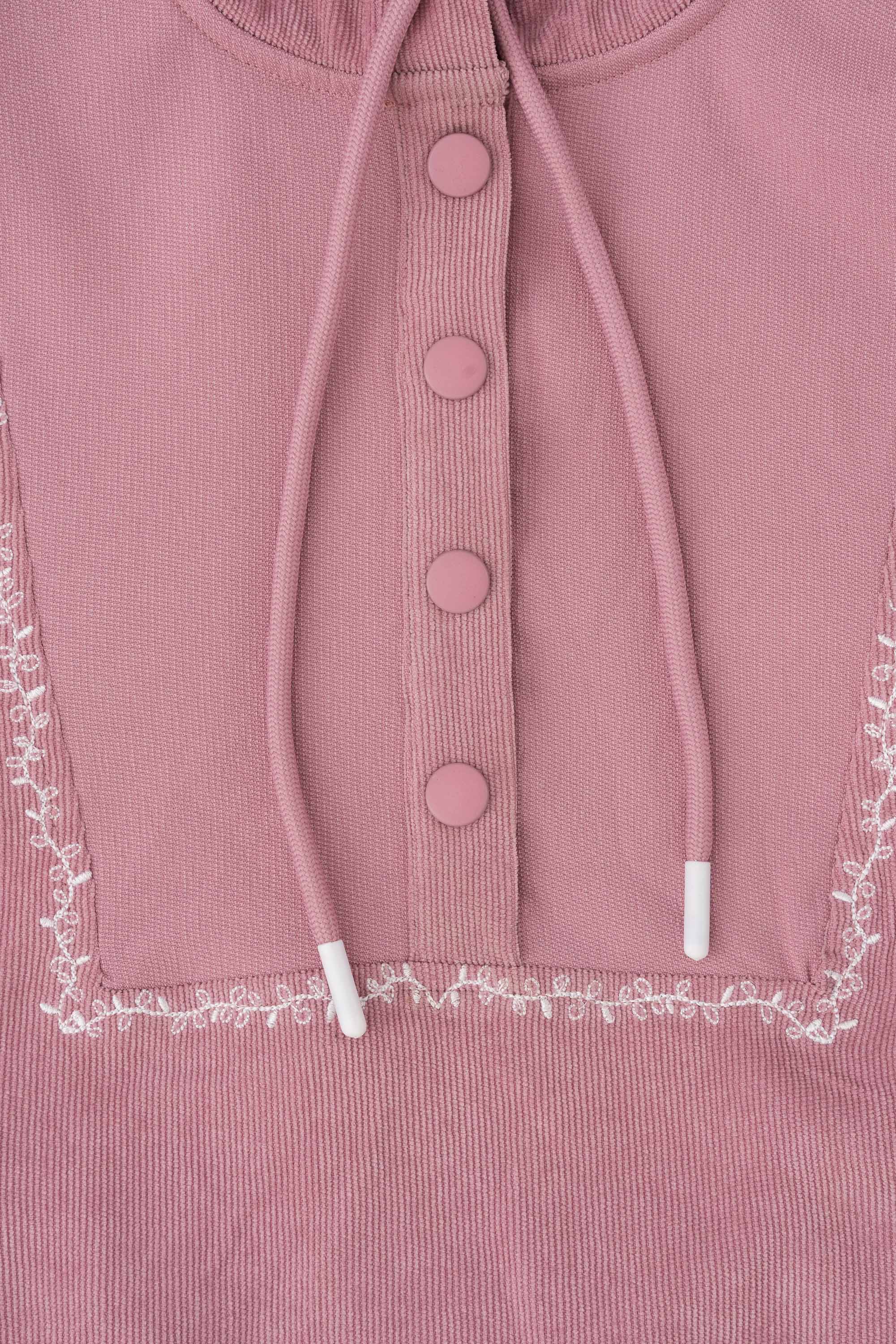 Step into effortless comfort and style with this wild rose women’s hoodie, designed with a regular fit for everyday ease. The hoodie features a unique V-shaped yoke with embroidery, also with a partial button-up front placket accented by metal snap buttons, adding a modern twist to a classic silhouette. The drawstring hood allows adjustable coverage, while welt pockets offer functionality and a sleek embroidered finish. Crafted from soft, cozy fabric, it’s completed with elasticated cuffs and hem to ensure a snug fit and clean look. Perfect for casual outings, cozy evenings, or laid-back weekends.