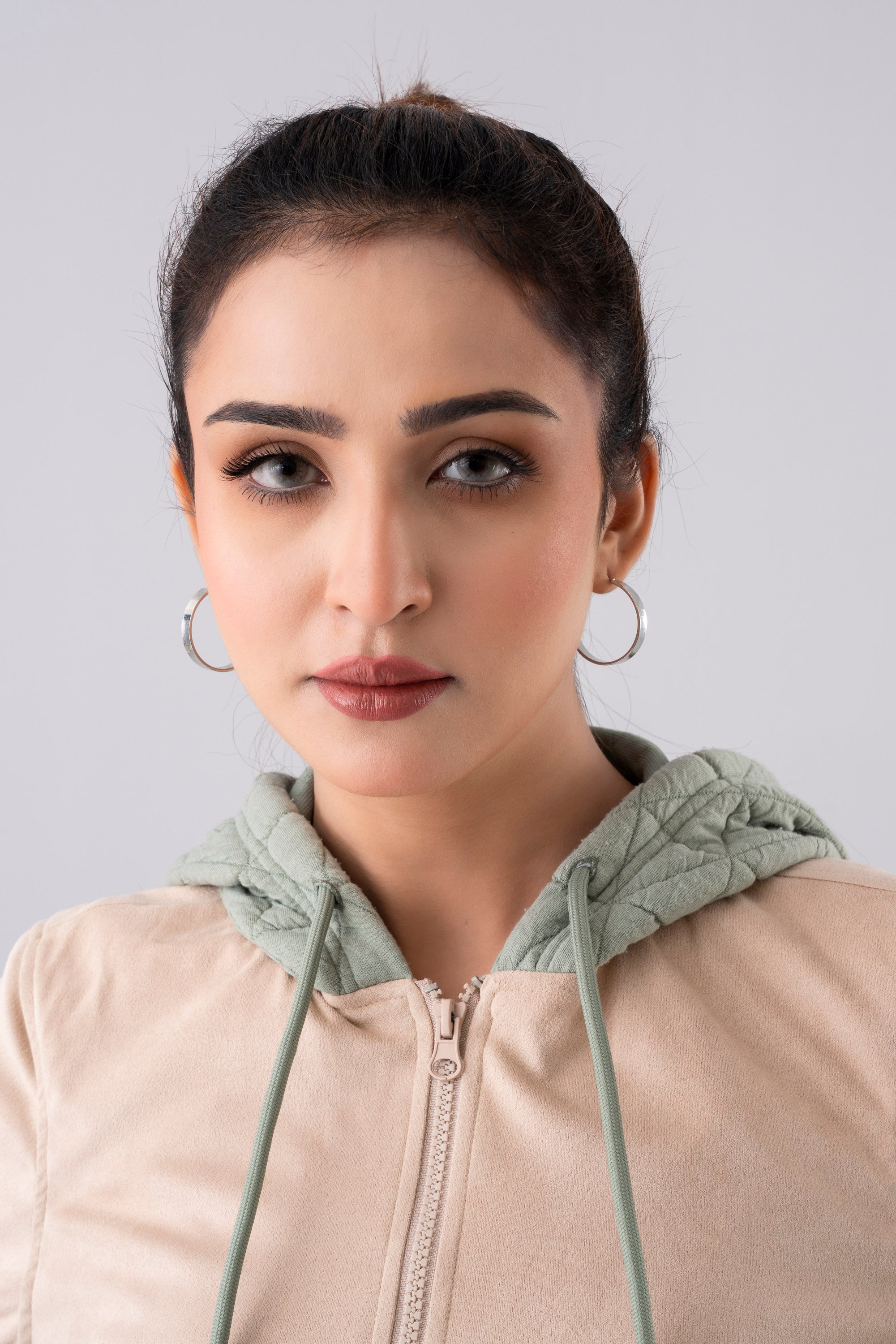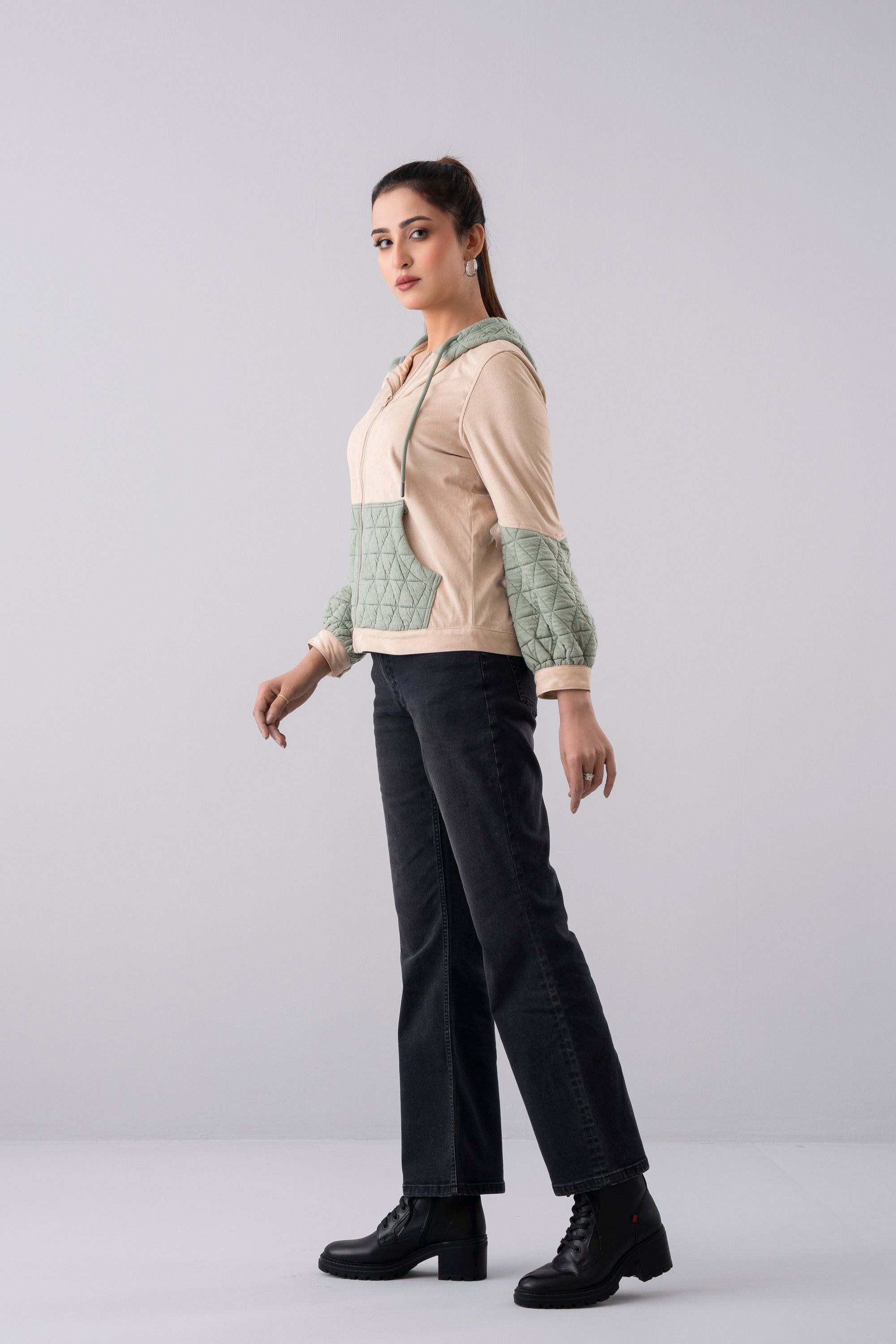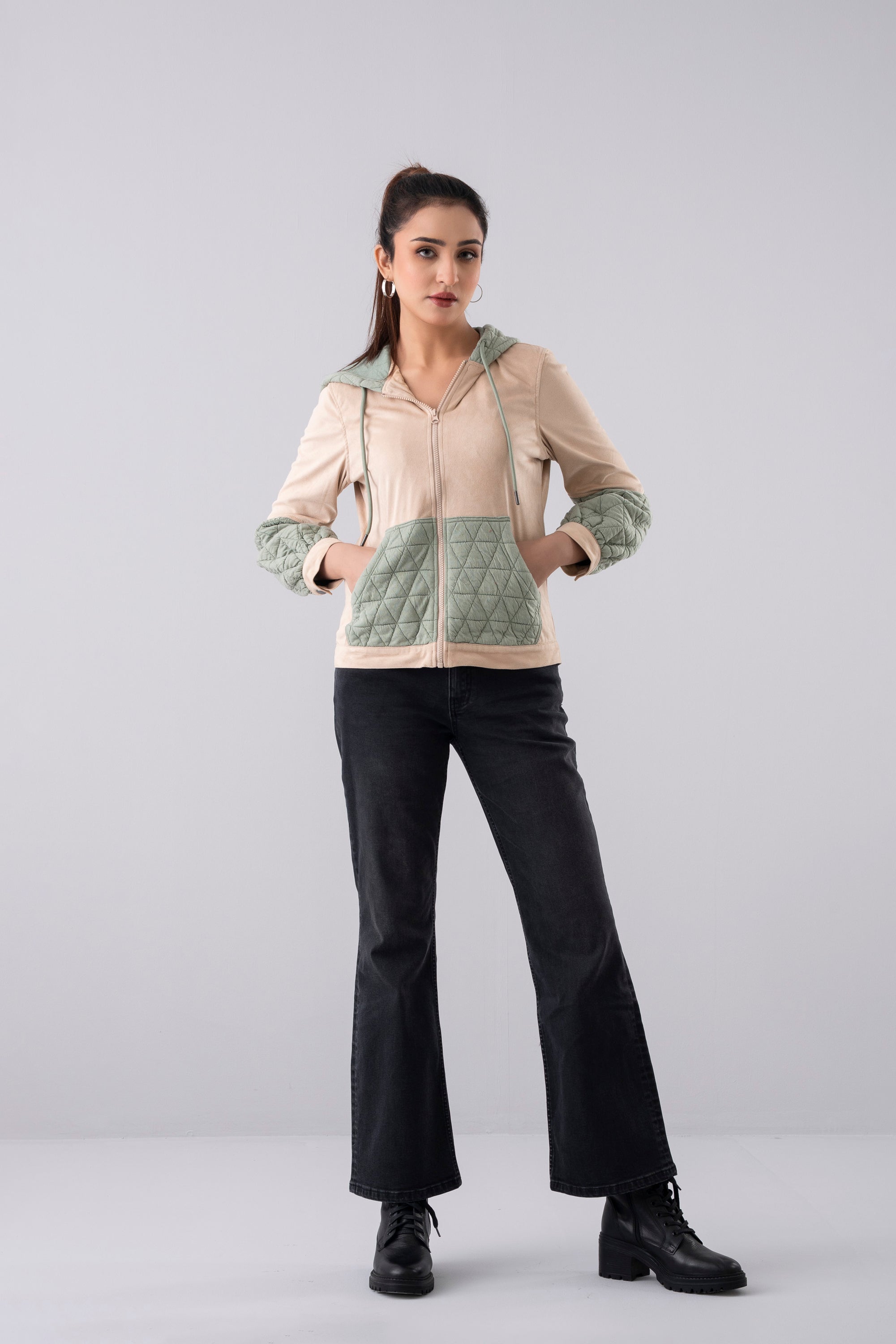 Stay cozy and stylish in this uniquely designed hoodie featuring a perfect blend of textures and tones. Crafted with soft suede-finish fabric in a muted beige base, it’s contrasted by quilted panels on the sleeves, hood, and kangaroo pocket in a cool pastel blue tone. The diamond quilting adds a plush, padded look while enhancing warmth and comfort. Designed with a front zip closure and adjustable drawstrings at the hood, this hoodie brings a casual yet fashion-forward vibe to the winter wardrobe.