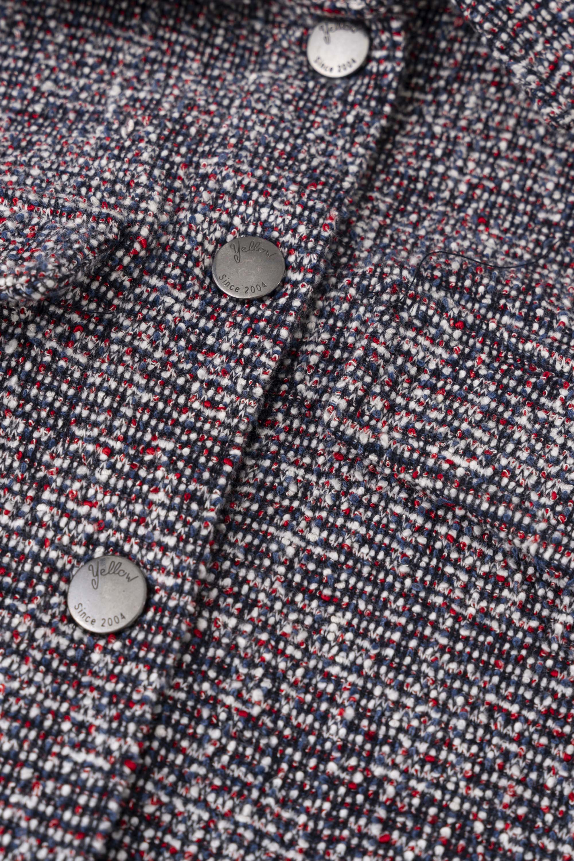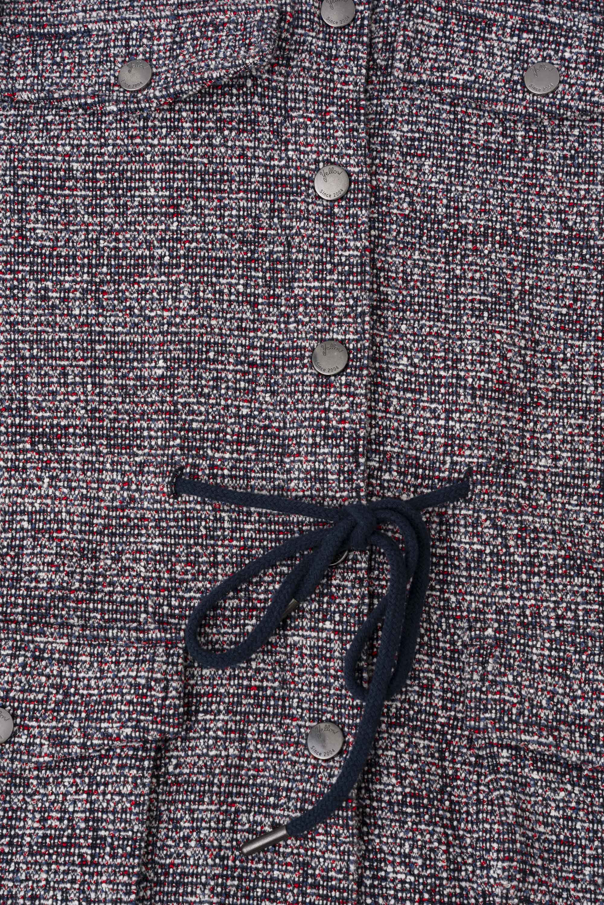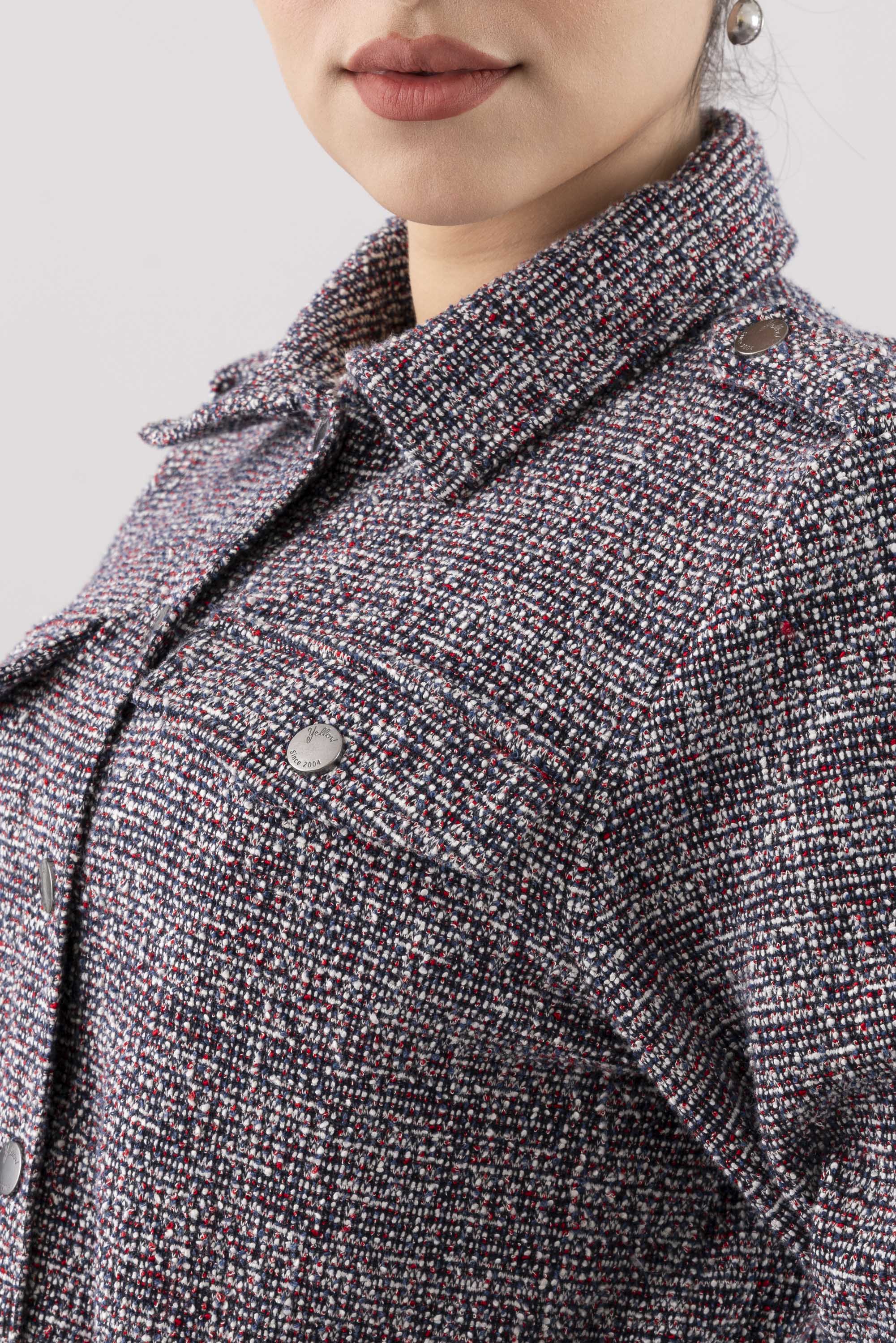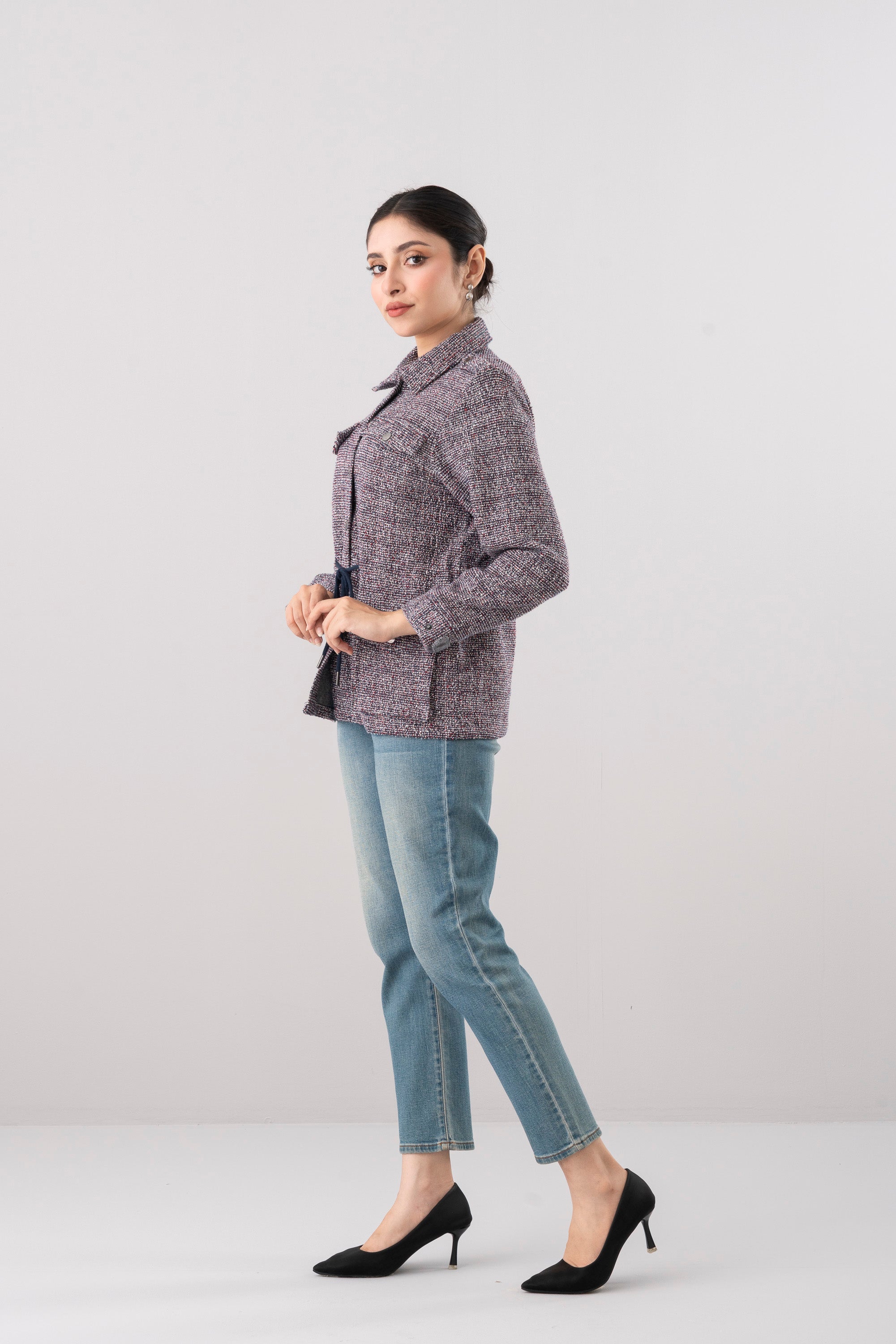 Women’s textured jacket featuring a structured collar, flap patch pockets, and a drawstring at the waist for an adjustable fit. Designed with a soft woven fabric that offers both comfort and sophistication, making it perfect for smart-casual styling.