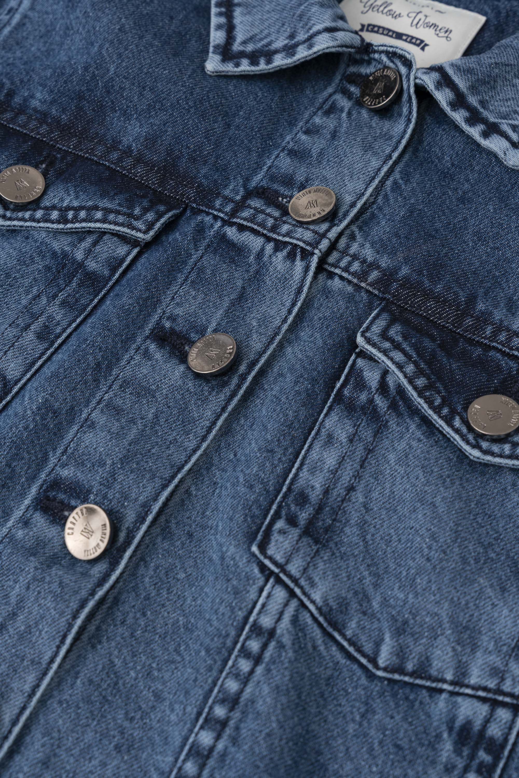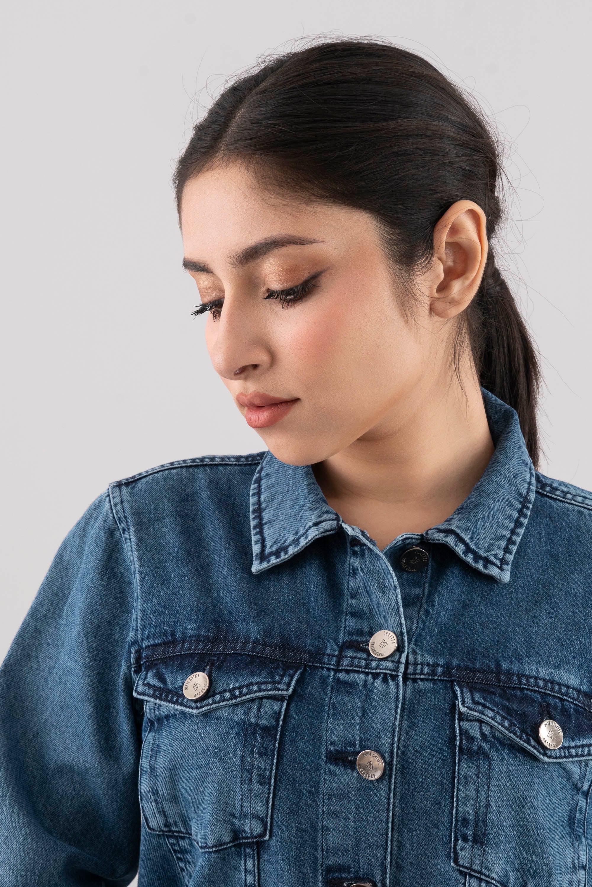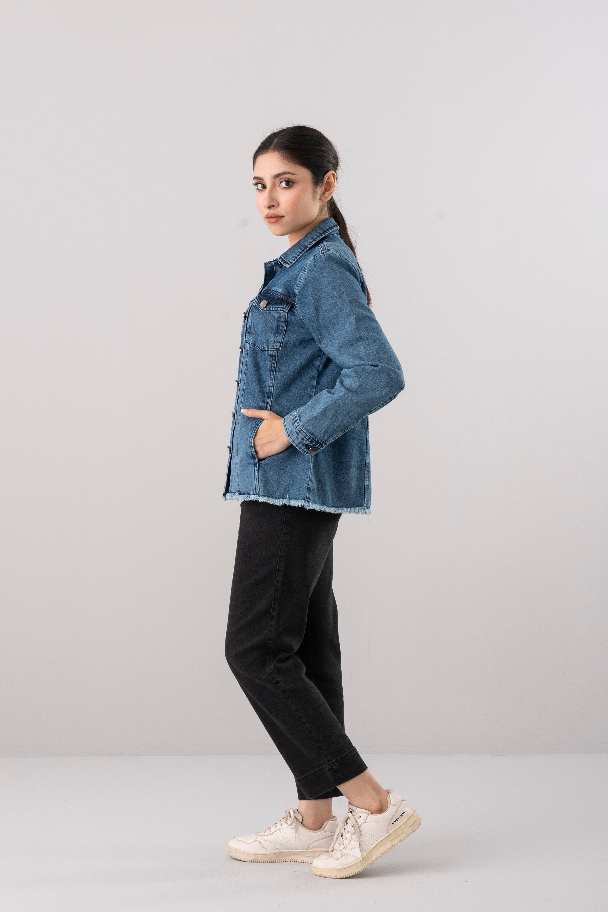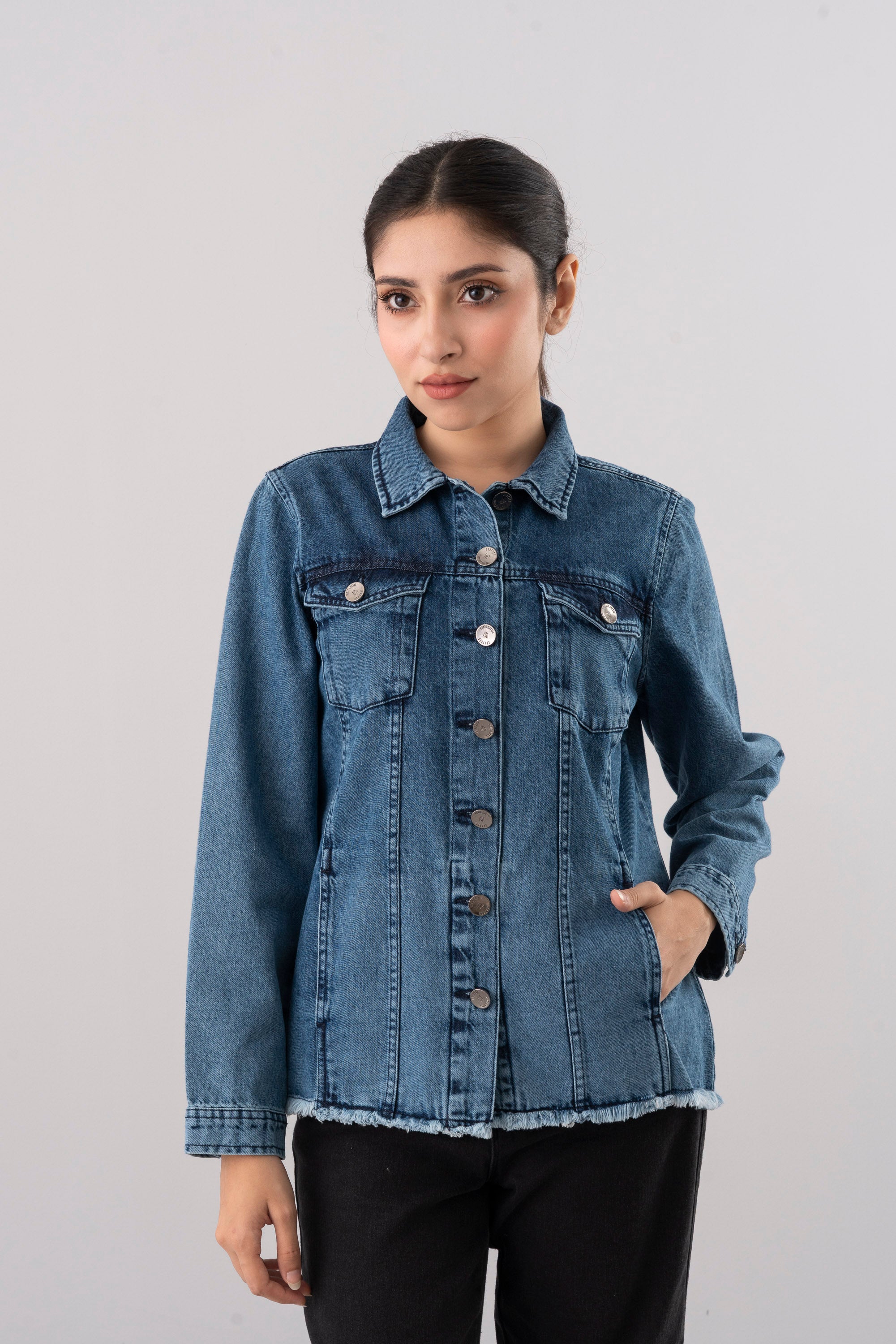 Women’s denim jacket is crafted in a regular fit with a versatile mid-wash finish, offering a timeless yet contemporary appeal. Featuring precise cut-and-sew detailing and a raw hem, it brings a modern, fashion-forward edge to classic denim. Cuffed sleeves and shank button front fastening enhance both style and functionality, making it a chic, effortless choice for everyday wear.