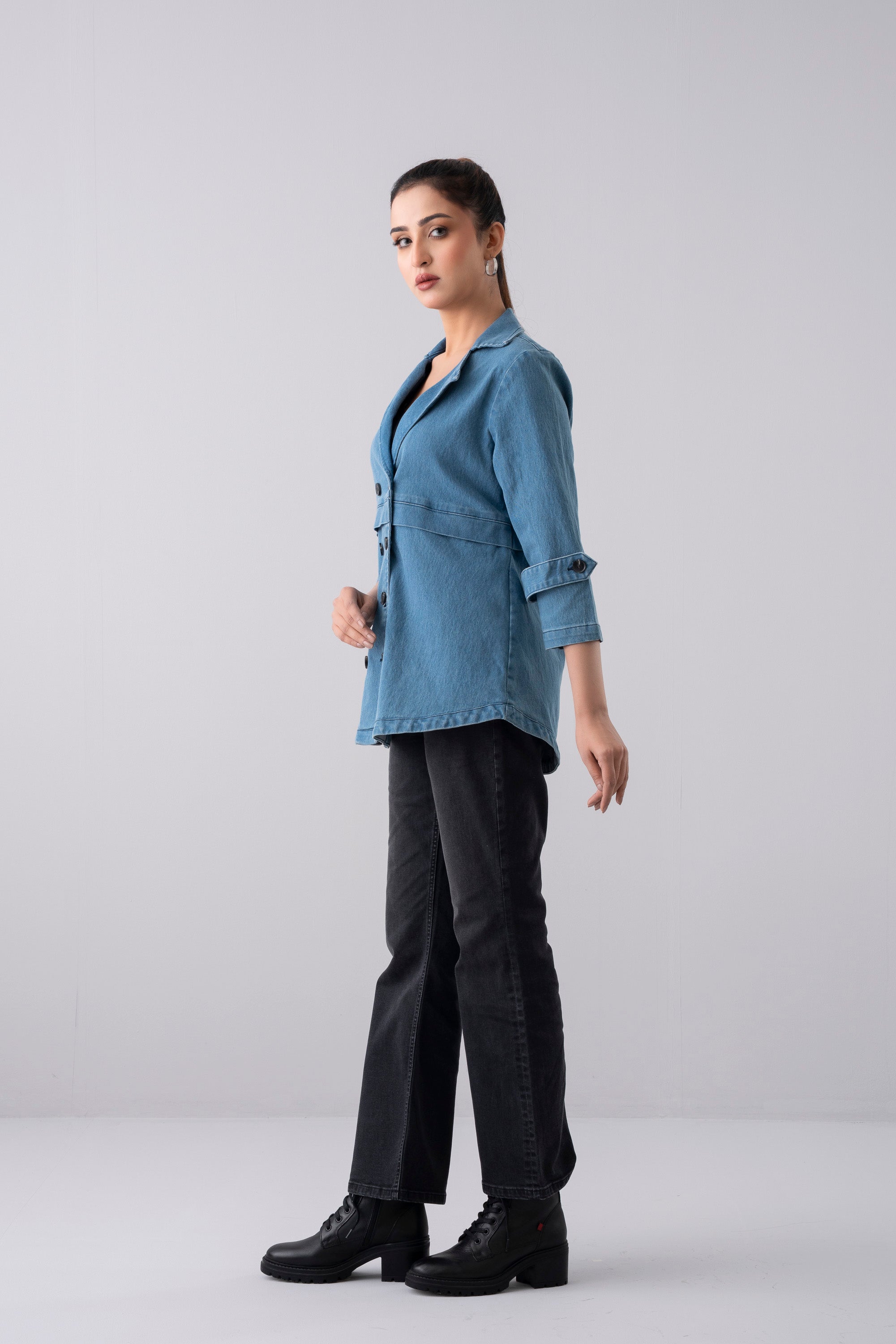 Designed in a mid-wash finish, this jacket features a classic notch lapel and double-breasted front with horn button fastening for a polished denim look. The sleeve tab and decorative waist belt add a touch of modern flair, while the comfort stretch fabric ensures ease of movement and a flattering fit perfect for effortless, everyday style.