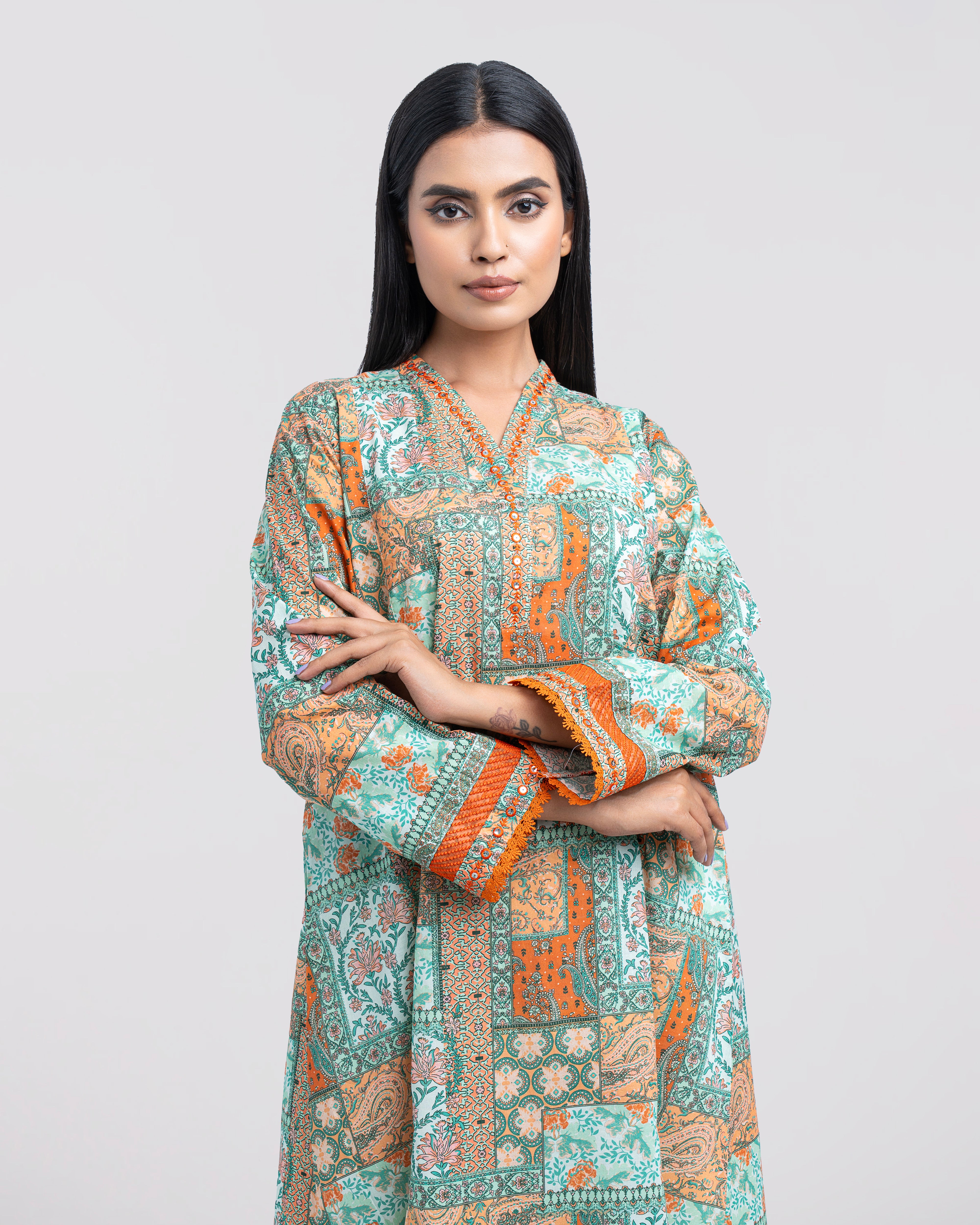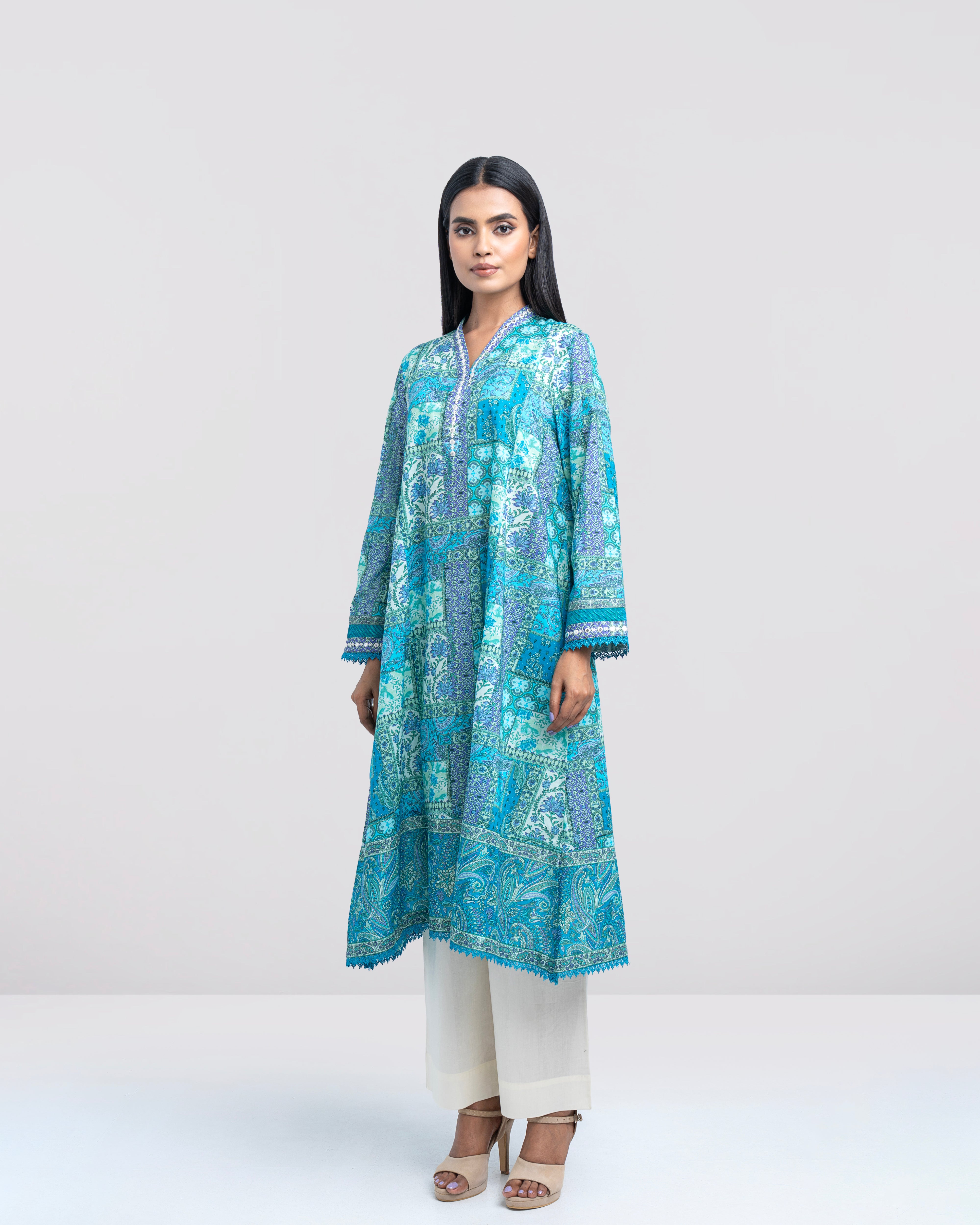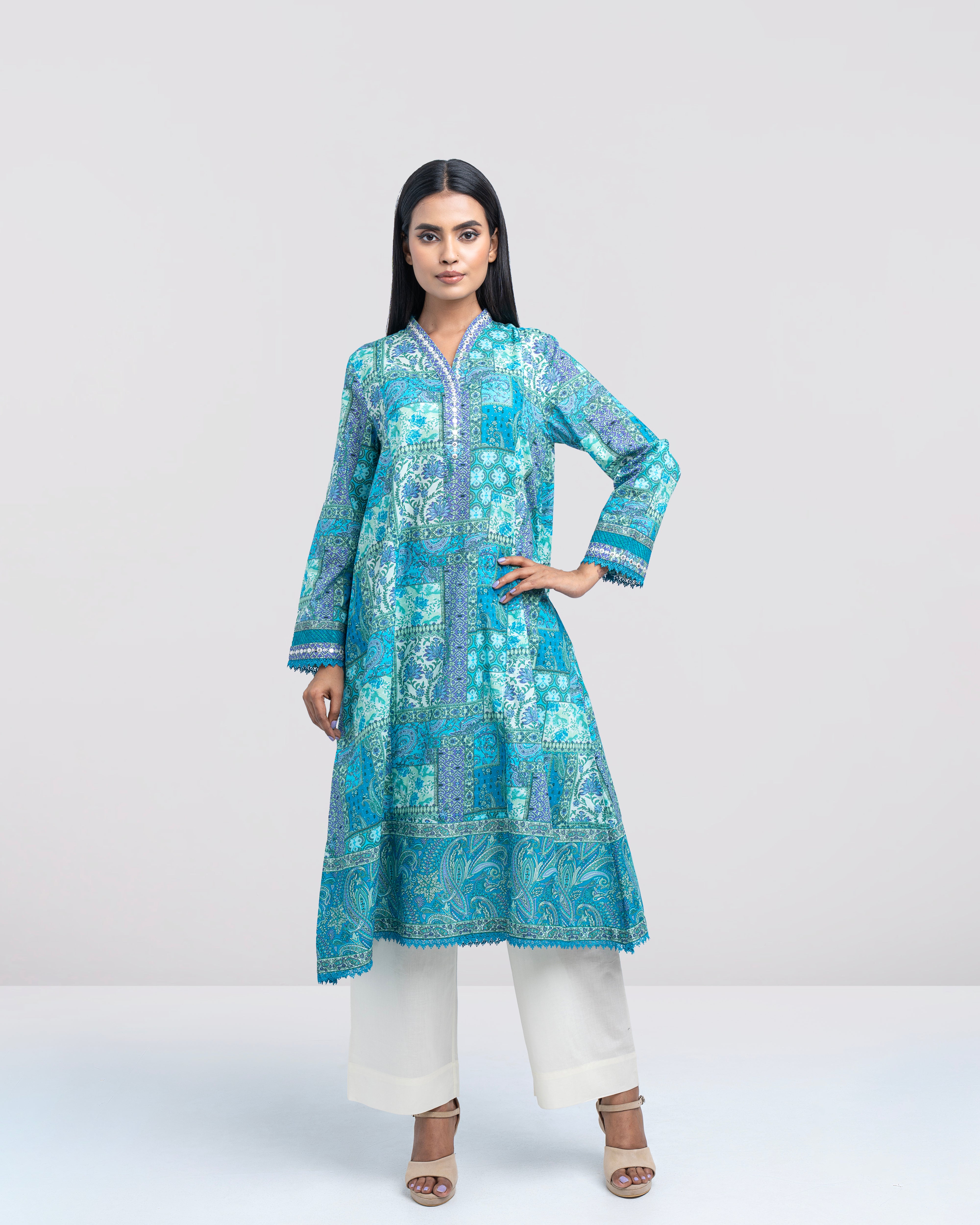 Elevate your style effortlessly with our elegant ready-to-wear 1-piece long-length, smart A-line fit digitally printed kurti. Crafted from premium lawn fabric and beautifully enhanced with delicate sequin embroidery, embroidered organza accents, panel-cut detailing, and a refined border finish. This piece perfectly blends comfort with modern sophistication—making it ideal for both casual outings and special occasions.