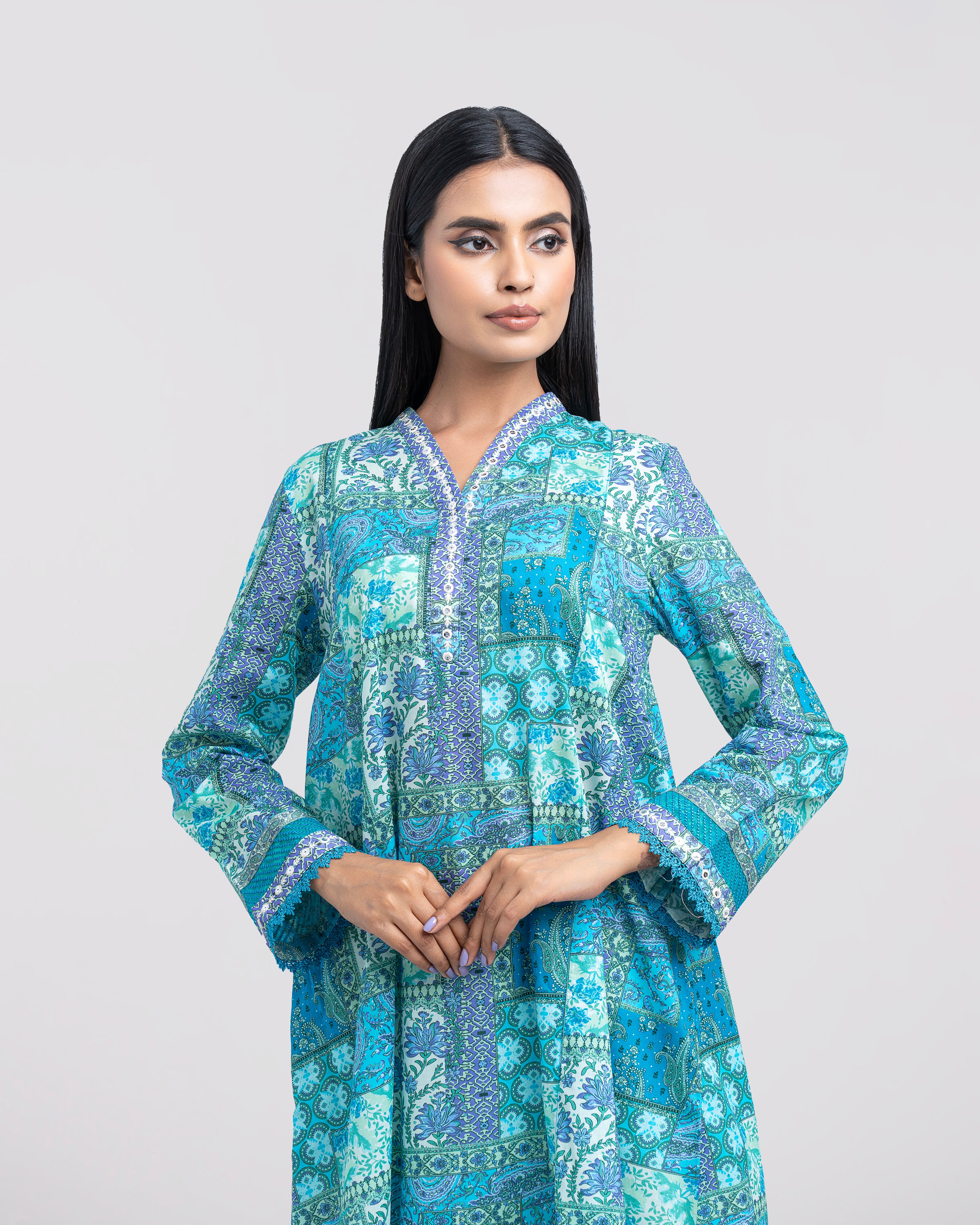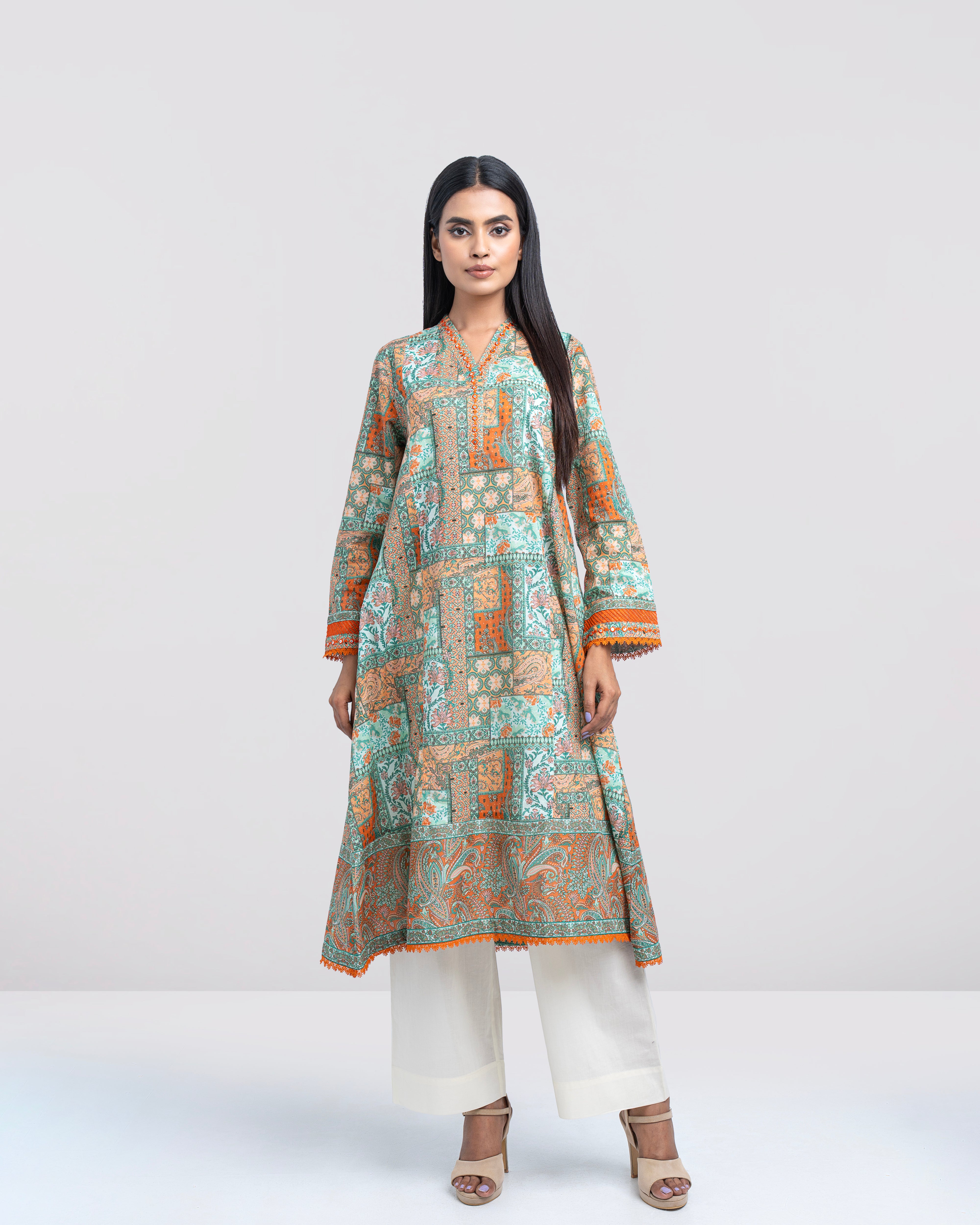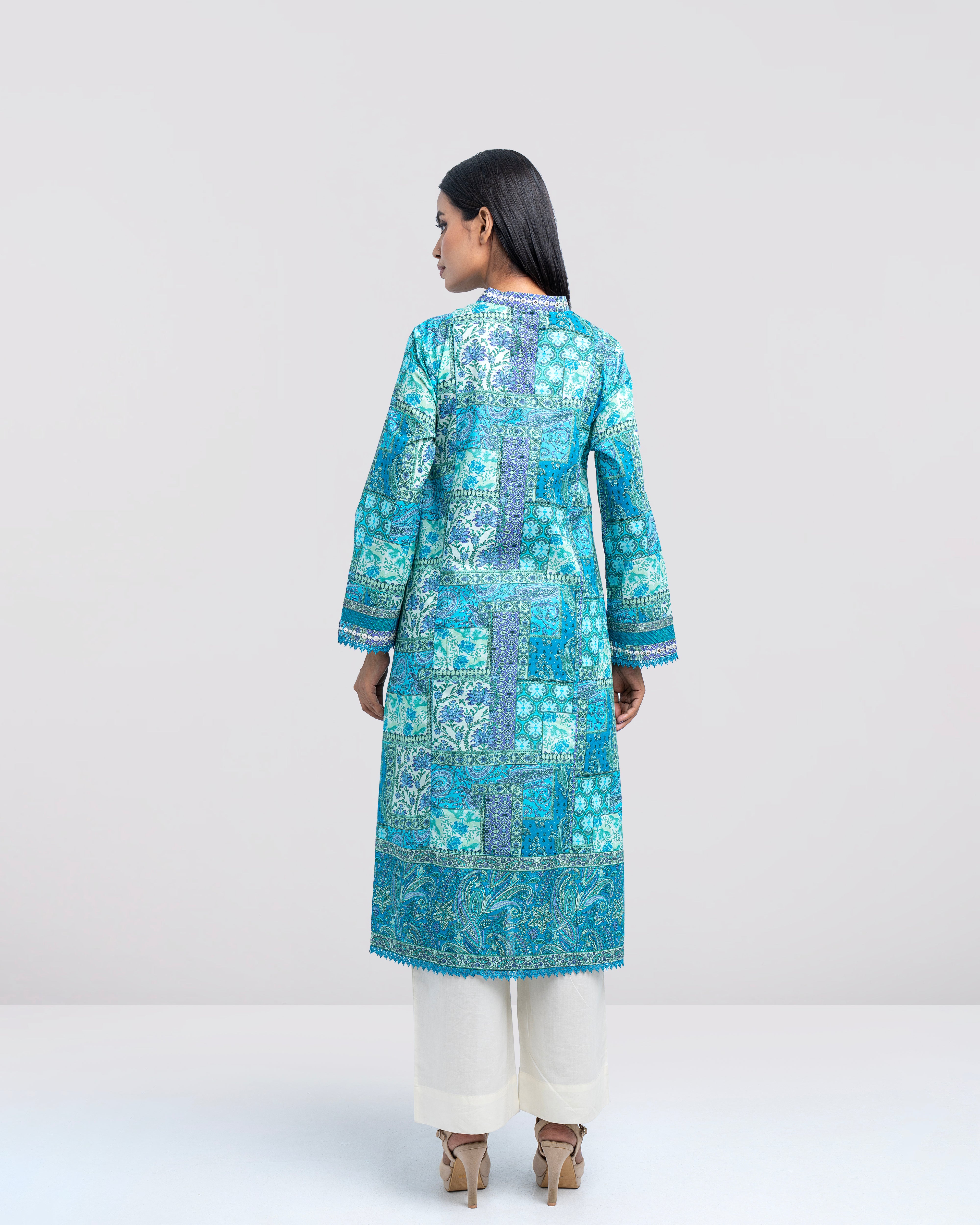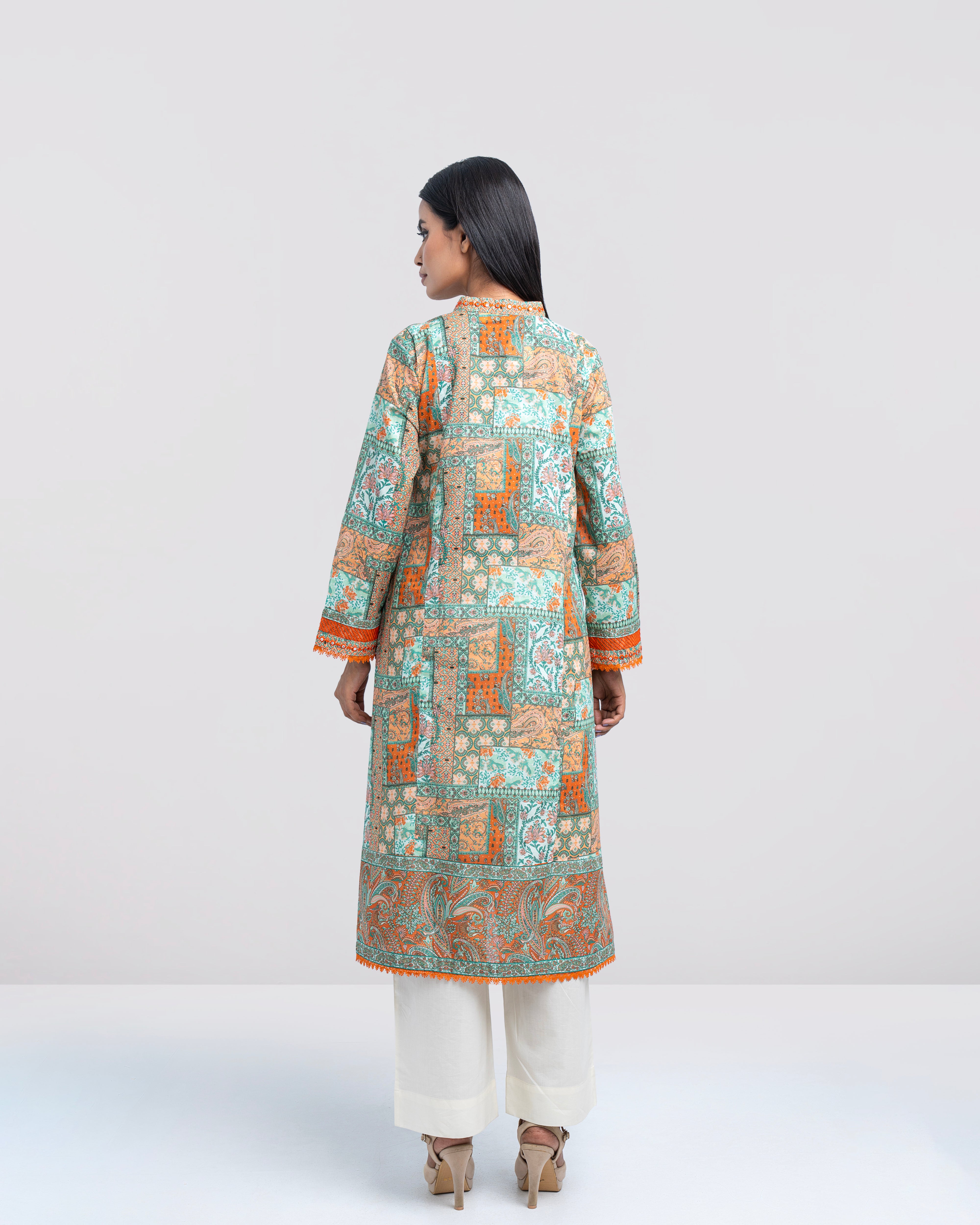 Elevate your style effortlessly with our elegant ready-to-wear 1-piece long-length, smart A-line fit digitally printed kurti. Crafted from premium lawn fabric and beautifully enhanced with delicate sequin embroidery, embroidered organza accents, panel-cut detailing, and a refined border finish. This piece perfectly blends comfort with modern sophistication—making it ideal for both casual outings and special occasions.