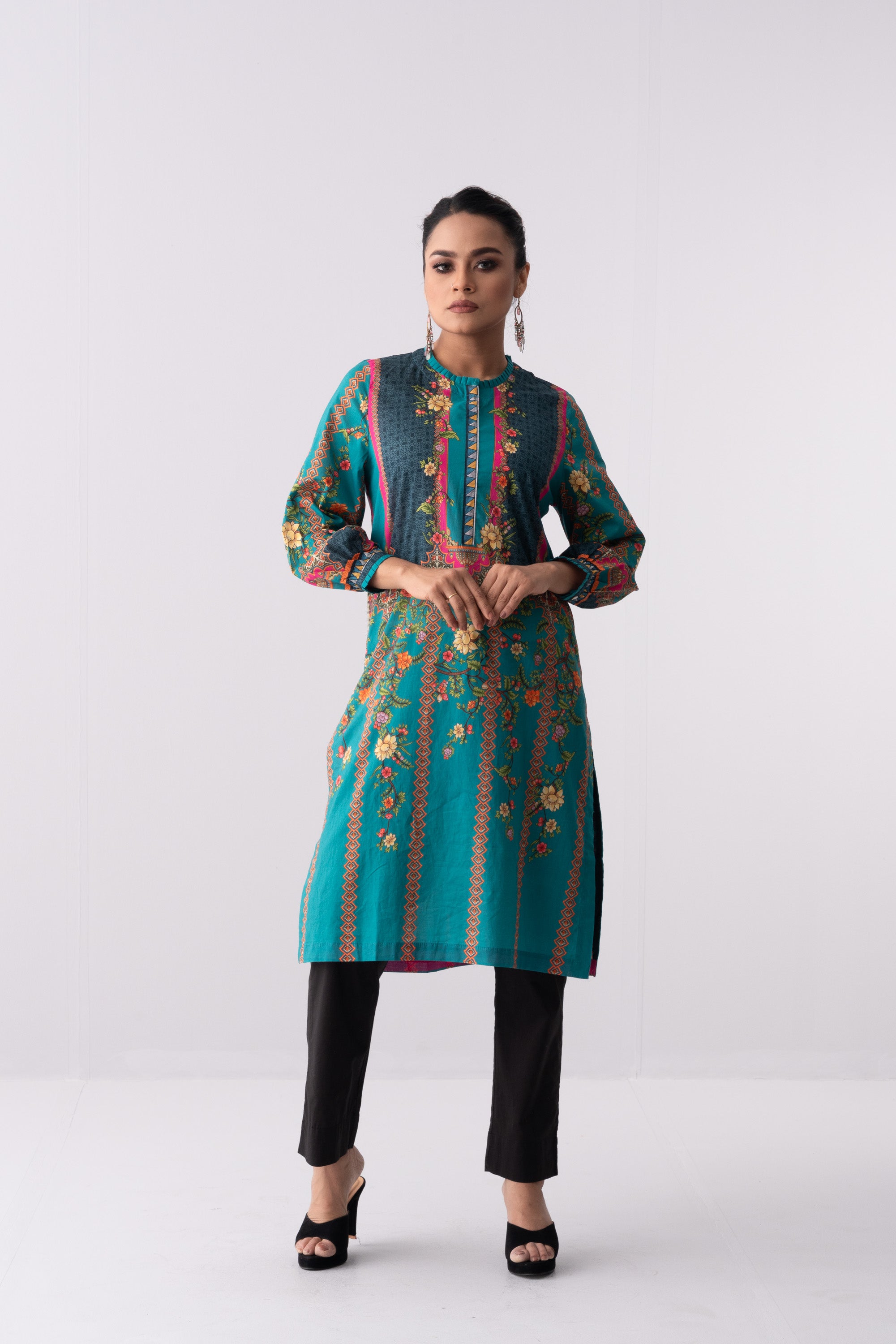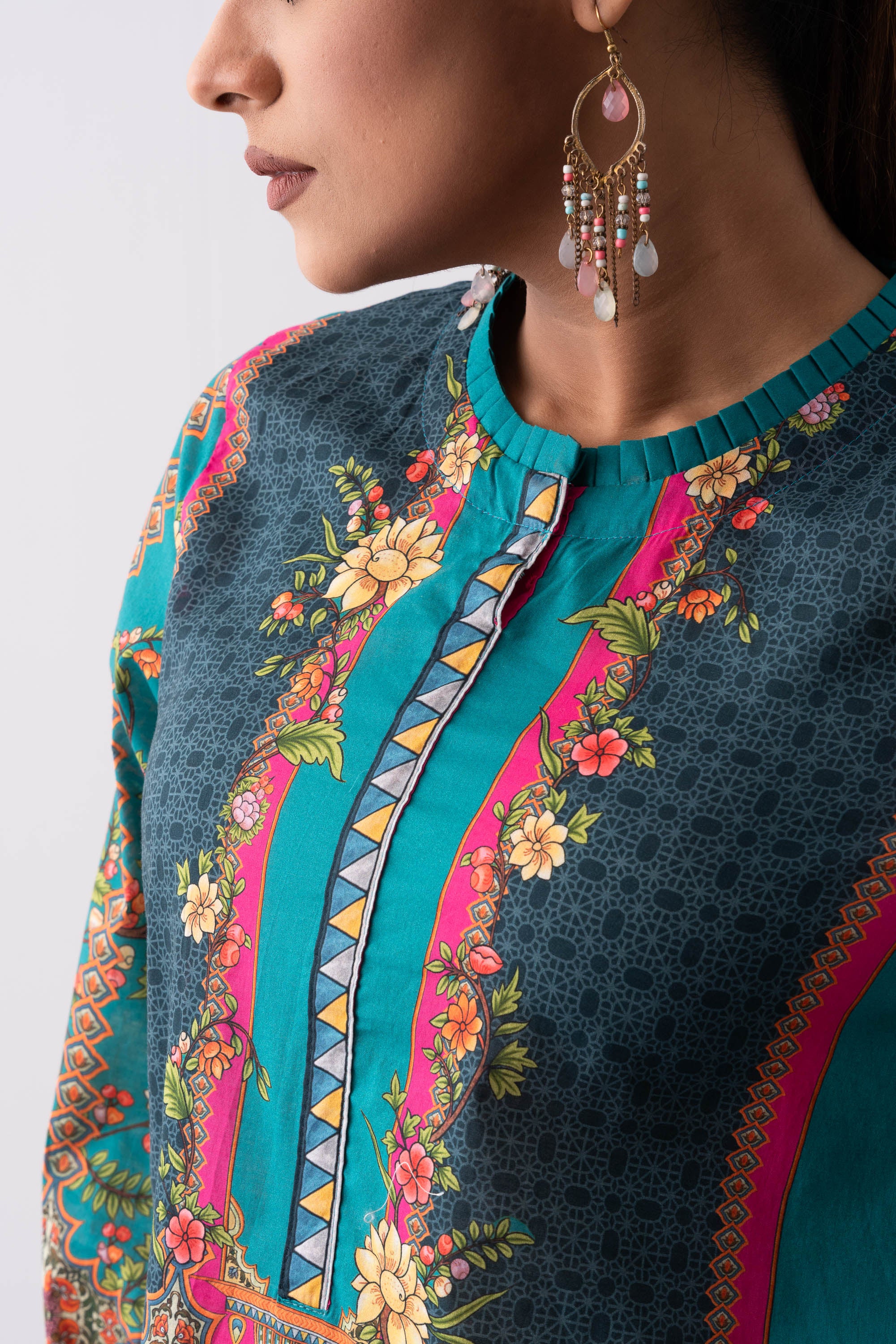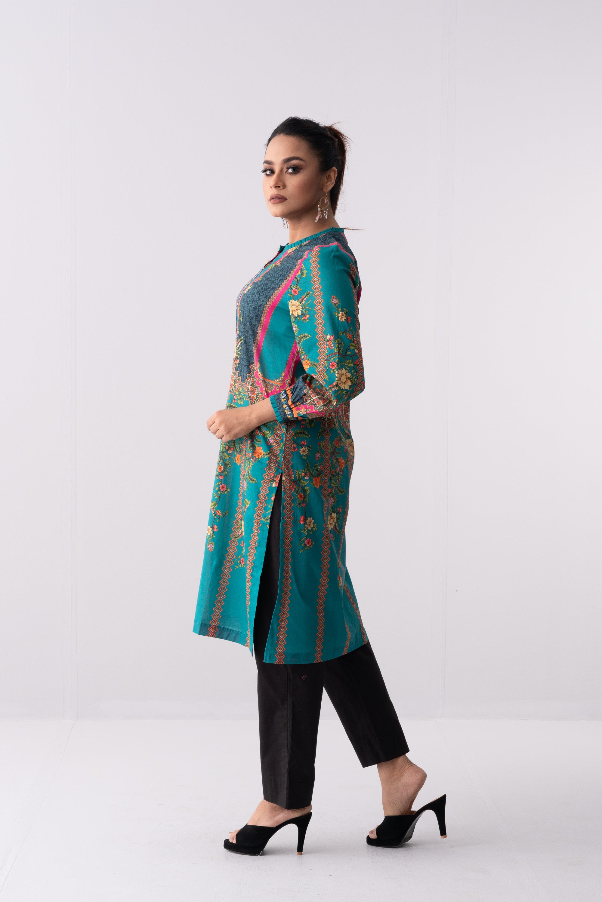 Enhance your style with ease through our stunning ready-to-wear mid-length printed kurta. Crafted from luxurious lawn fabric, this garment features a round neck with pleat, dedicated printed placket and cuff detailing which offers the perfect balance of comfort and style.