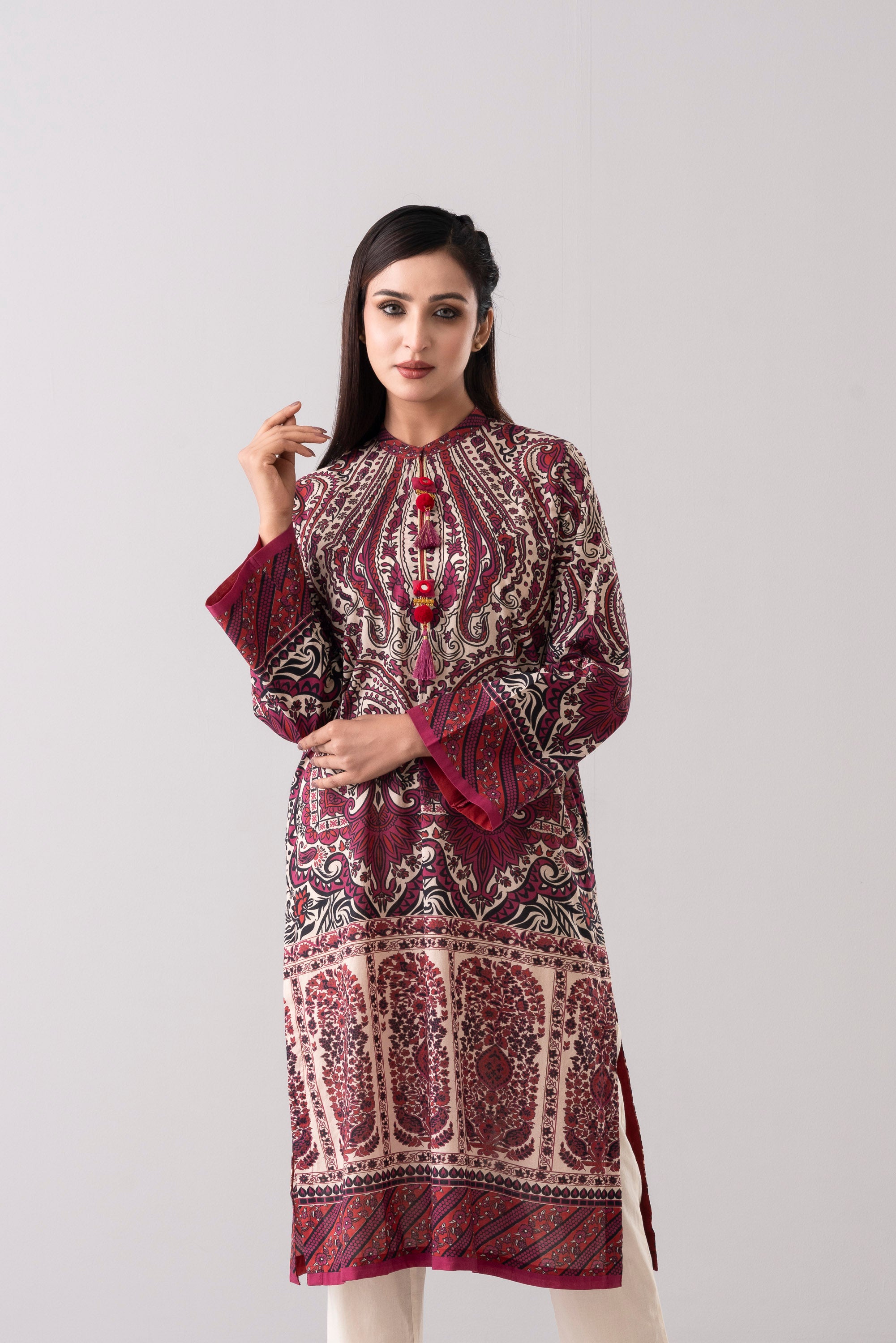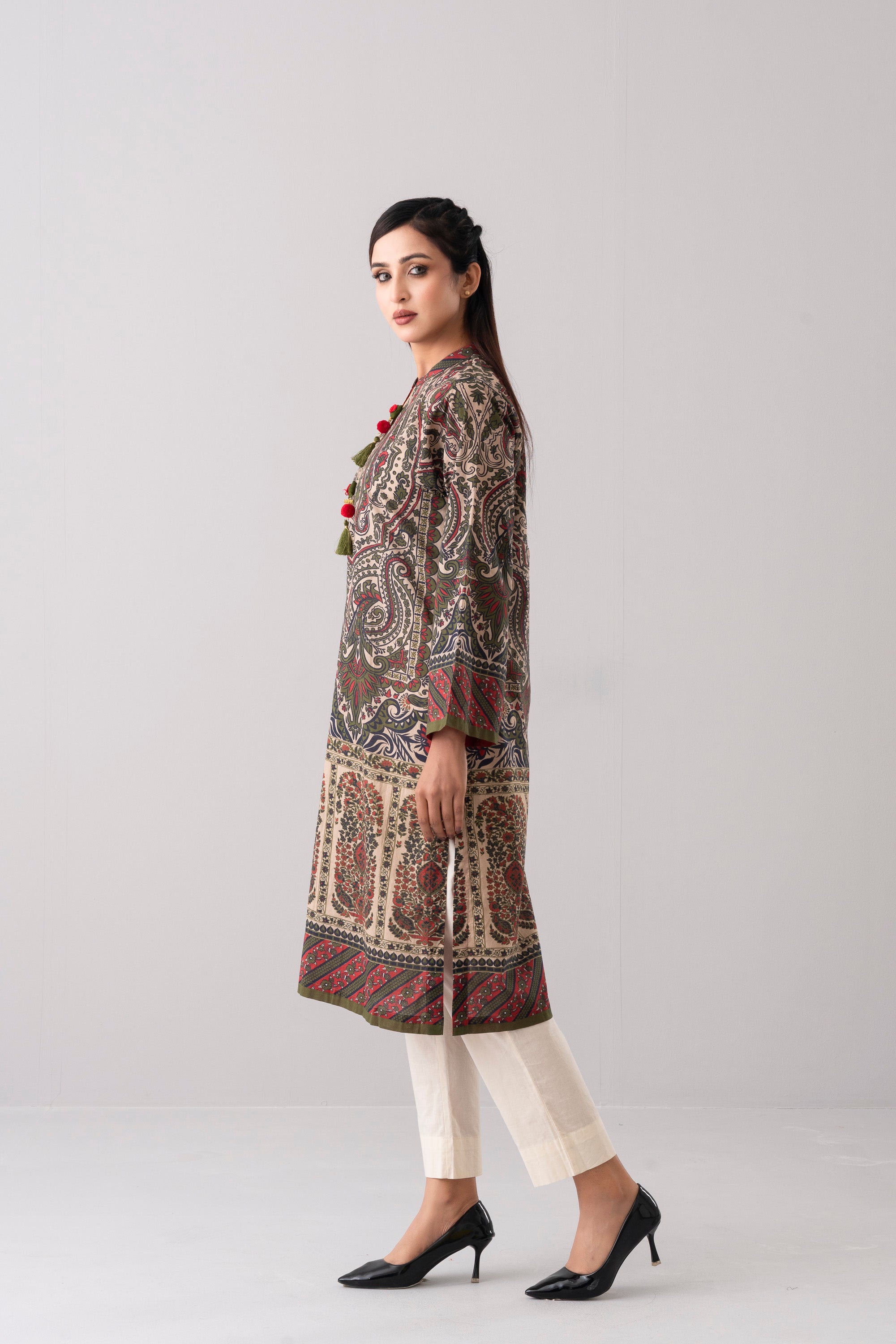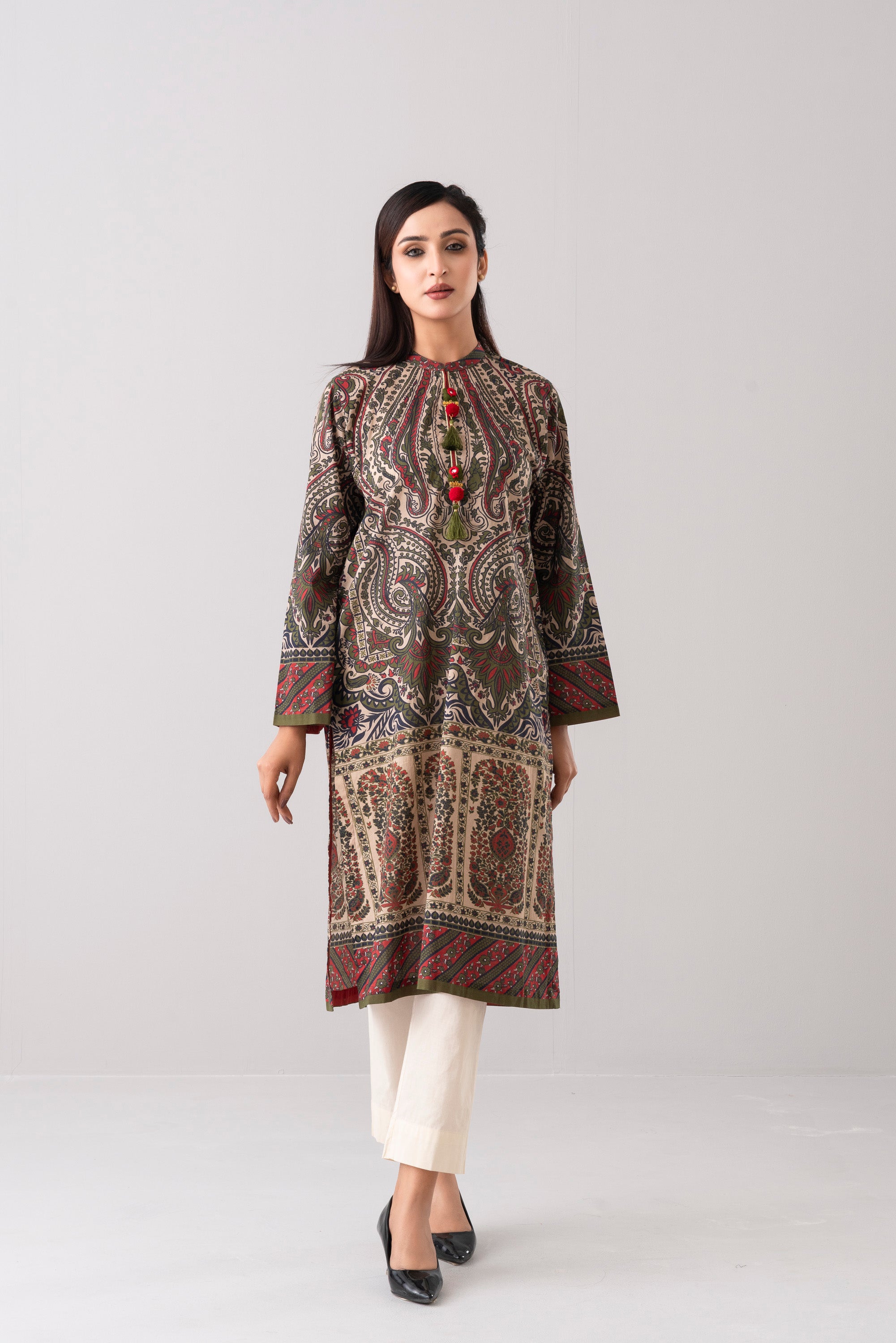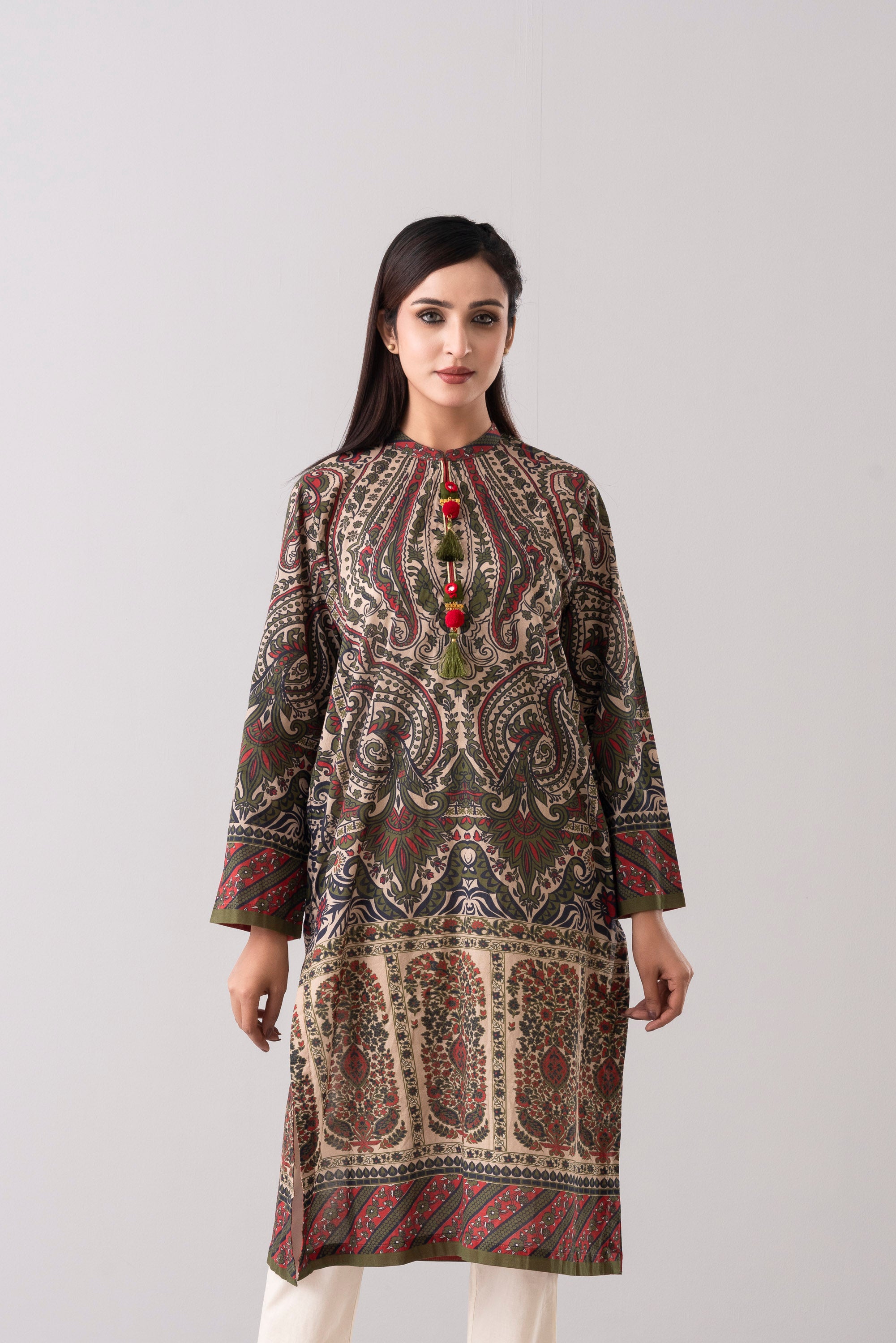 Elevate your style effortlessly with our stunning ready-to-wear 1-piece long-length relaxed fit printed kurti. Crafted from luxurious lawn fabric and adorned with decorative tassels and gold lace detailing. It seamlessly combines comfort and chic. Embrace understated elegance for any occasion.