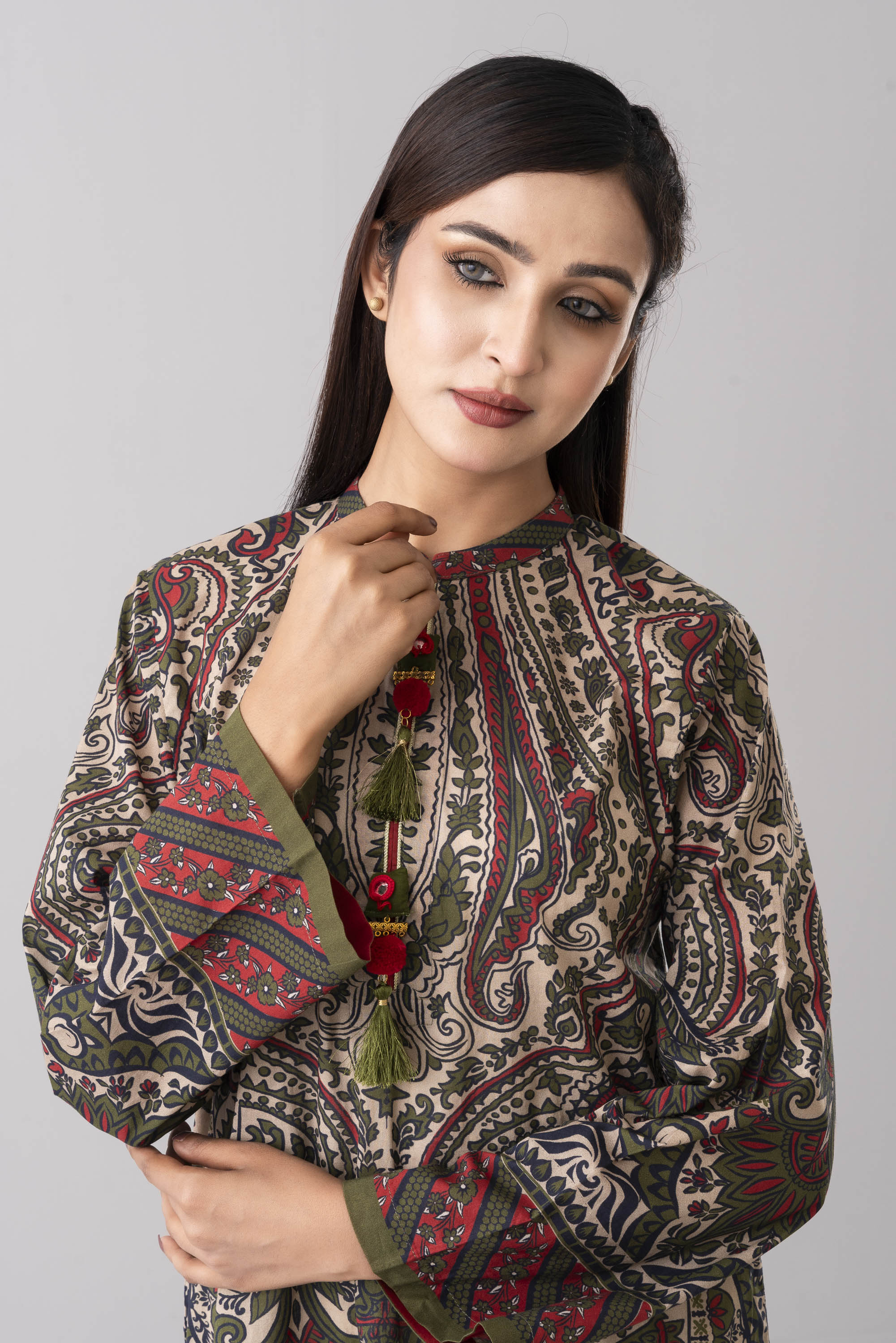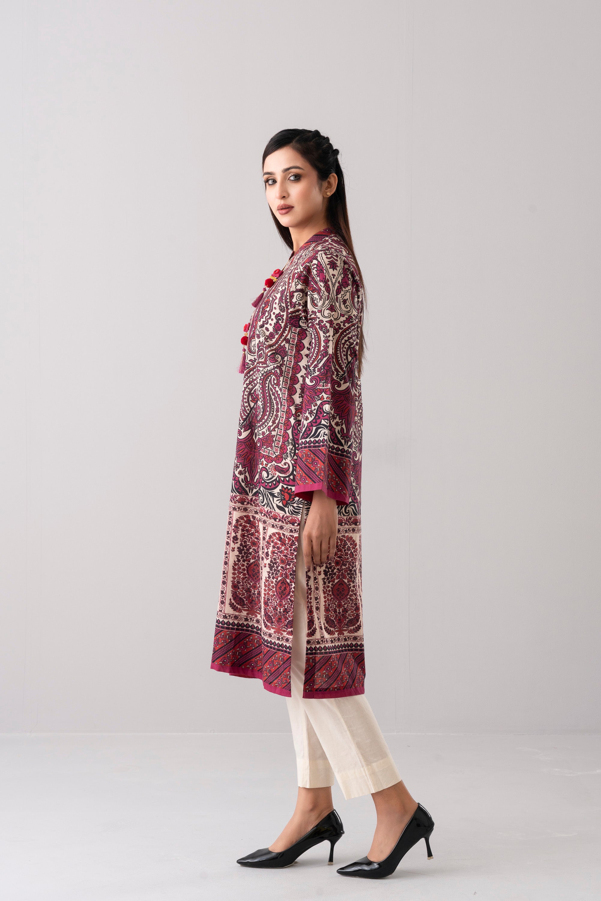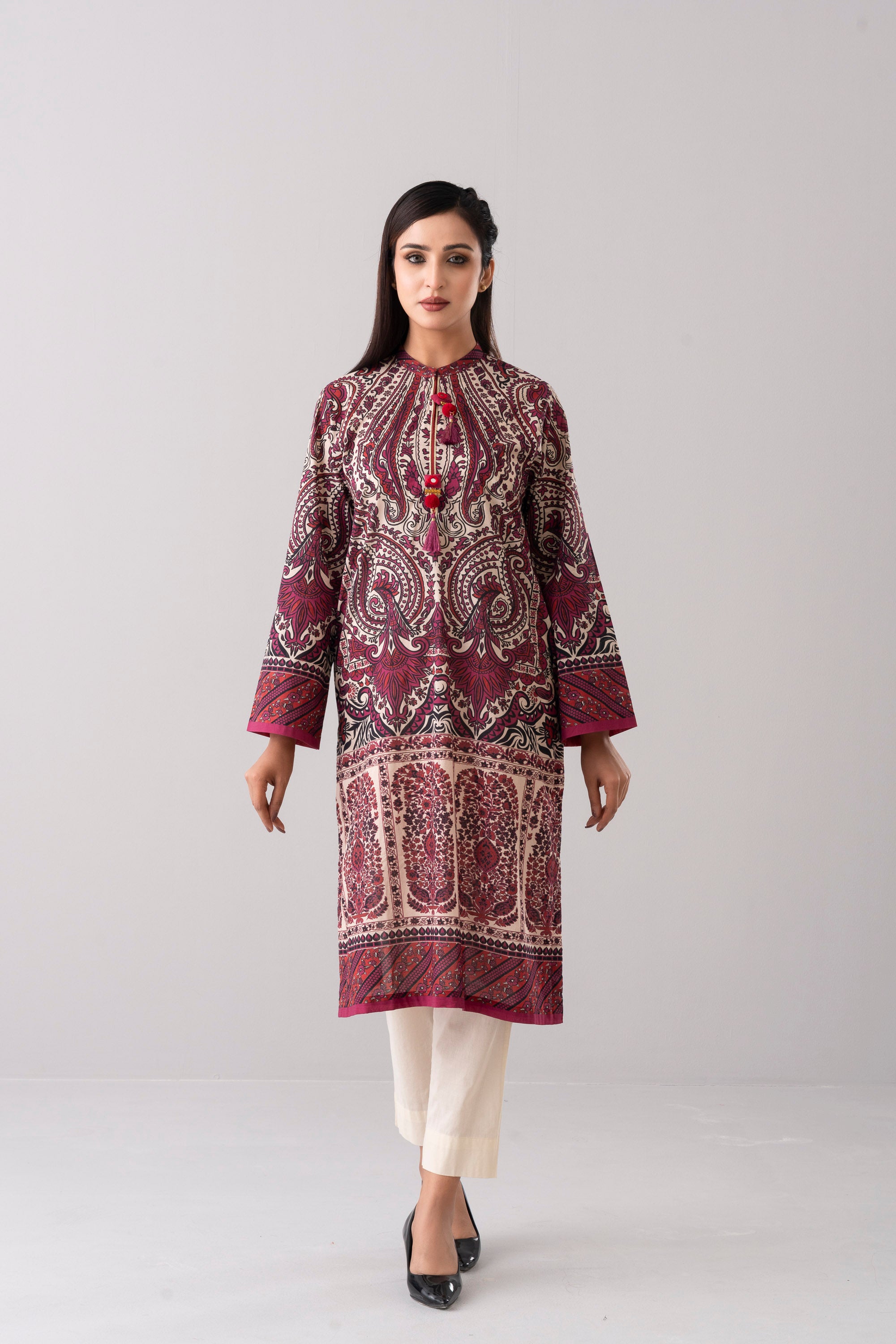 Elevate your style effortlessly with our stunning ready-to-wear 1-piece long-length relaxed fit printed kurti. Crafted from luxurious lawn fabric and adorned with decorative tassels and gold lace detailing. It seamlessly combines comfort and chic. Embrace understated elegance for any occasion.