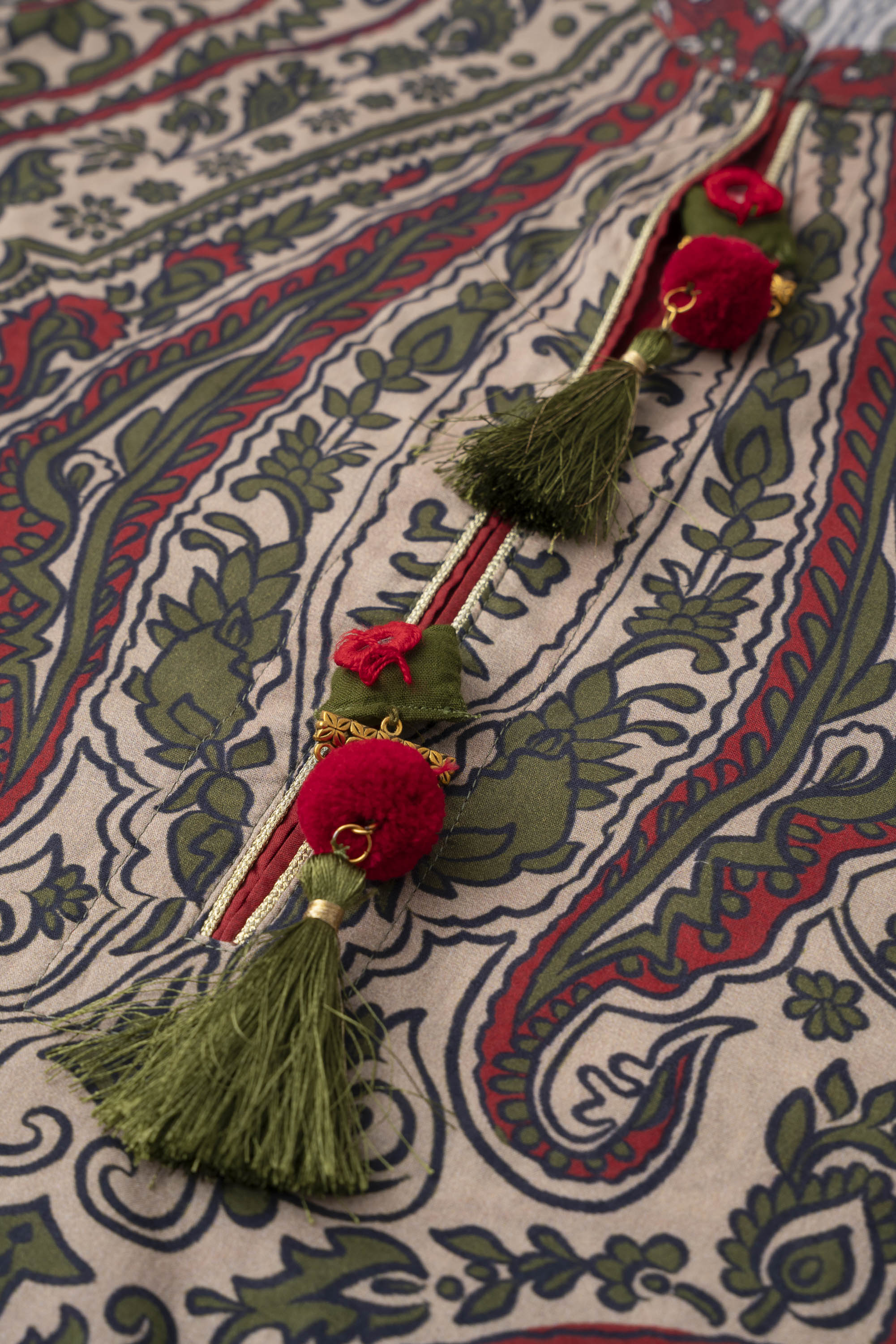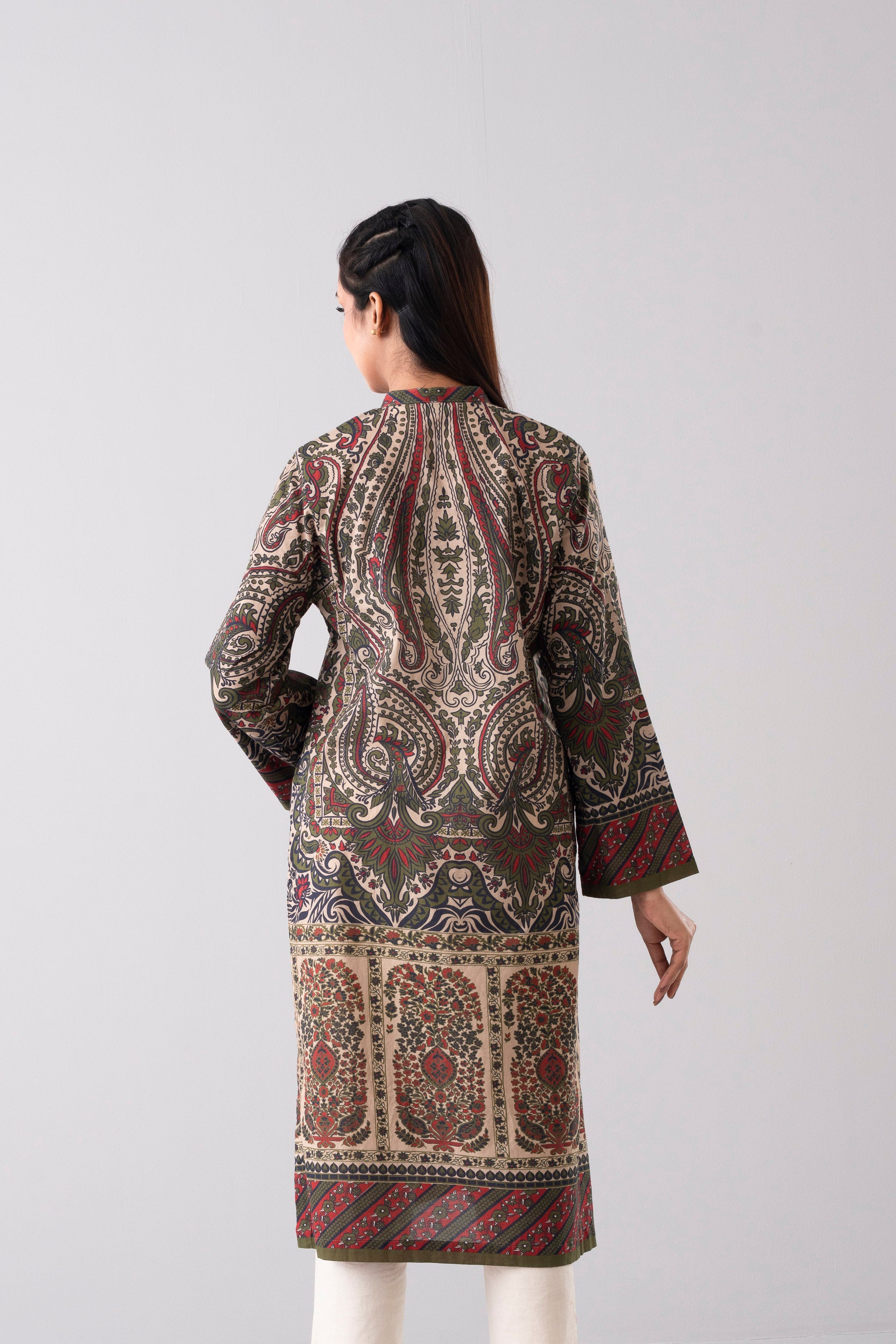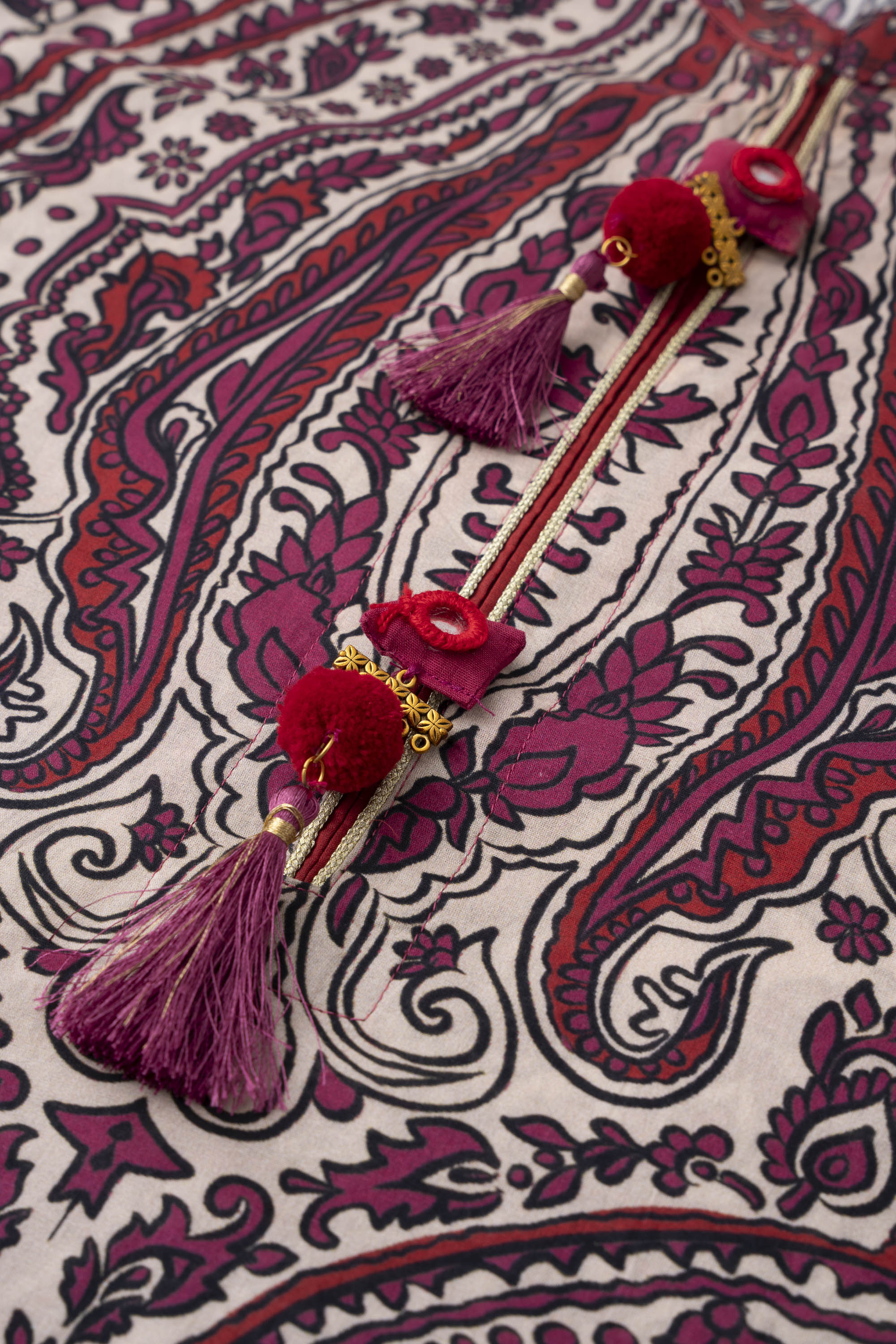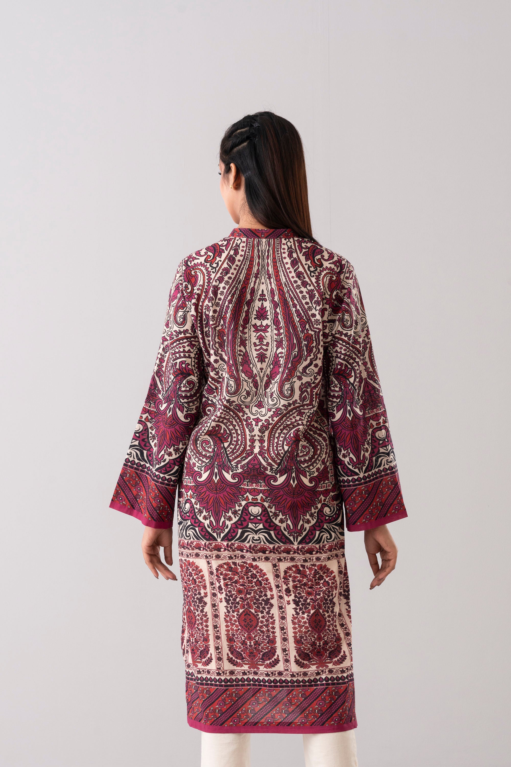 Elevate your style effortlessly with our stunning ready-to-wear 1-piece long-length relaxed fit printed kurti. Crafted from luxurious lawn fabric and adorned with decorative tassels and gold lace detailing. It seamlessly combines comfort and chic. Embrace understated elegance for any occasion.