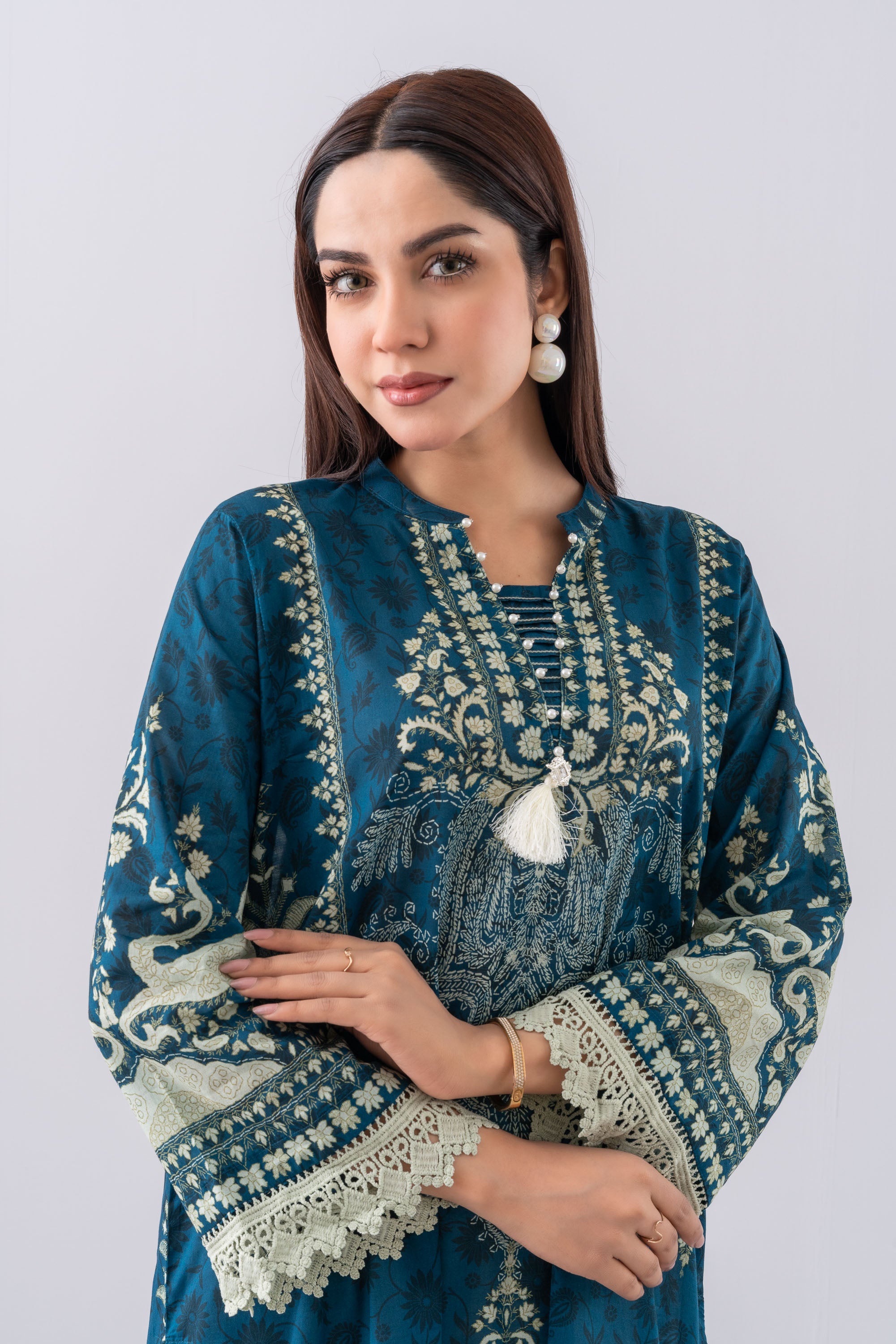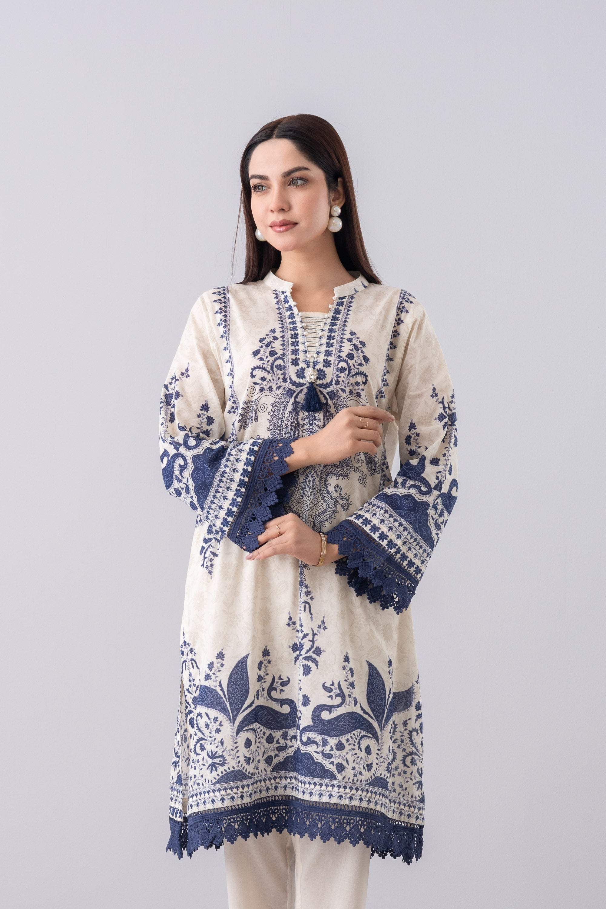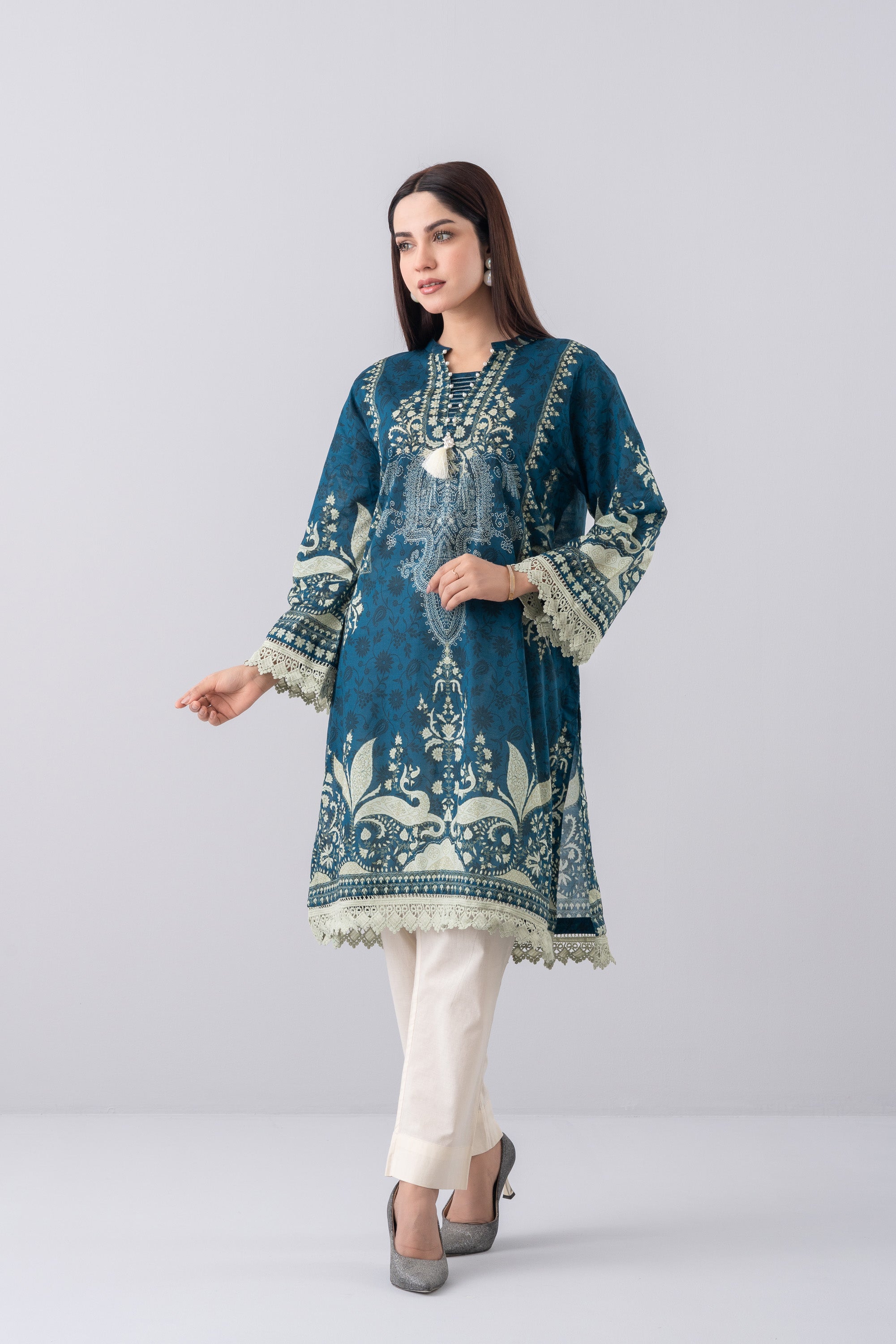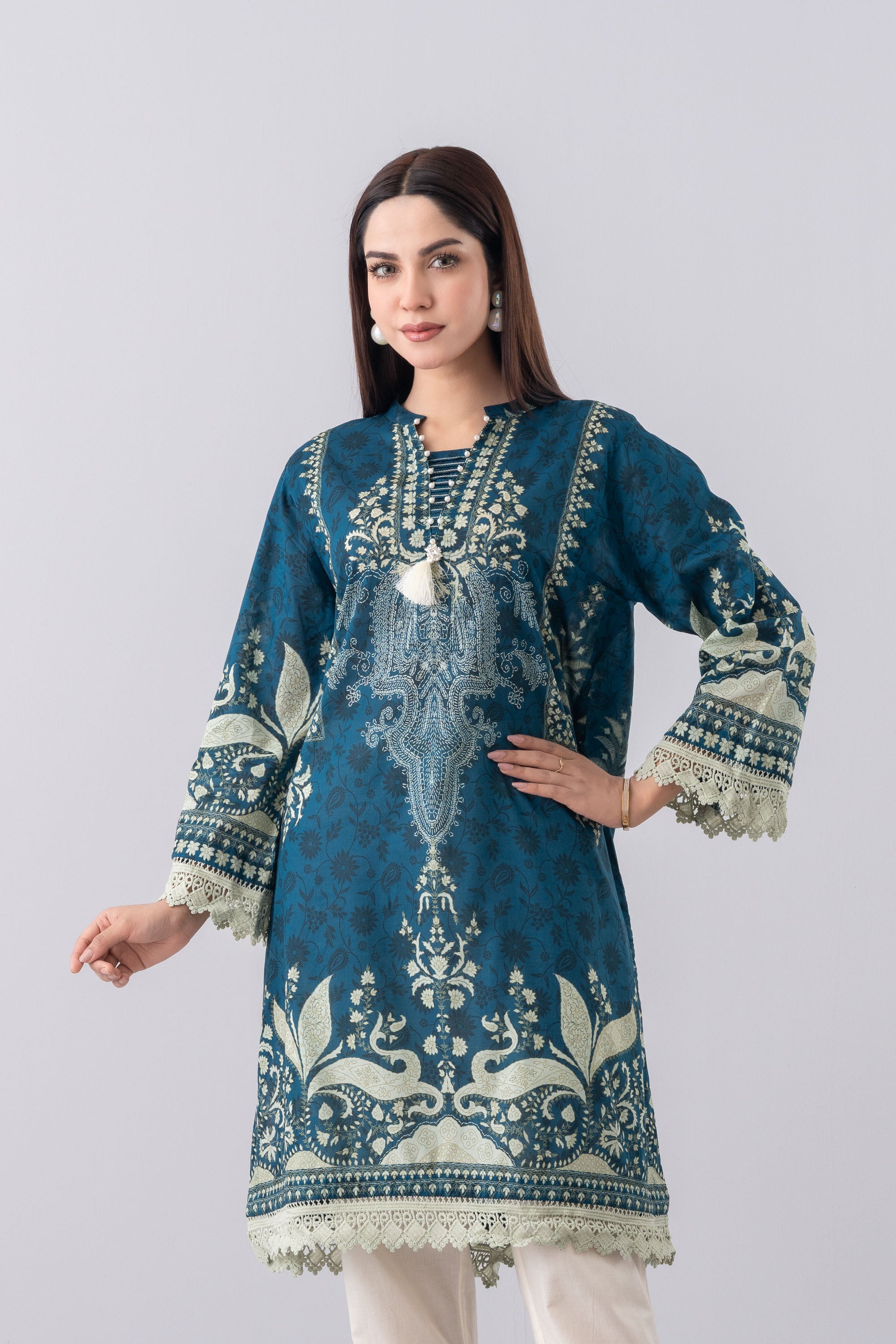 Elevate your style effortlessly with our stunning ready-to-wear 1-piece long-length, relaxed-fit digitally printed kurti. Crafted from luxurious lawn fabric and beautifully enhanced with decorative lace, pintucks with contrast chain-stitch detailing at the neck gusset, delicate pearl accents, and a charming decorative tassel. This piece perfectly blends comfort with chic sophistication—ideal for any occasion.
