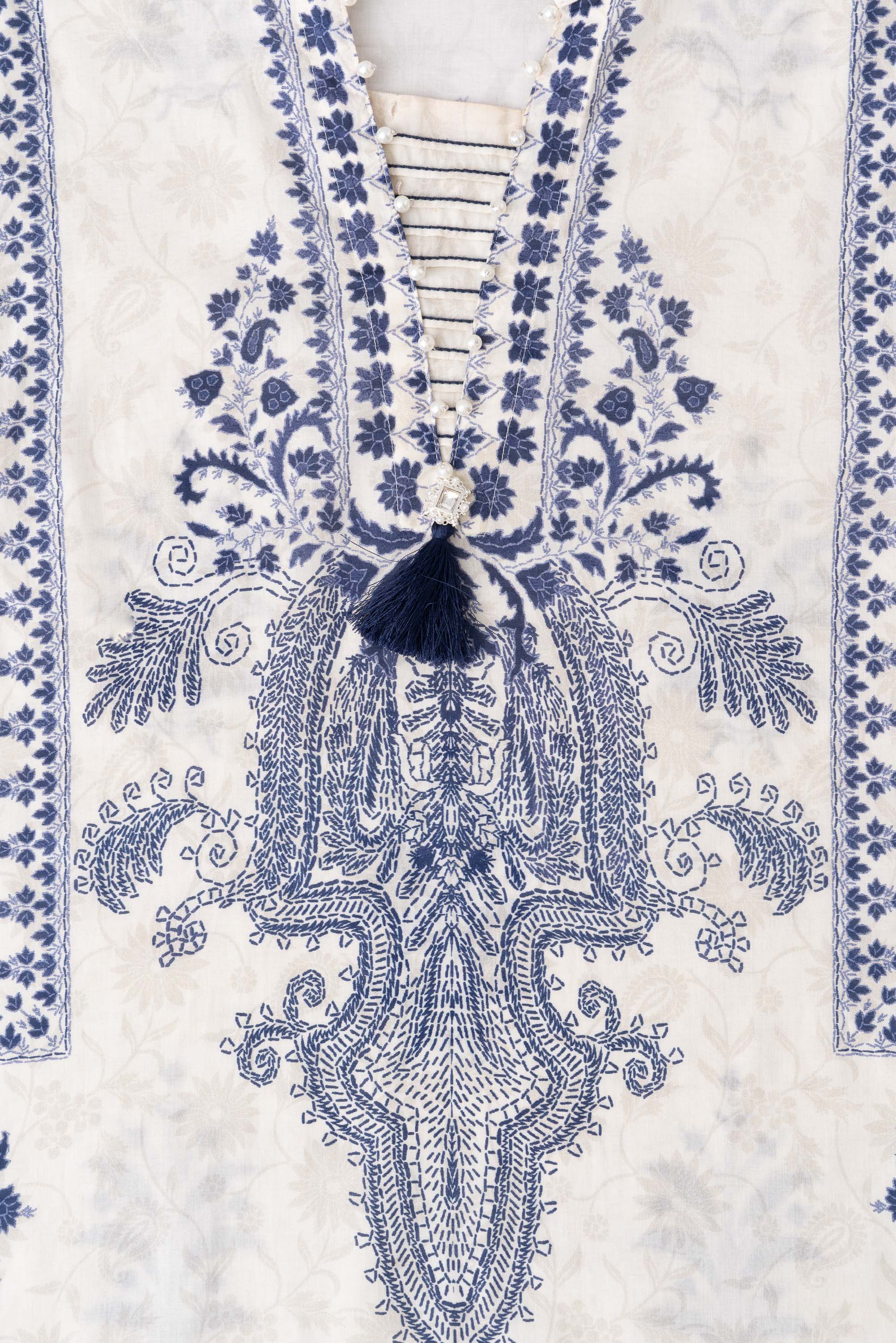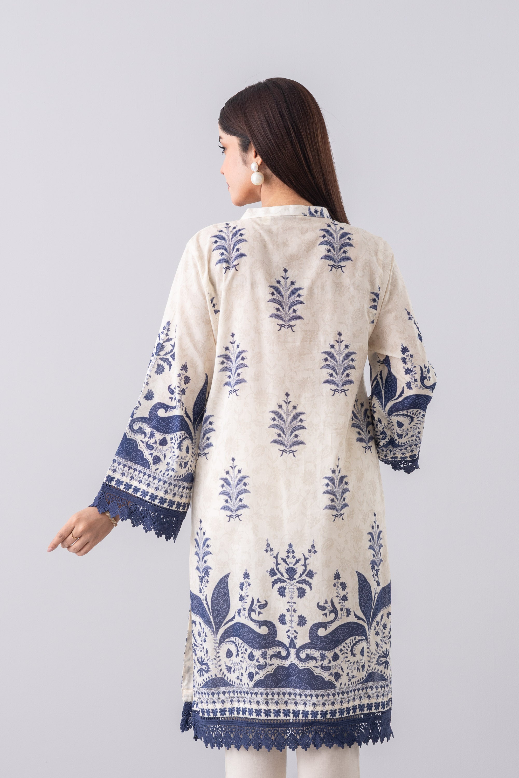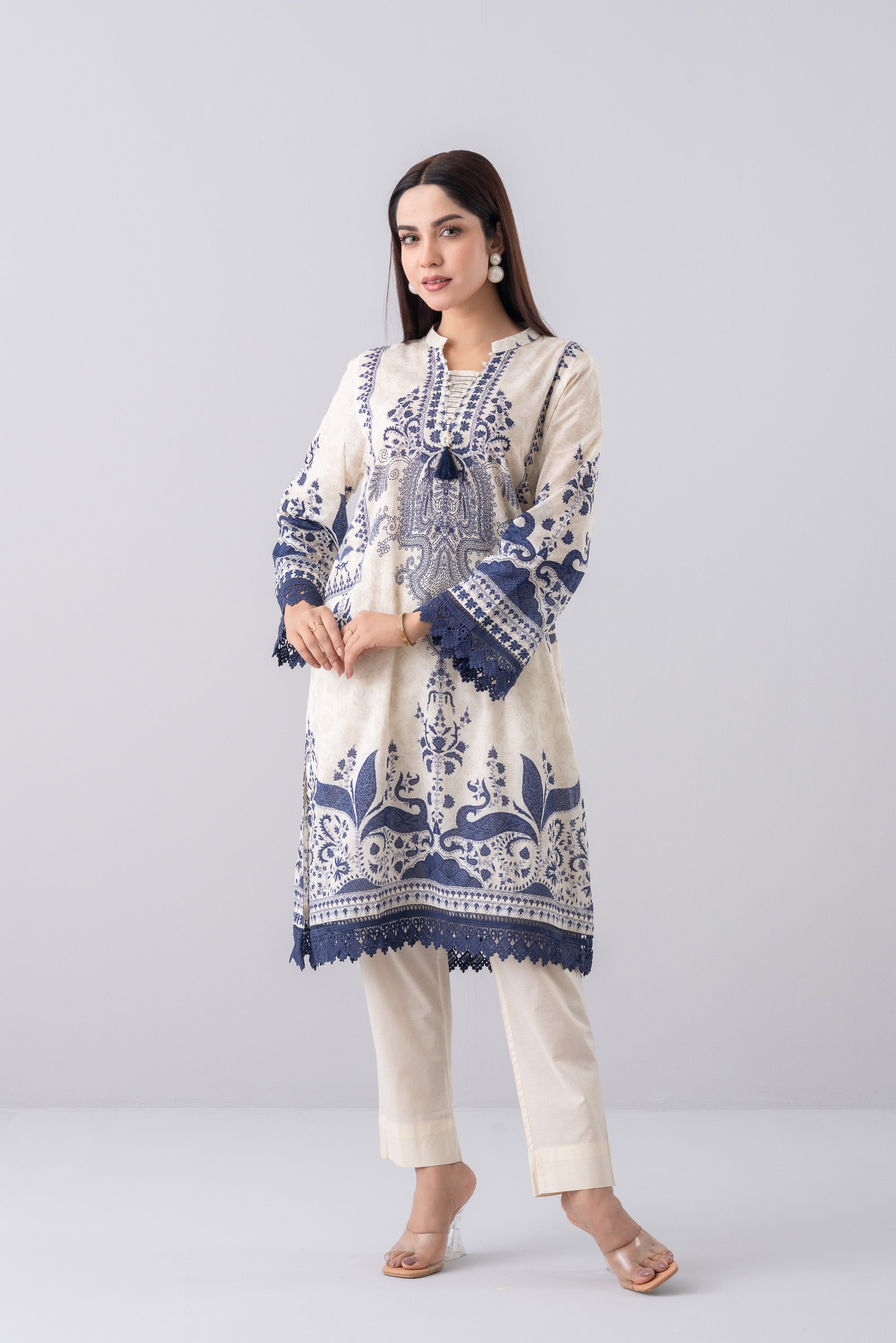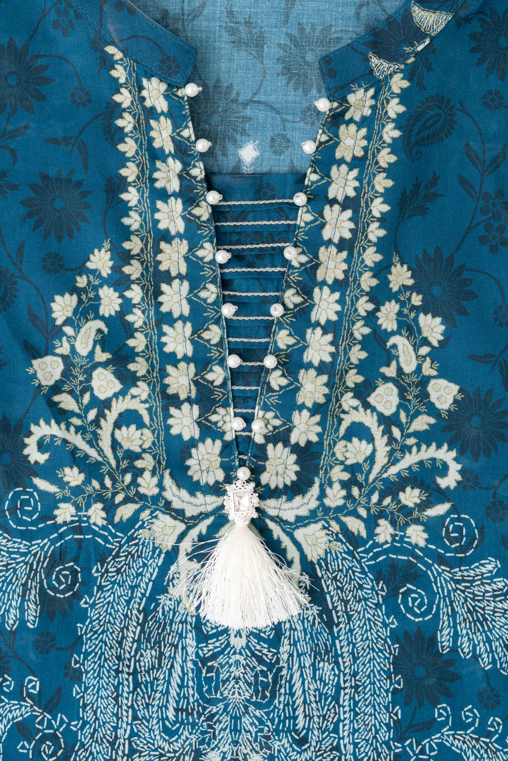 Elevate your style effortlessly with our stunning ready-to-wear 1-piece long-length, relaxed-fit digitally printed kurti. Crafted from luxurious lawn fabric and beautifully enhanced with decorative lace, pintucks with contrast chain-stitch detailing at the neck gusset, delicate pearl accents, and a charming decorative tassel. This piece perfectly blends comfort with chic sophistication—ideal for any occasion.
