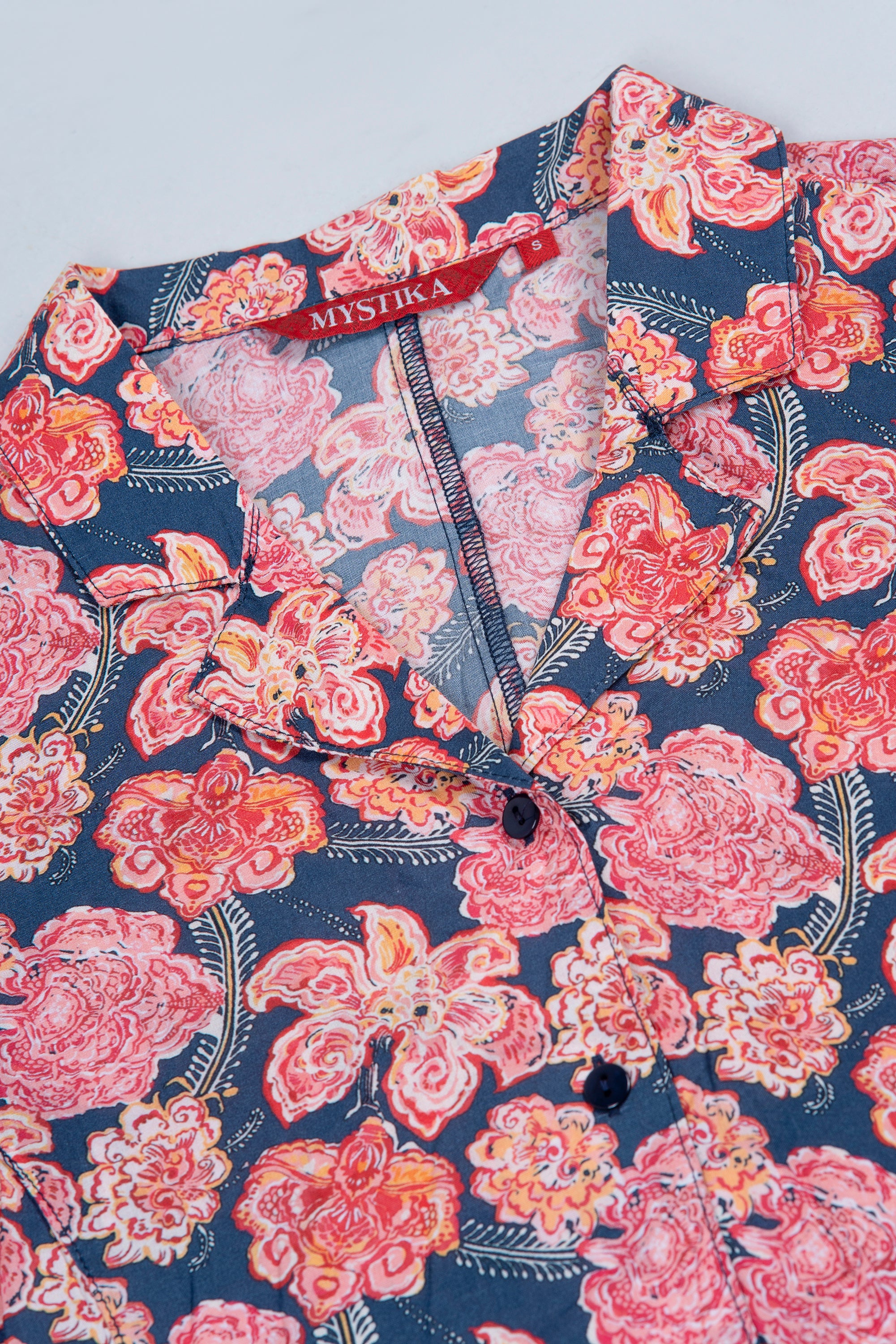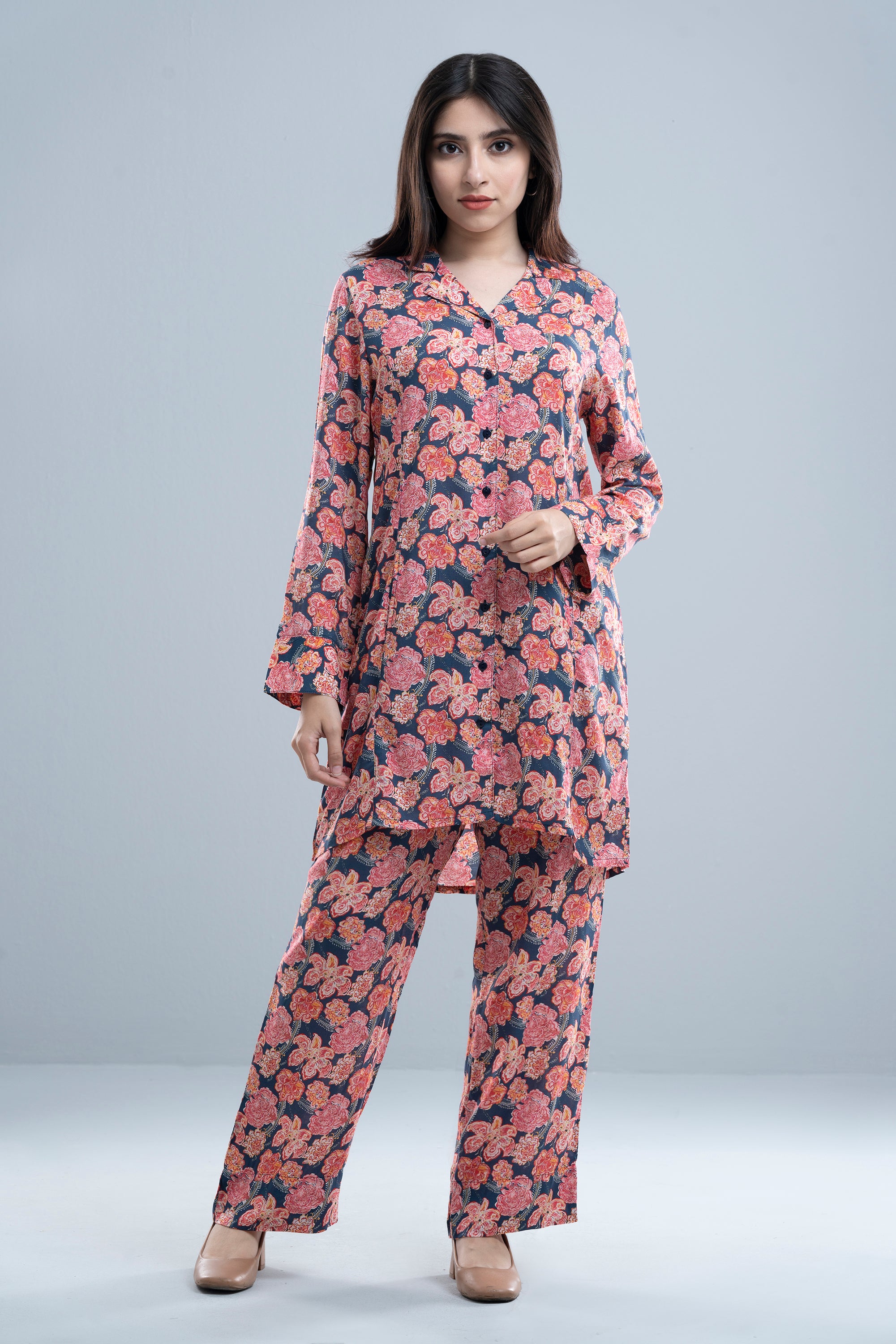 Step into effortless elegance with this women’s co-ord set, designed for both comfort and style. Featuring a soft-touch fabric and a vibrant all-over floral print, the top is styled with a Cuban collar, full-length sleeves, and structured shirt cuffs. The matching trousers offer a relaxed fit with an elasticated waistband, making this set ideal for both lounging and casual outings.