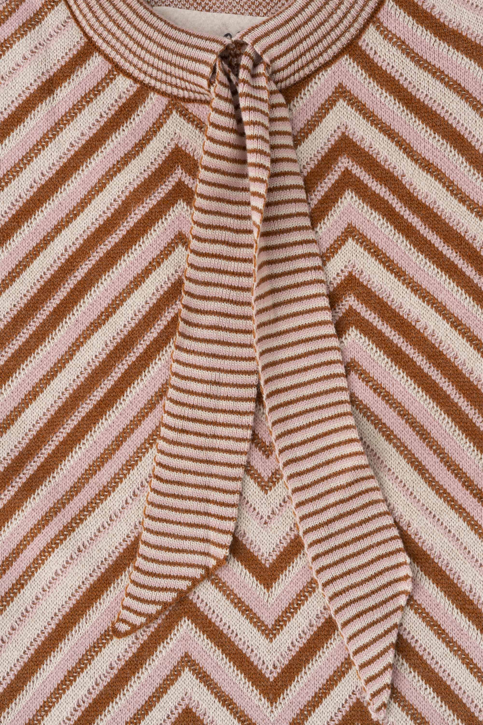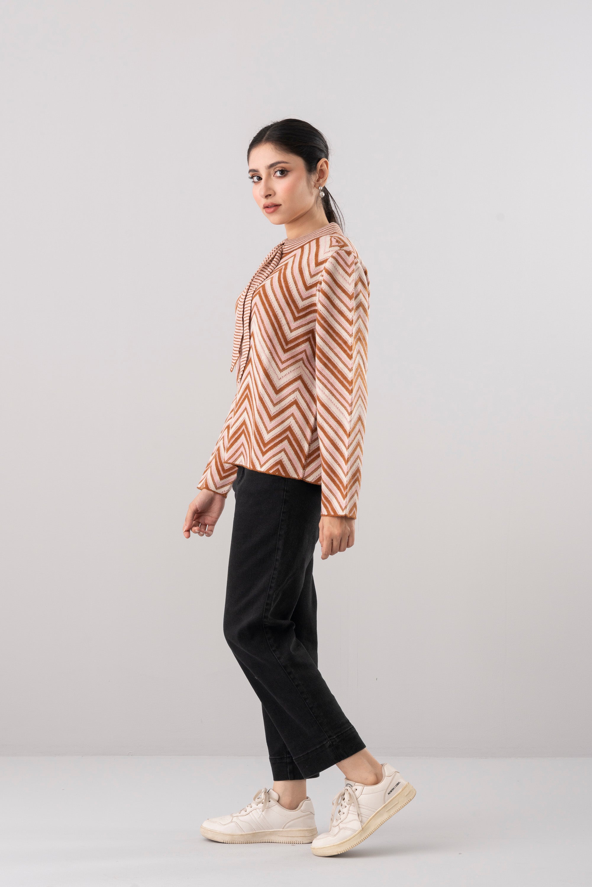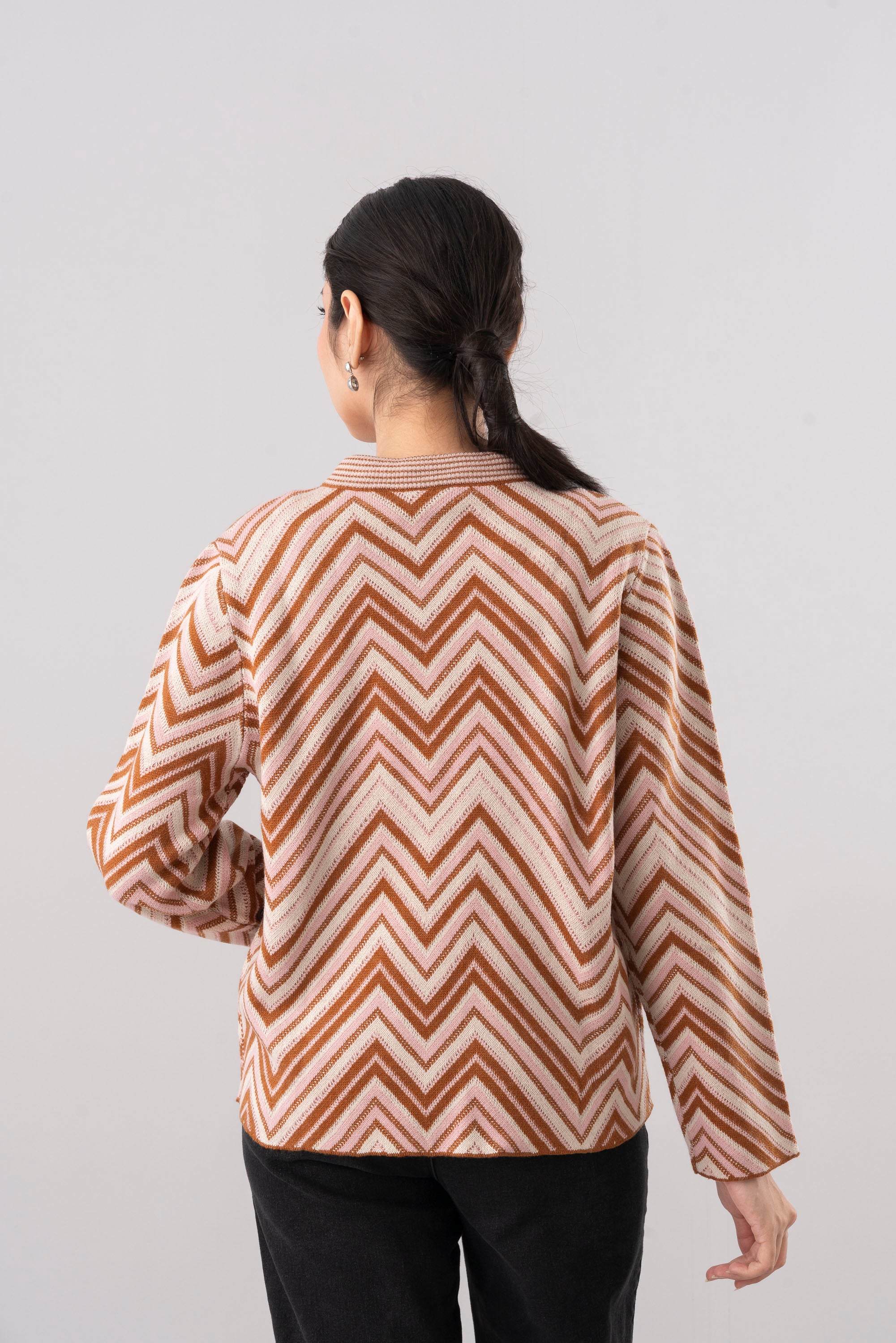 The soft knit construction ensures cozy warmth, and the intricate zigzag pattern adds depth and personality—making this sweater perfect for everyday wear, weekend outings, or layering over dresses and high-waist bottoms.