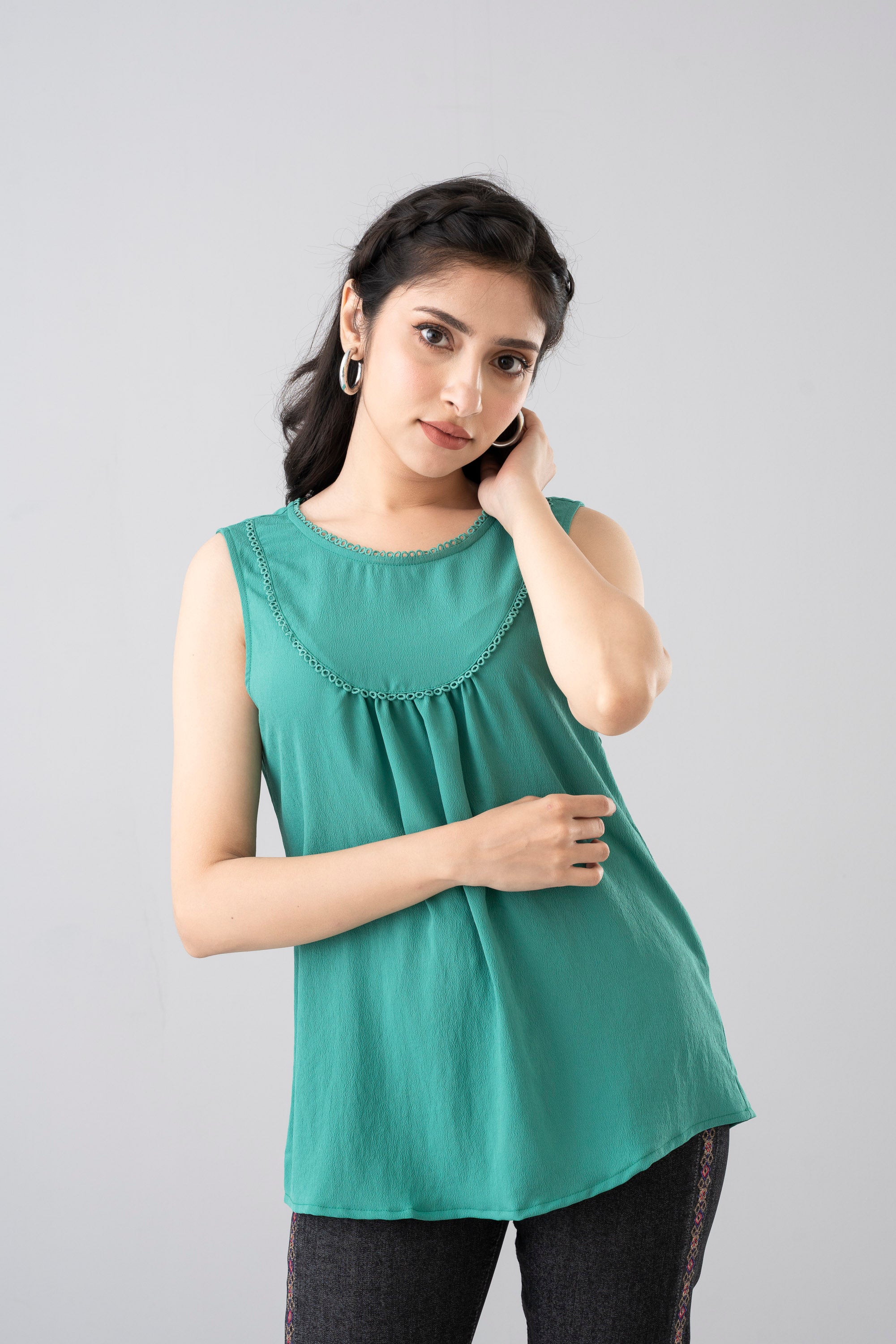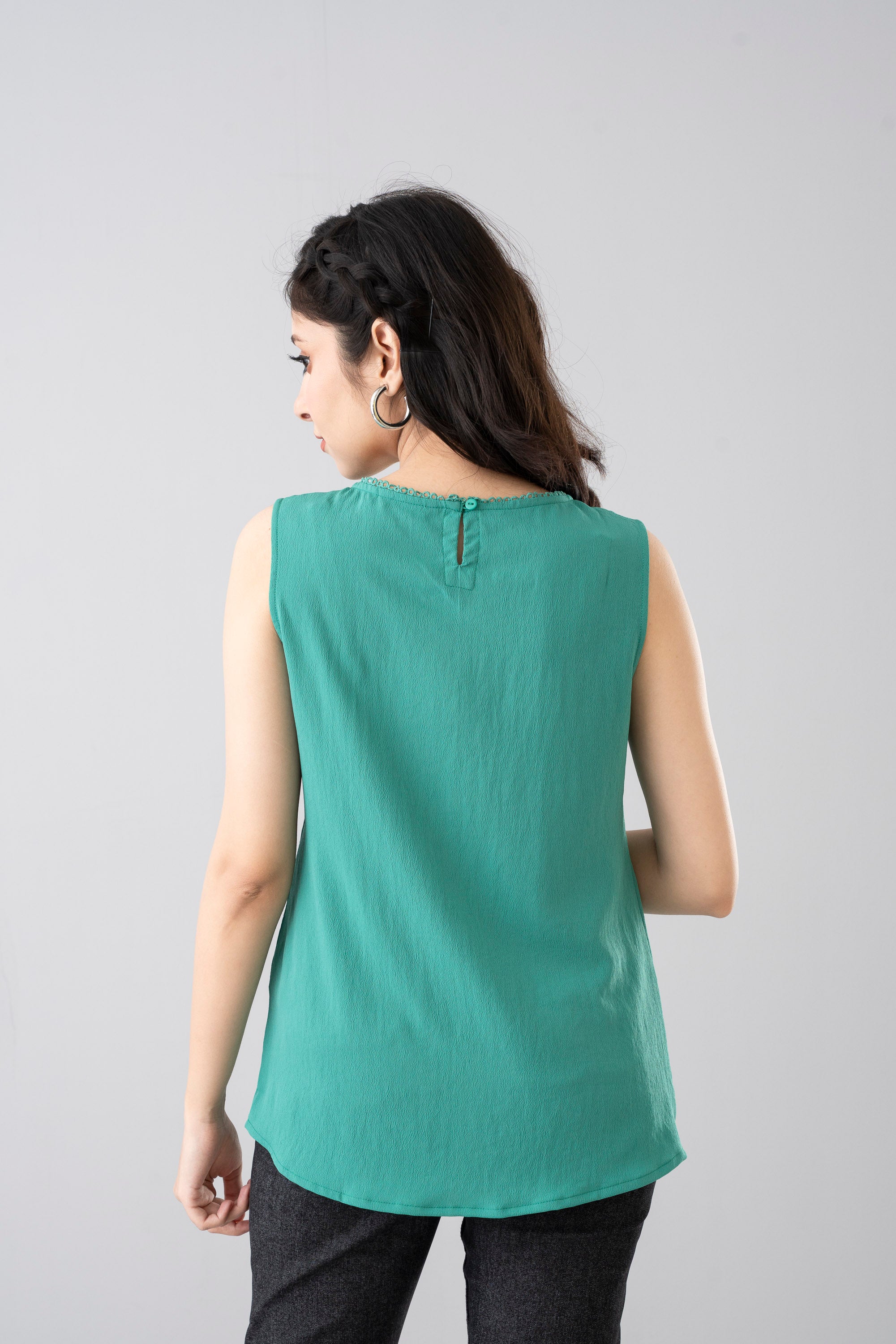 A chic and versatile smart-fit tank top designed for effortless style. Features a delicate loop lace detail at the neckline with a subtle back loop opening for added charm. Made from 100% polyester, offering a sleek straight fit that’s both modern and comfortable.