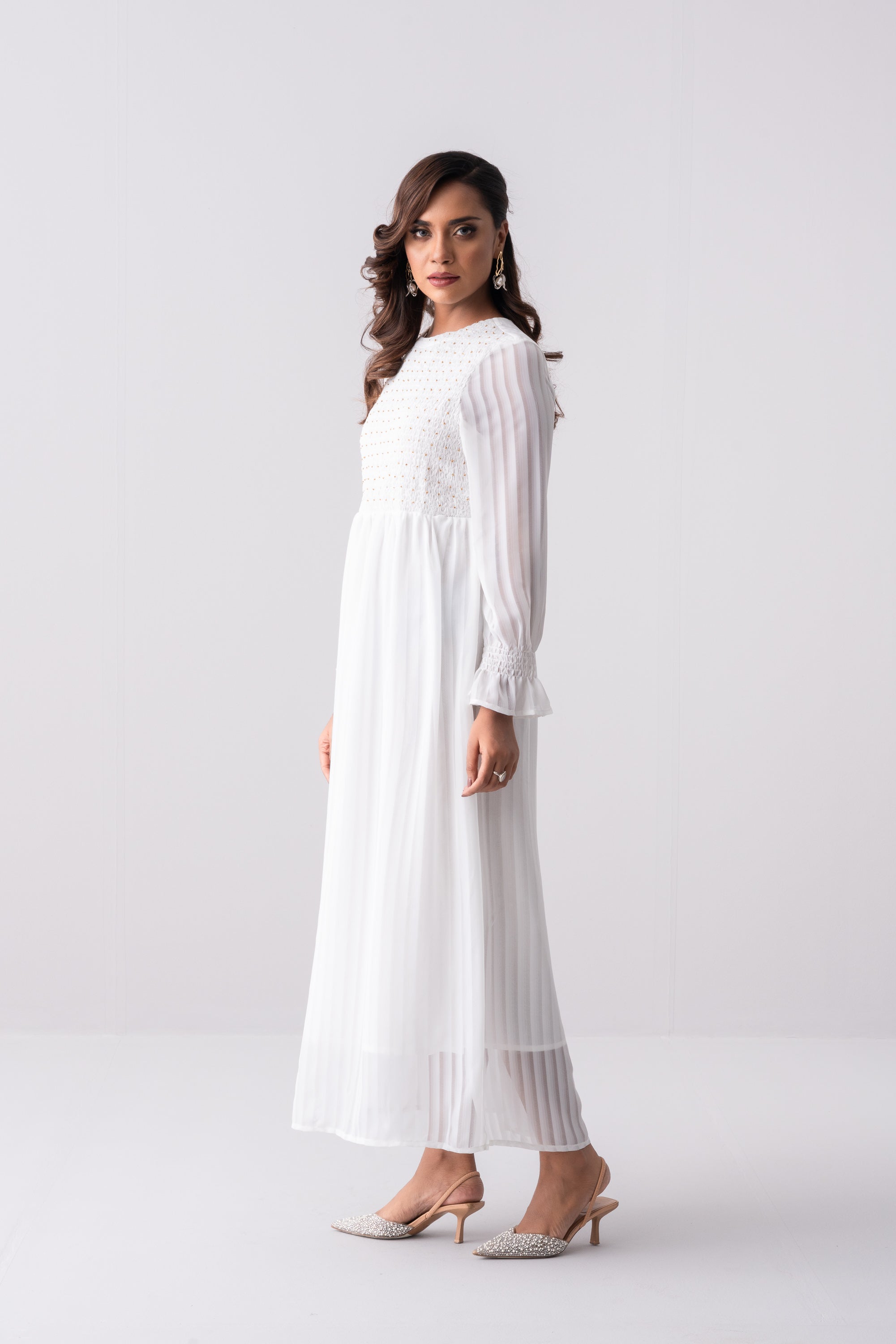 Women's long skirt dress made from jacquard stripe georgette fabric, featuring a round neck and back zipper. Designed with full sleeves and elastic openings, full lining, and smocking with sequence yoke details for an elegant and flattering fit.