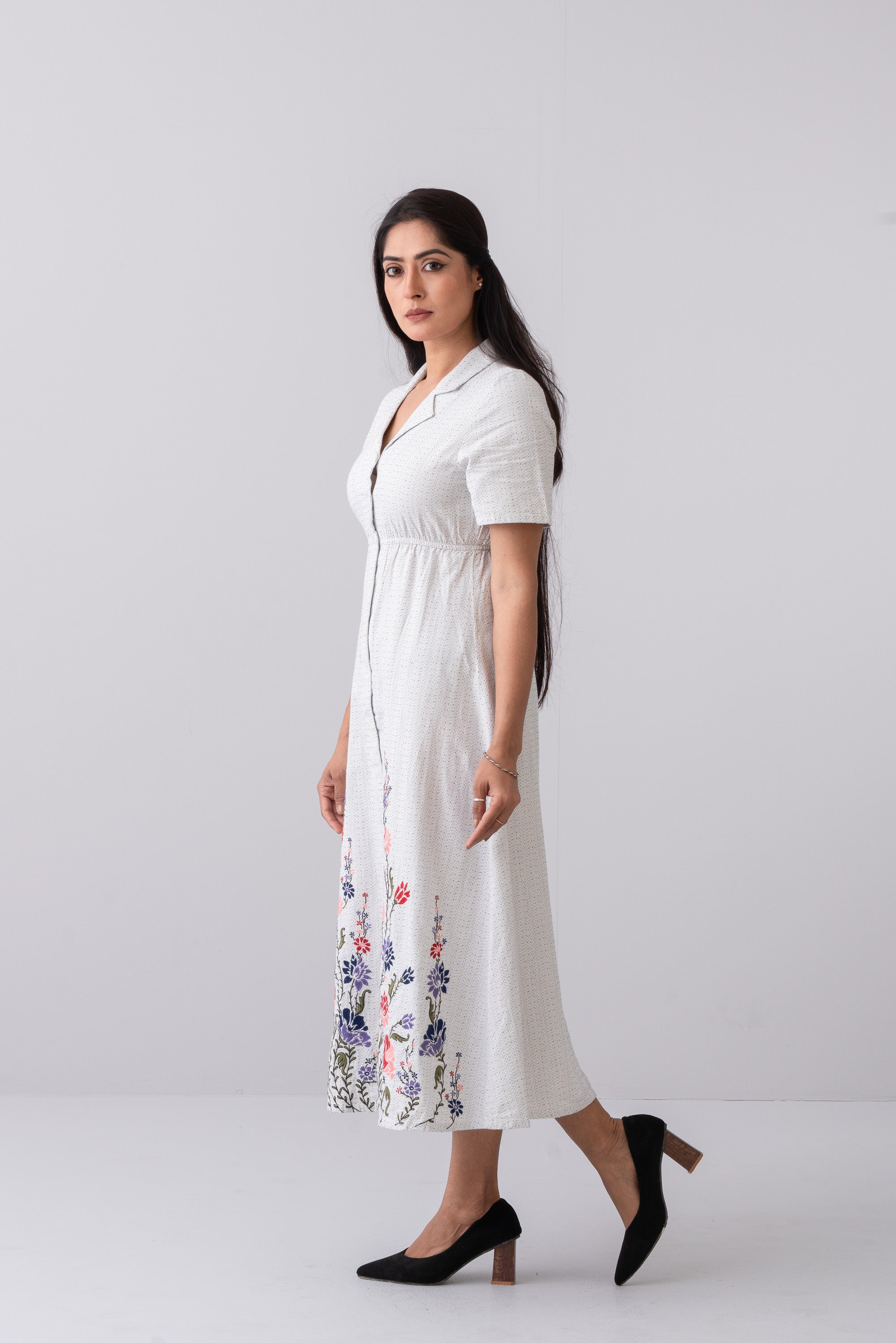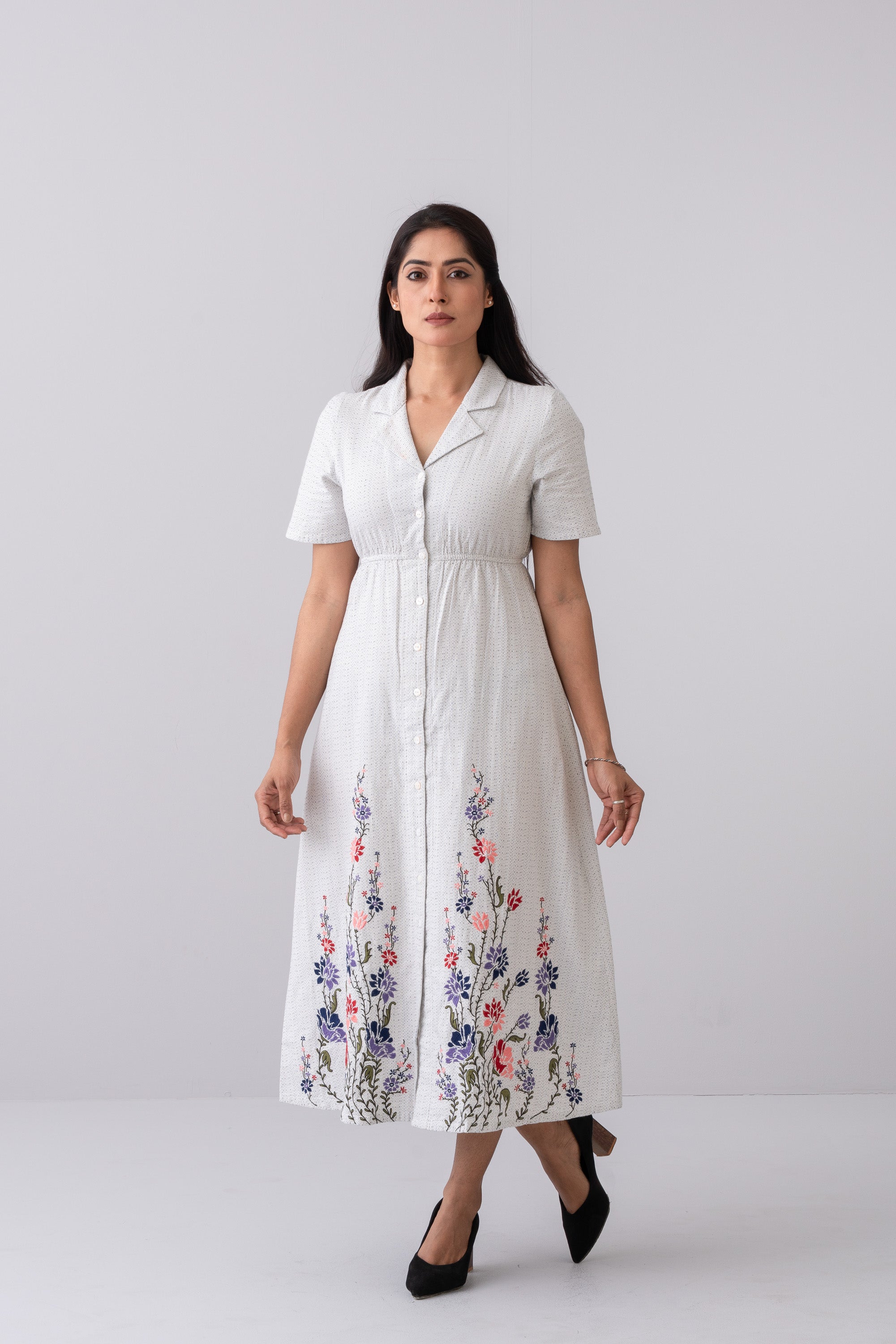 Crafted from cotton stitched stripe fabric, this A-line long shirt dress features a lapel collar, short loose sleeves, and a buttoned placket. An inner elastic waist ensures comfort, while colorful floral embroidery adds a vibrant touch. Made with 100% Cotton.