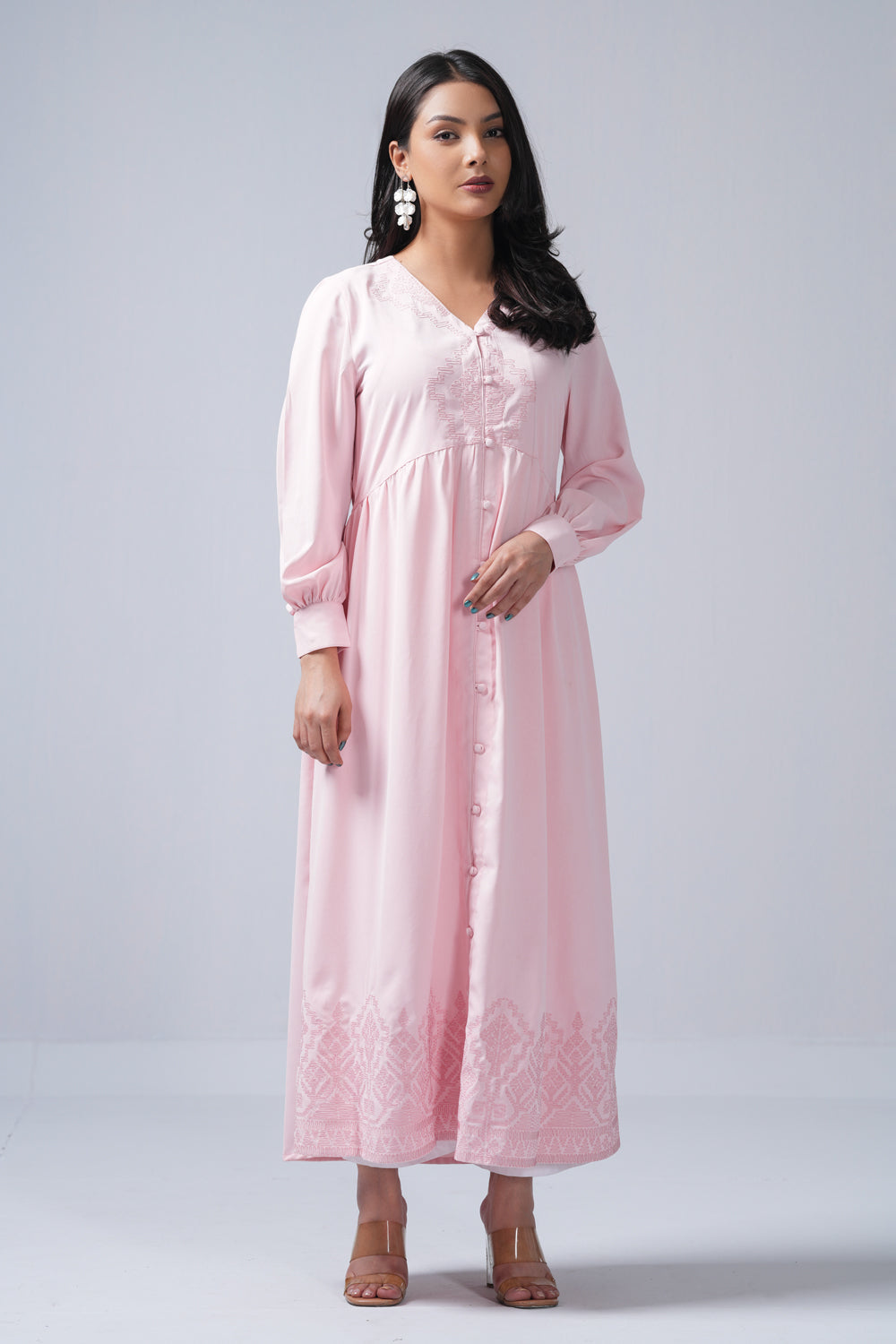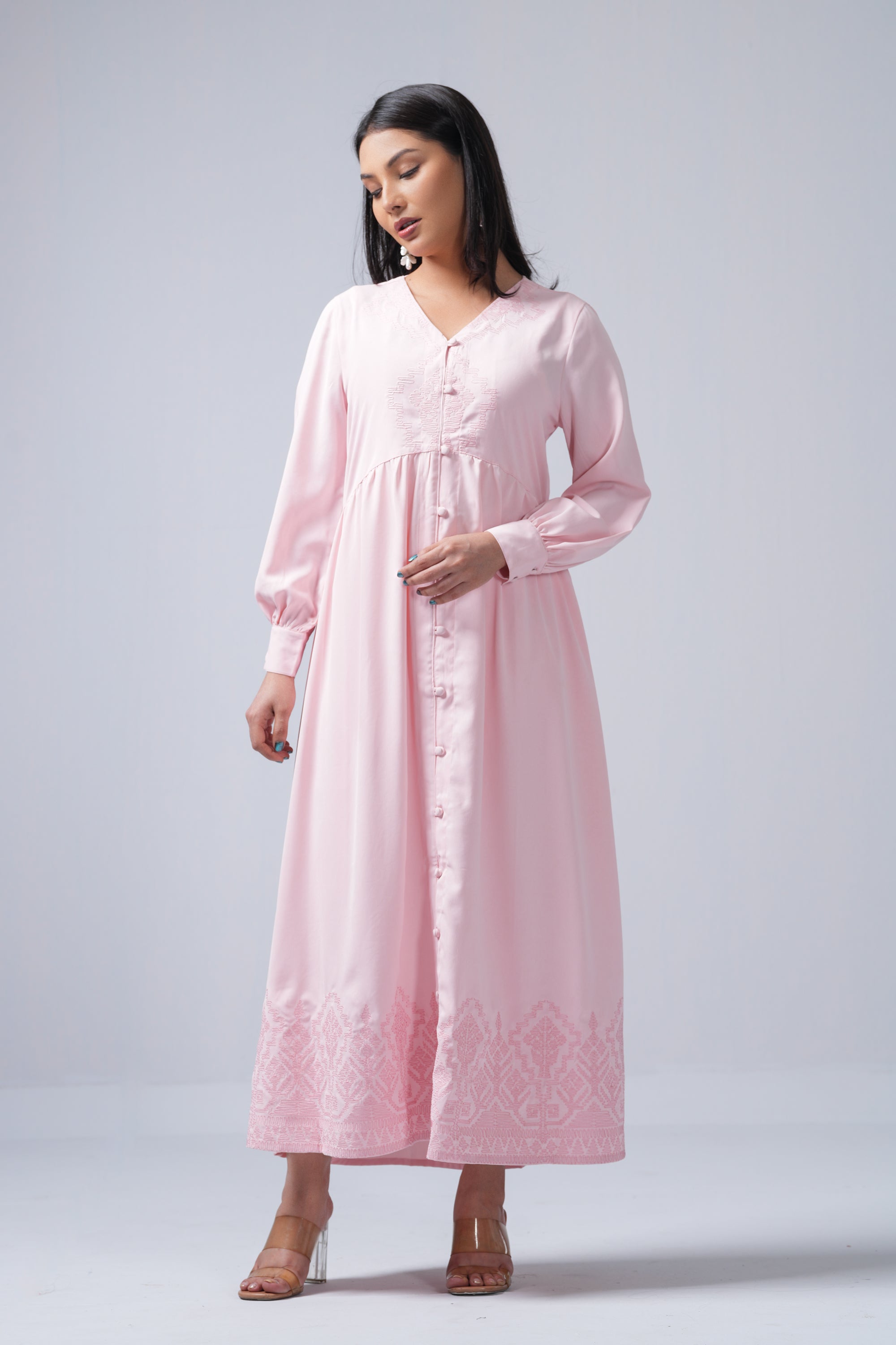 A-line long shirt dress in crepe double georgette, featuring a V-neck, full sleeves with buttoned cuffs and front. Detailed with tone-on-tone geometric line embroidery for a refined, elegant look. Made with 100% Polyester Georgette.