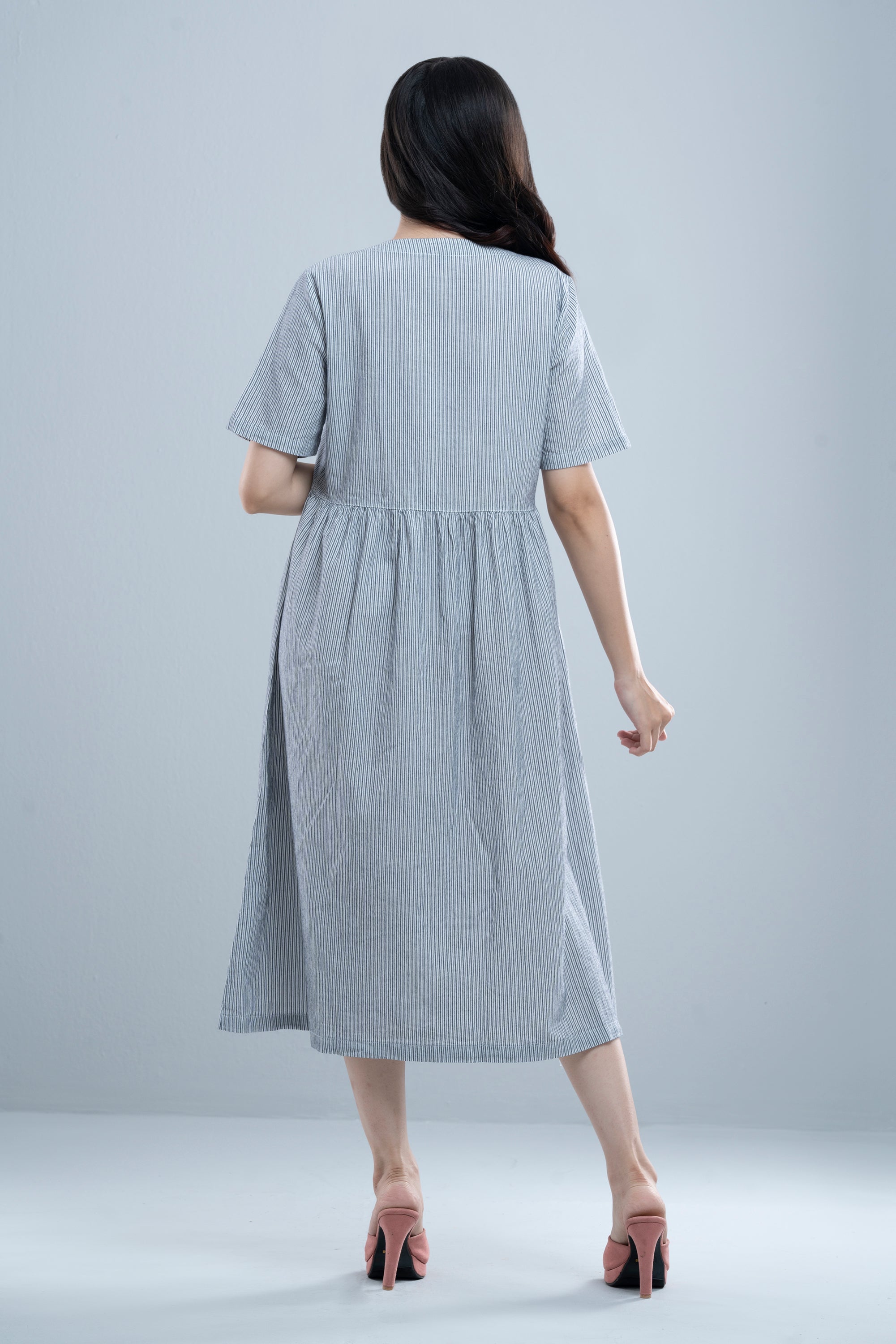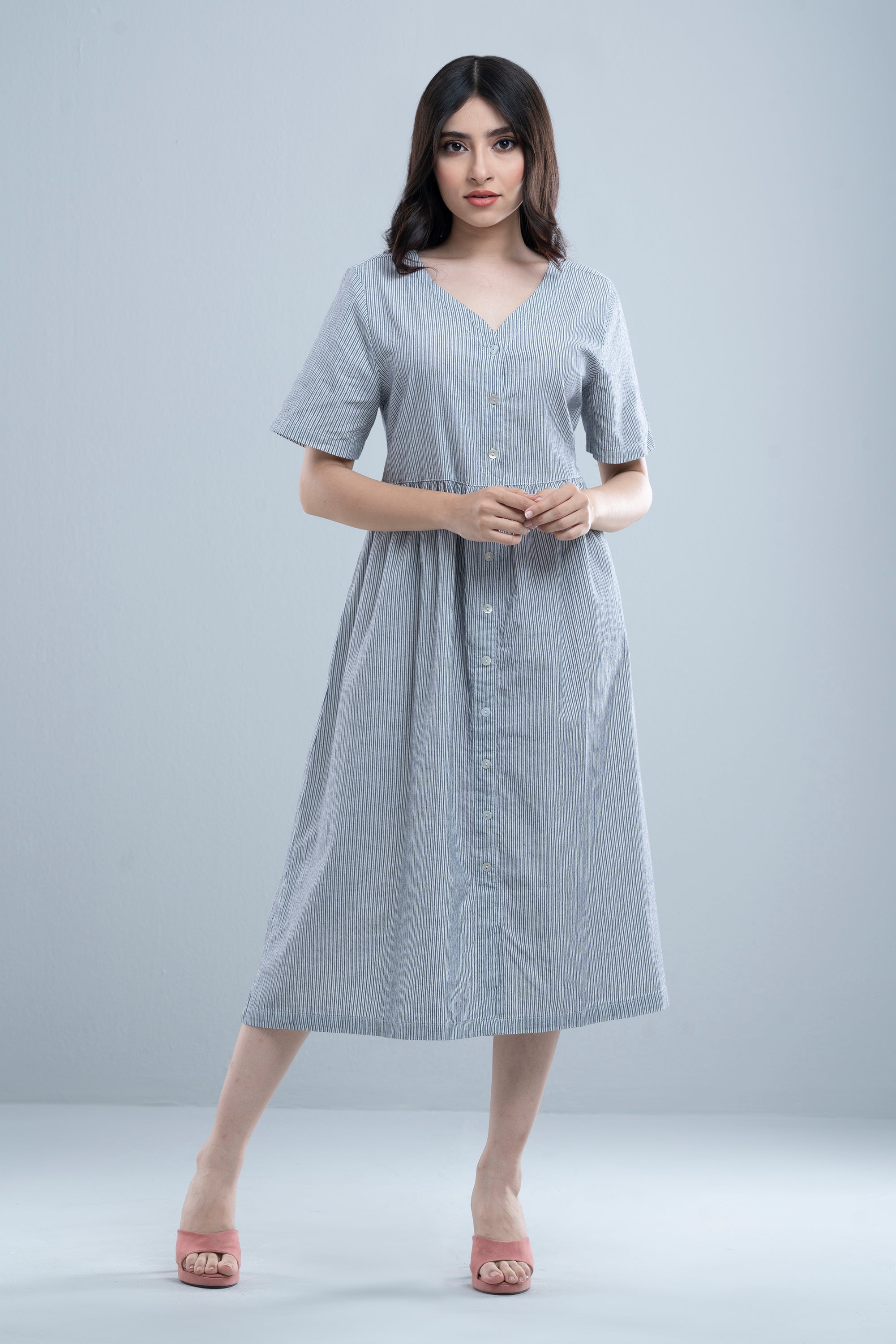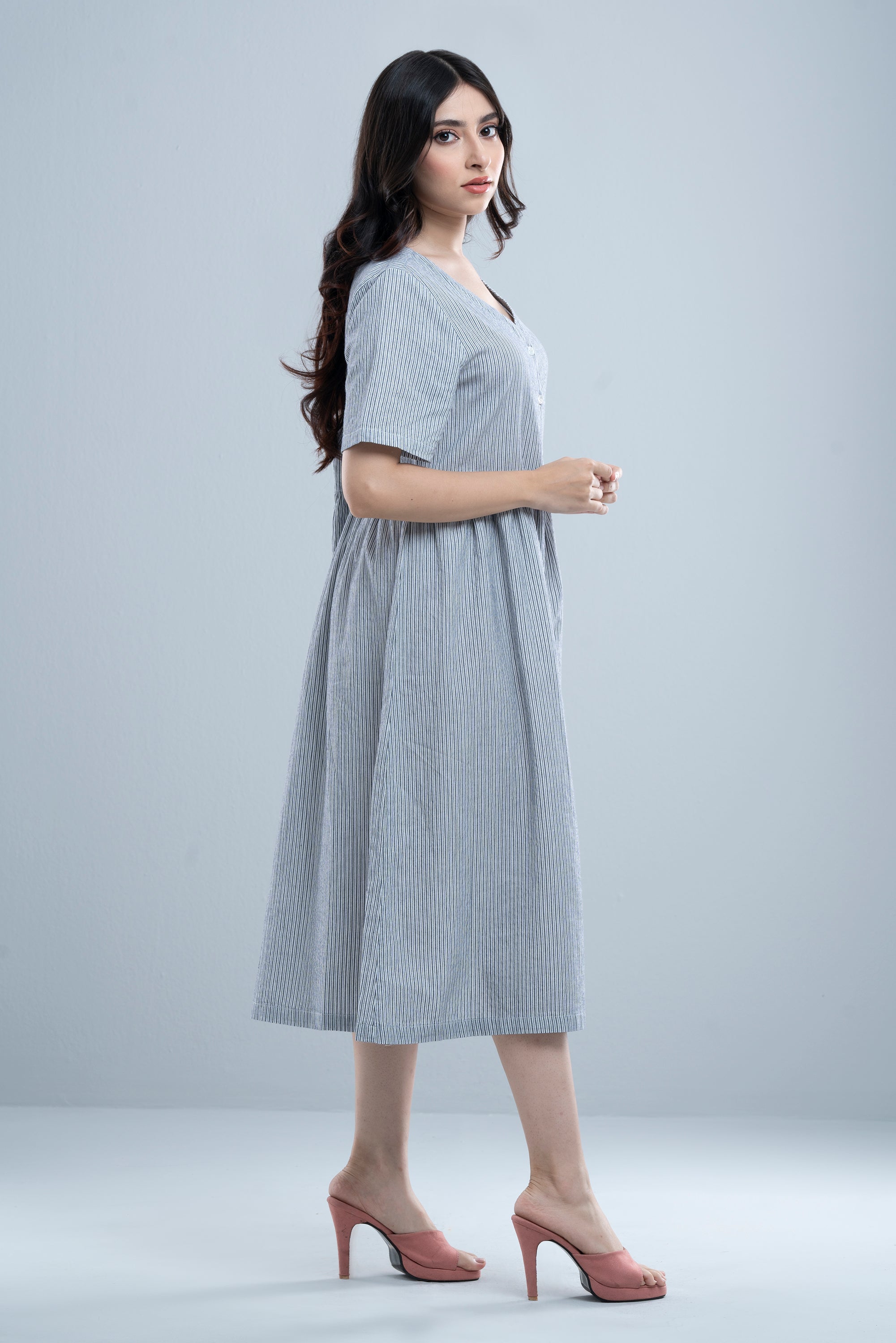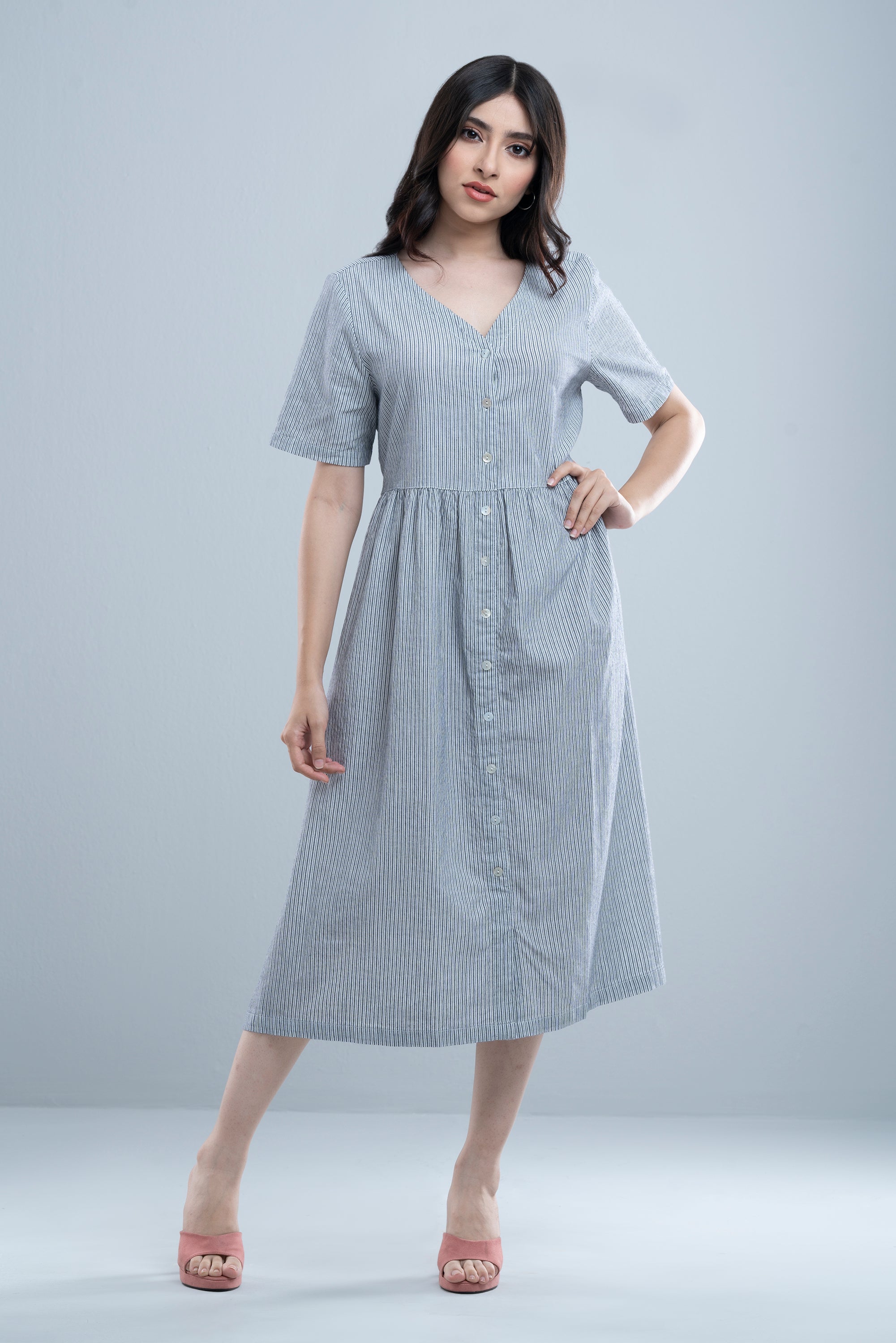 Chic and timeless, this women’s long dress reimagines the classic shirt pattern with modern flair. Featuring crisp vertical stripes that elongate the silhouette while adding a touch of sophistication. A V-neck, button-down front, loose short sleeves, and gathered pleated waist lend a tailored edge, perfectly balanced by the fluid, under-knee-grazing length that allows for graceful movement. Ideal for both casual outings and smart occasions, this versatile piece pairs beautifully with sandals, sneakers, or heels making it a wardrobe essential for all seasons.