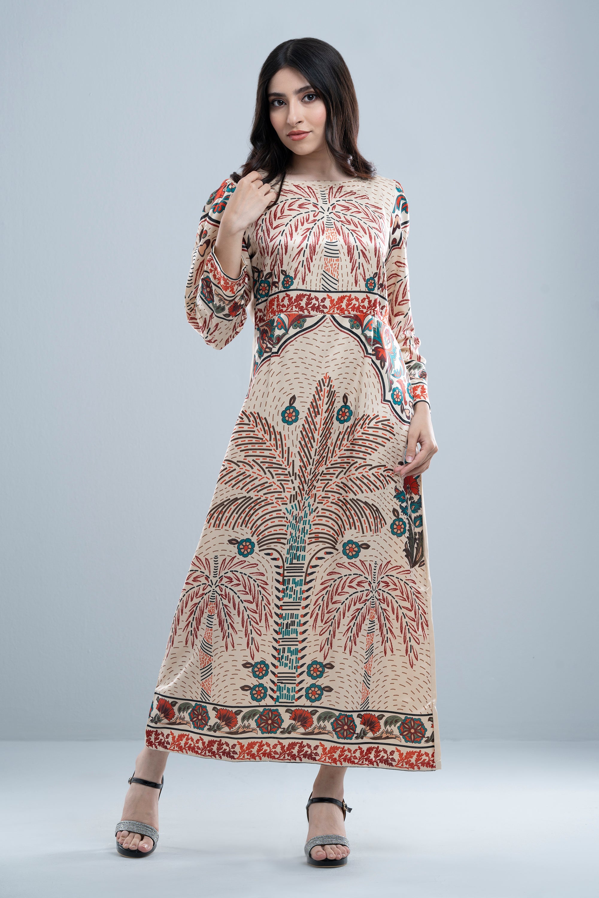 Step into vacation mode with this long dress, adorned in a bold digital tropical print that bursts with lush leaves and exotic blooms. Designed in a flattering A-line silhouette, it skims the body and flares gently for effortless movement. The ankle-length flow, regular fit, boat neck and full sleeves make it perfect for sunny escapes, resort dinners, or city strolls with a touch of island spirit.