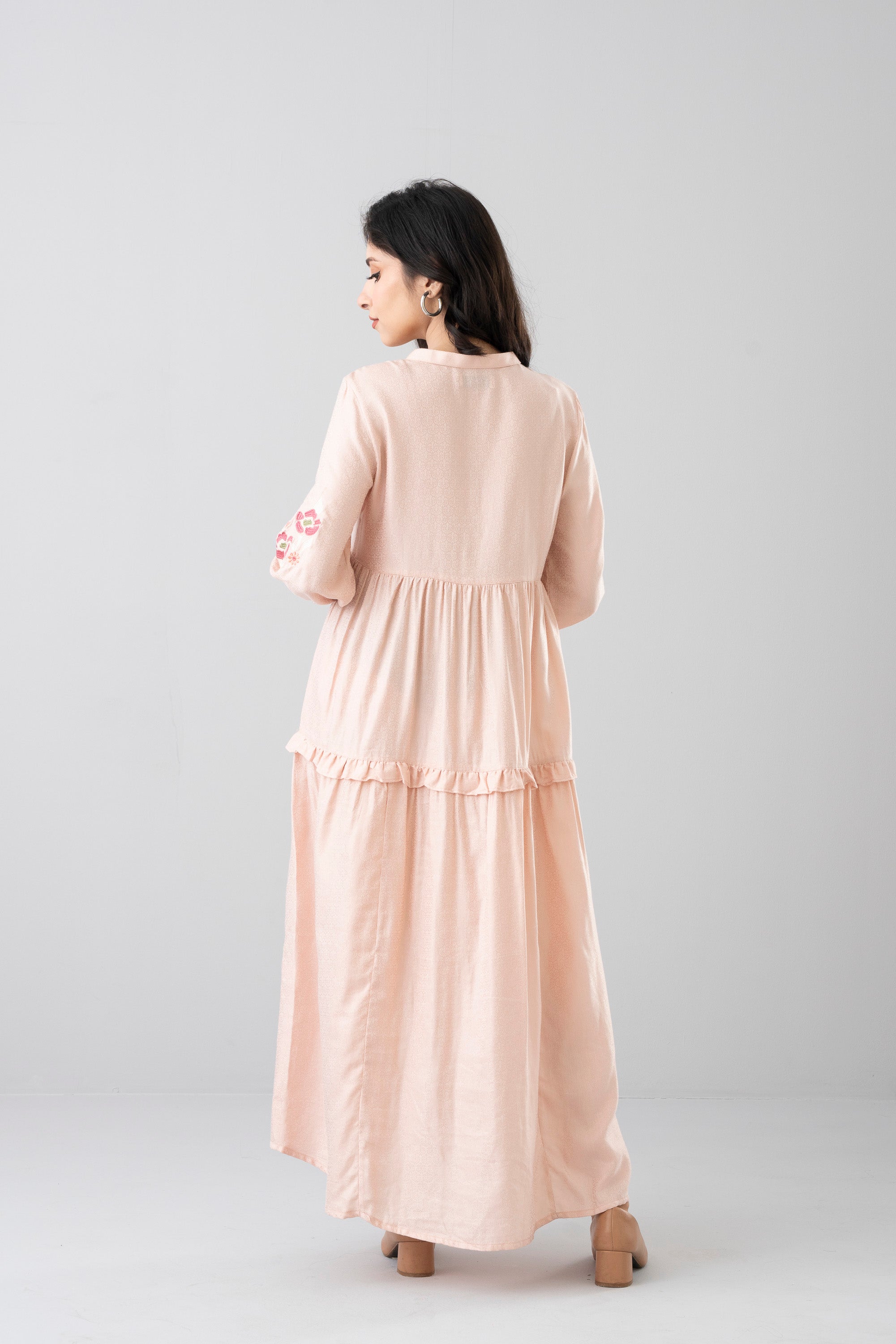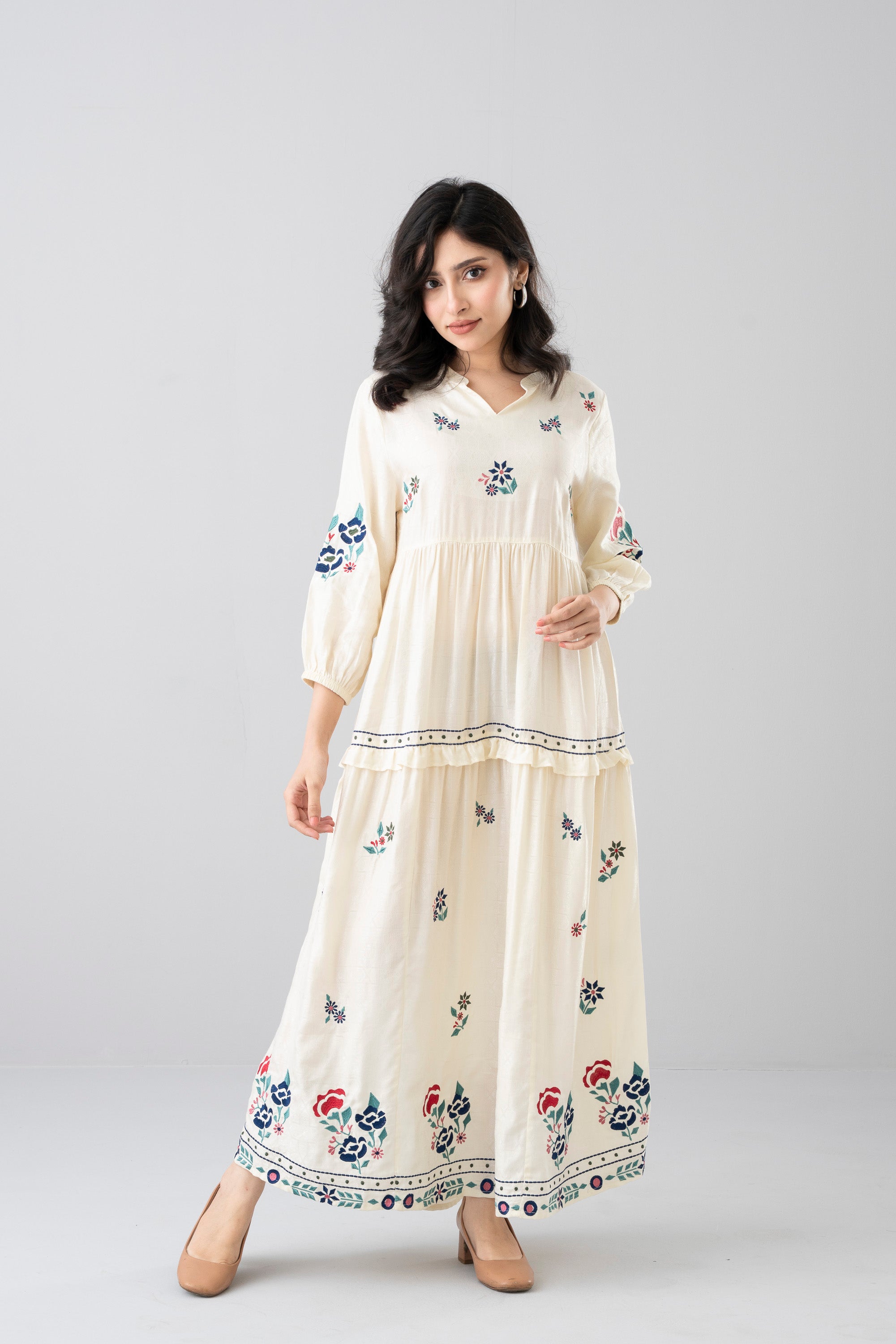 Elegant and timeless, this A-line long dress is crafted from jacquard fabric with a subtle shine, giving it a refined finish. Designed with intricate floral and geometric embroidery, it beautifully blends artistry with sophistication. The V-neckline with band collar adds a graceful touch, while the puff sleeves bring volume and charm. Finished with a layered silhouette, this dress is perfect for both festive and special occasions.