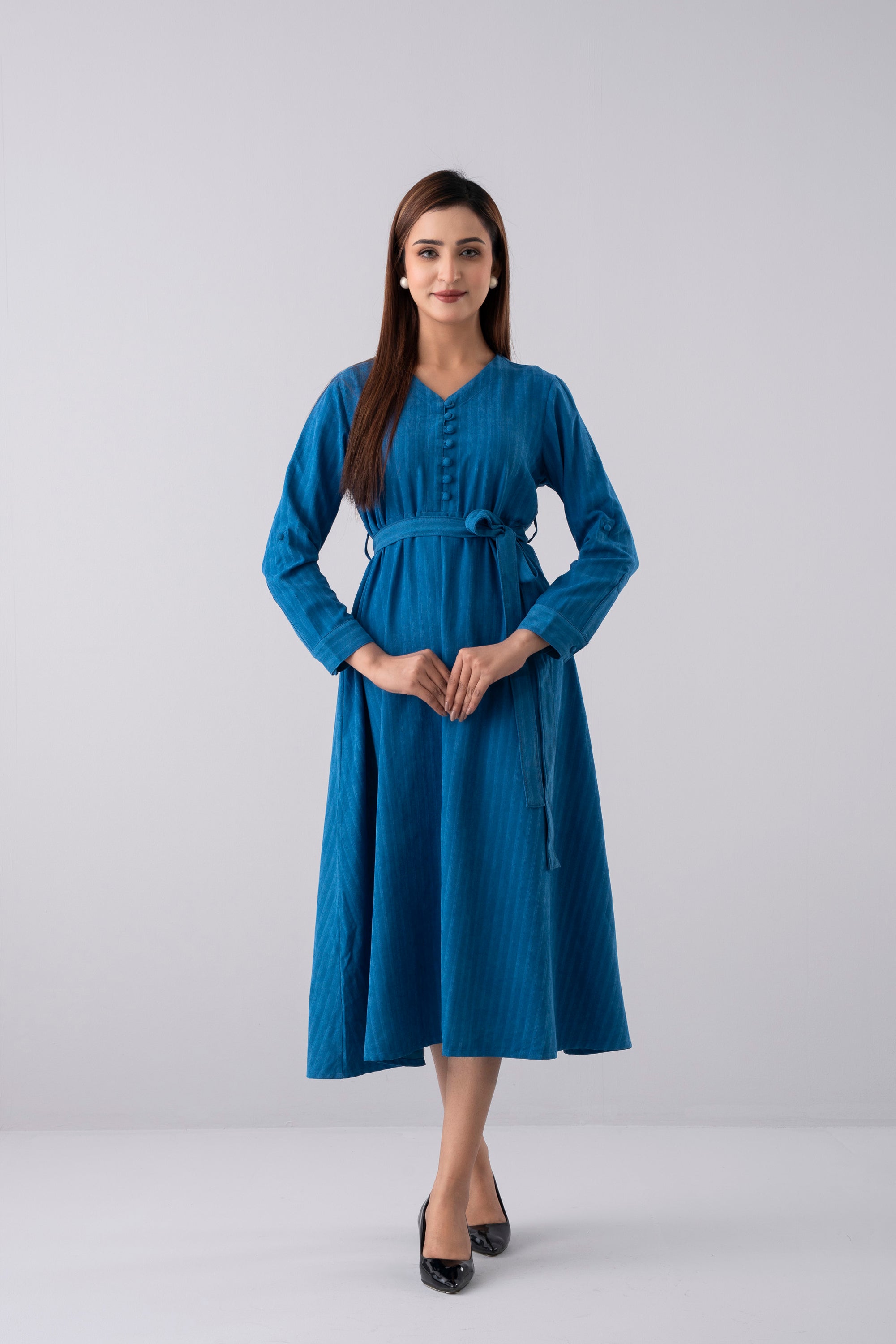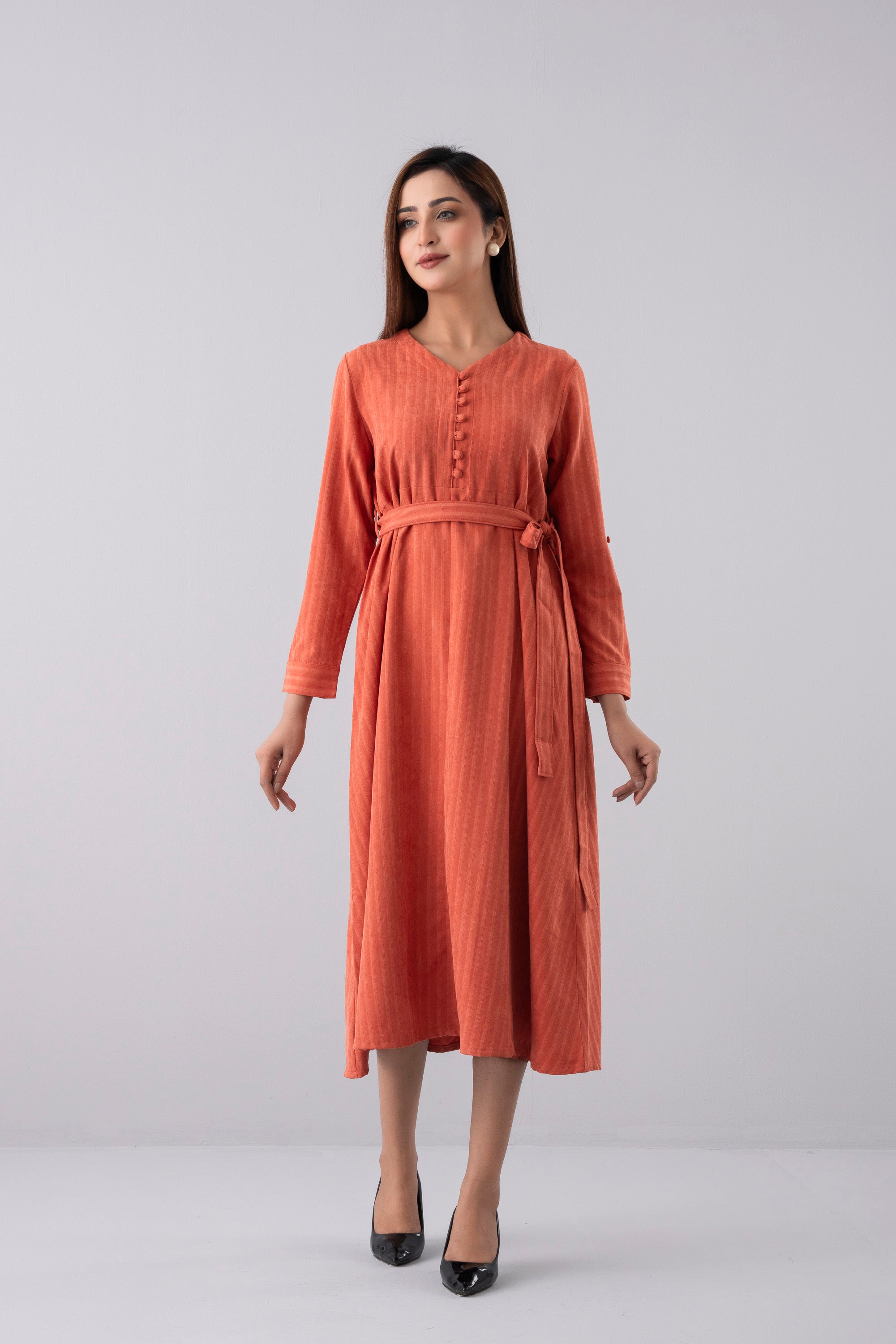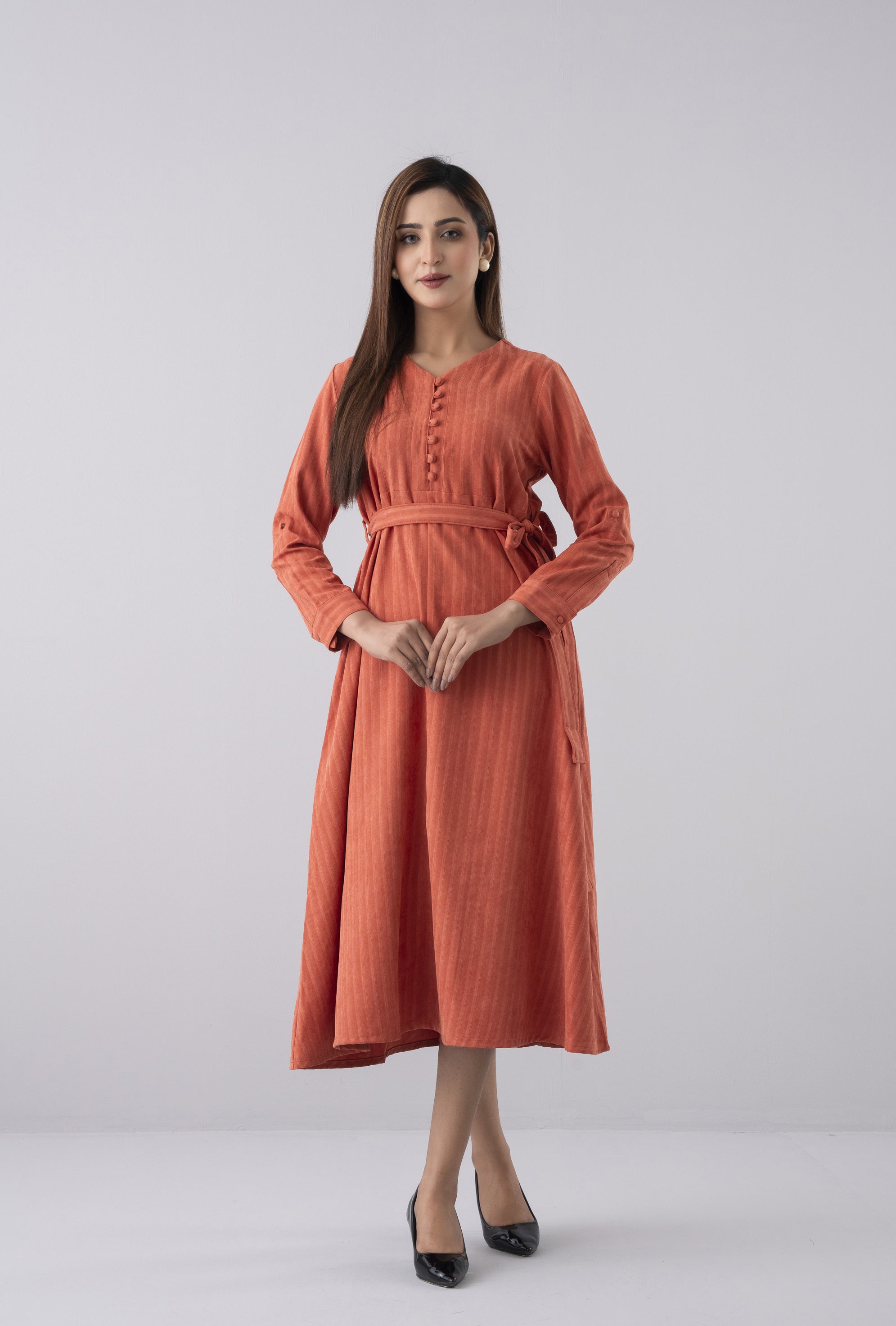 Crafted from super soft 100% polyester corduroy fabric, this long dress offers both comfort and sophistication. Designed with a flattering V-neckline and shirt cuffs with tab detail, it features shell fabric-covered buttons that add a refined touch. The adjustable fabric waist belt enhances the silhouette, making it a perfect blend of modern elegance and effortless style.