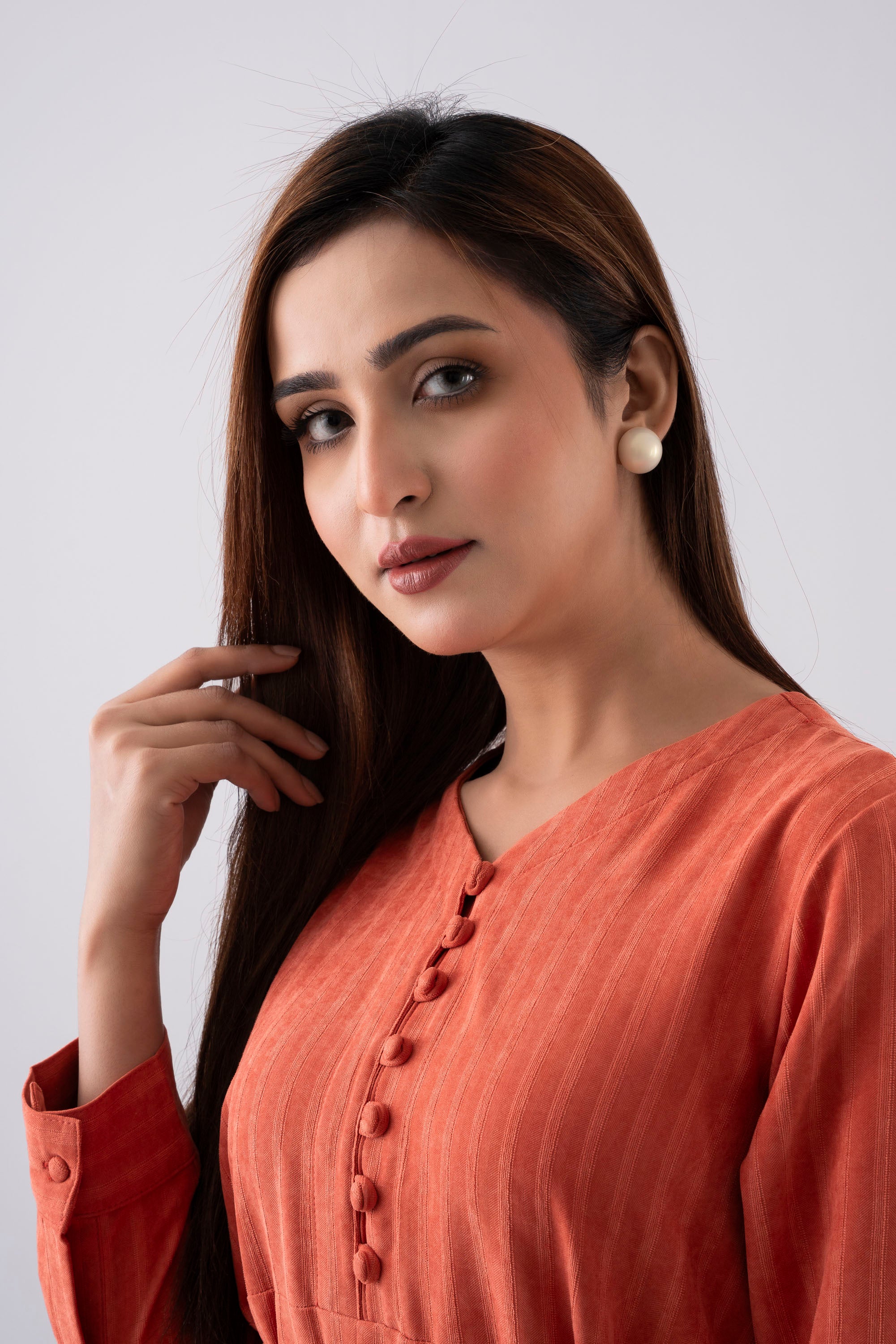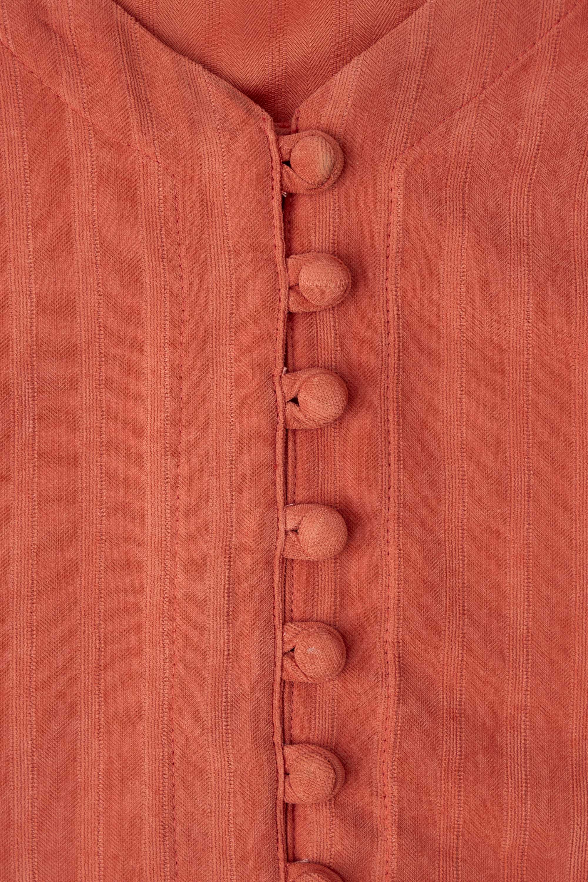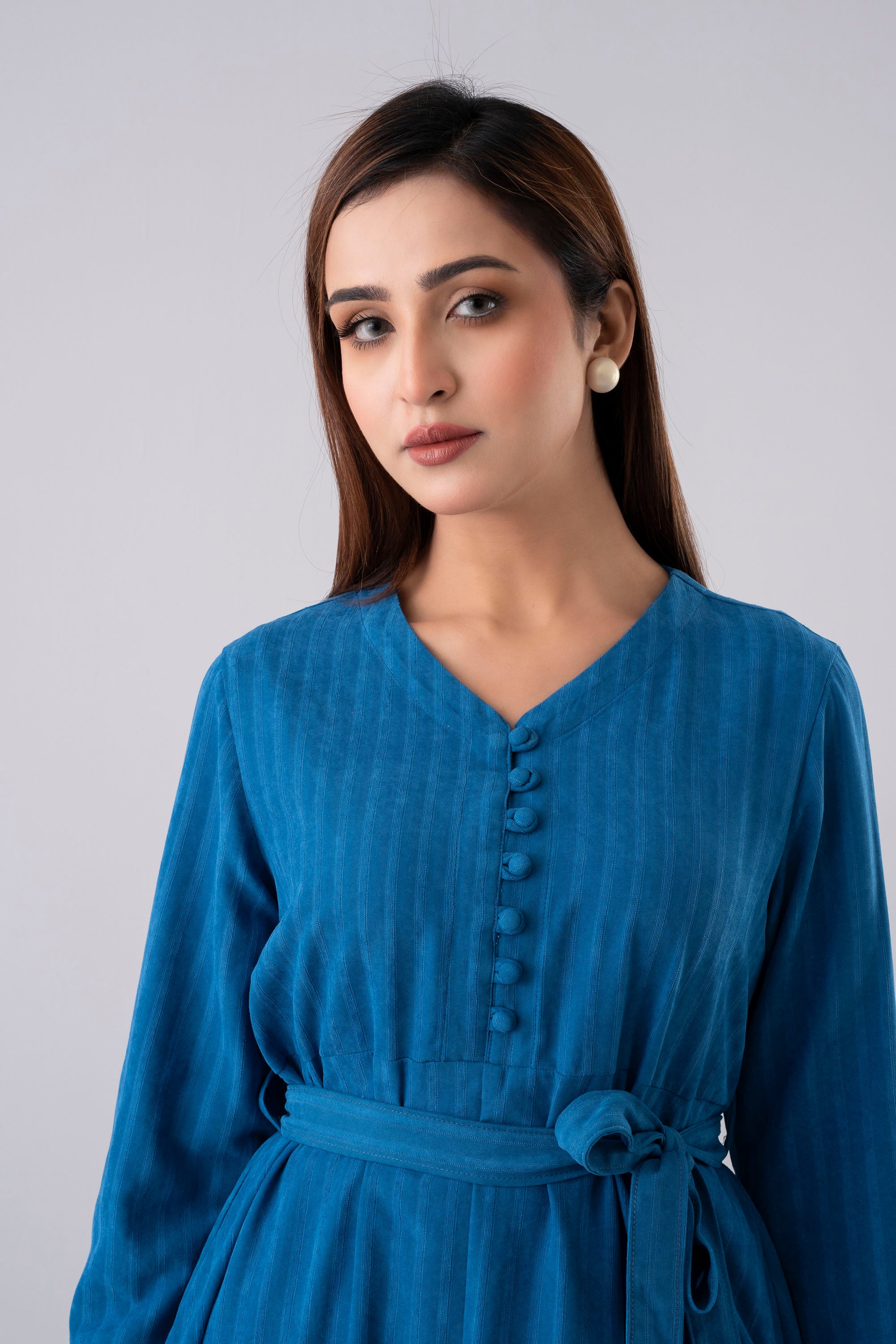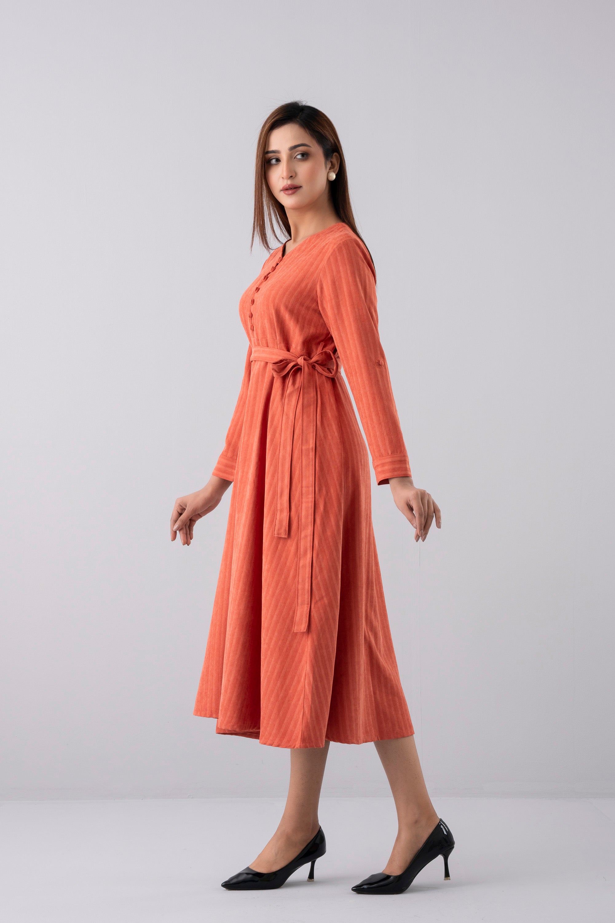 Crafted from super soft 100% polyester corduroy fabric, this long dress offers both comfort and sophistication. Designed with a flattering V-neckline and shirt cuffs with tab detail, it features shell fabric-covered buttons that add a refined touch. The adjustable fabric waist belt enhances the silhouette, making it a perfect blend of modern elegance and effortless style.