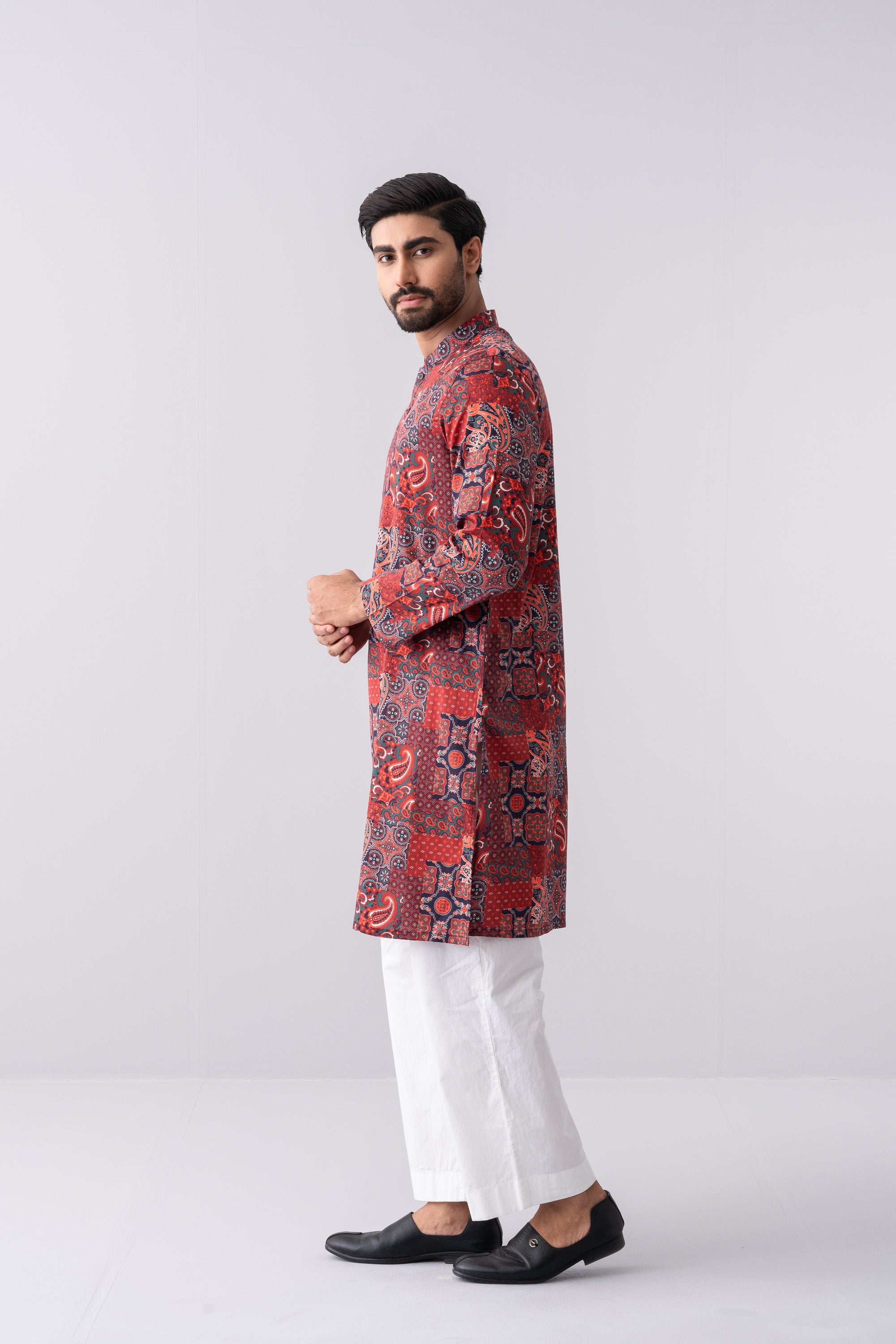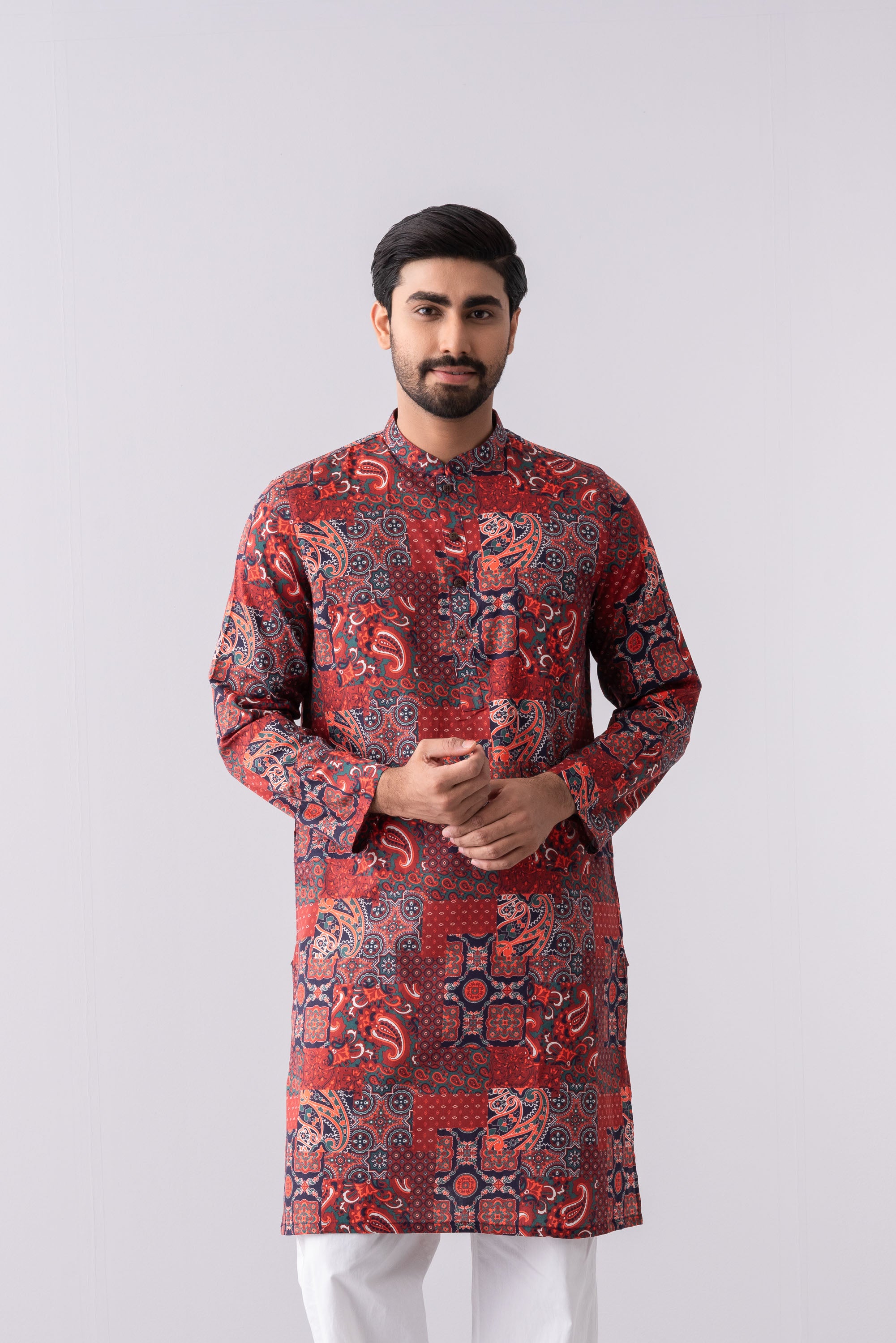 A regular-fit Panjabi crafted from 100% cotton fabric, featuring an elegant allover colorful paisley bandana print with contrast inside band and moon, offers a stylish and comfortable daily wear look. Perfect for a blend of tradition and modern elegance.